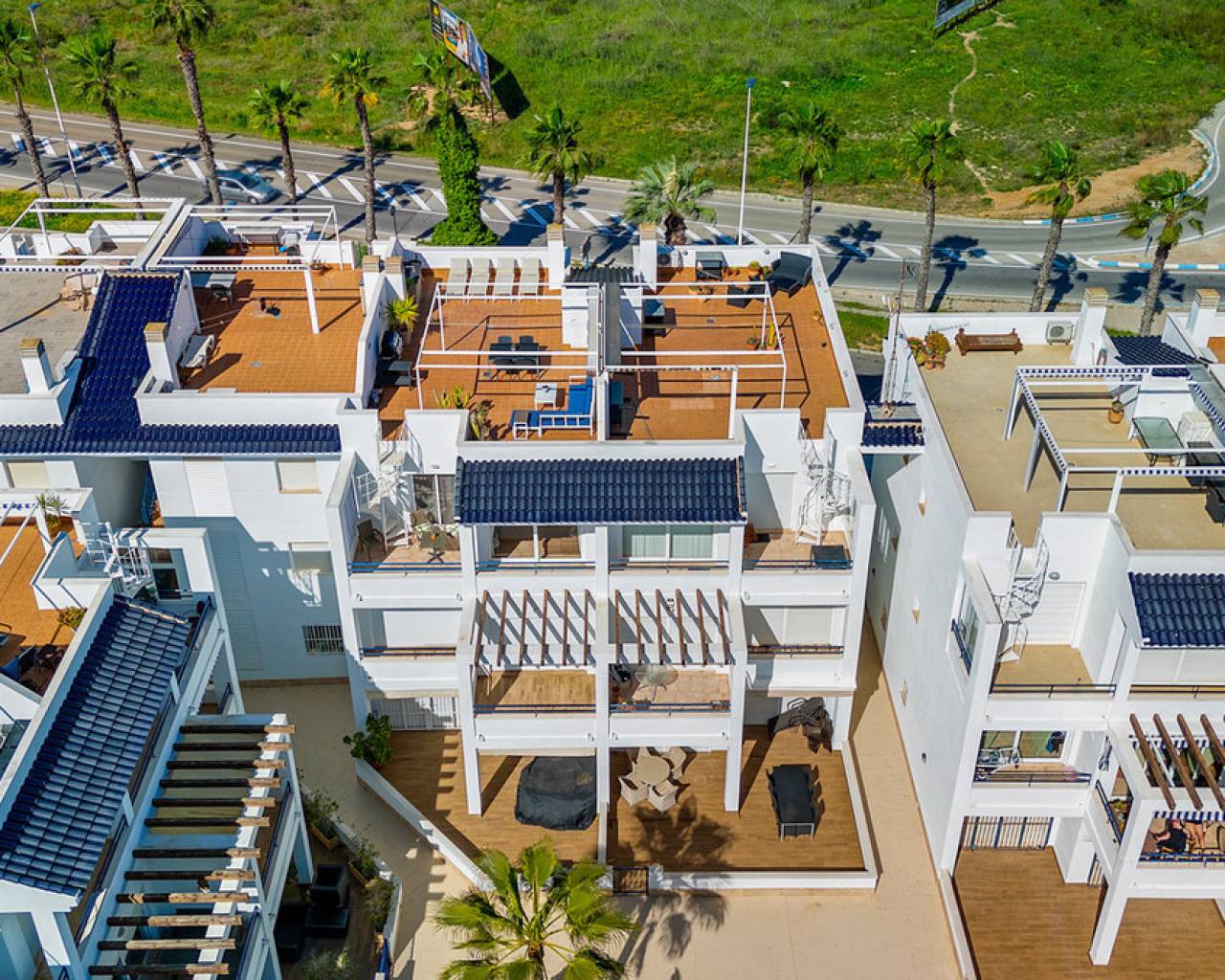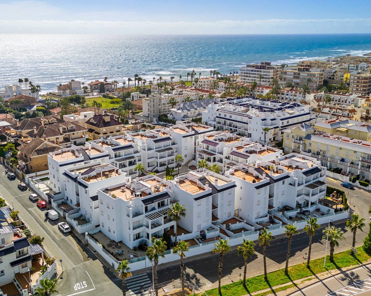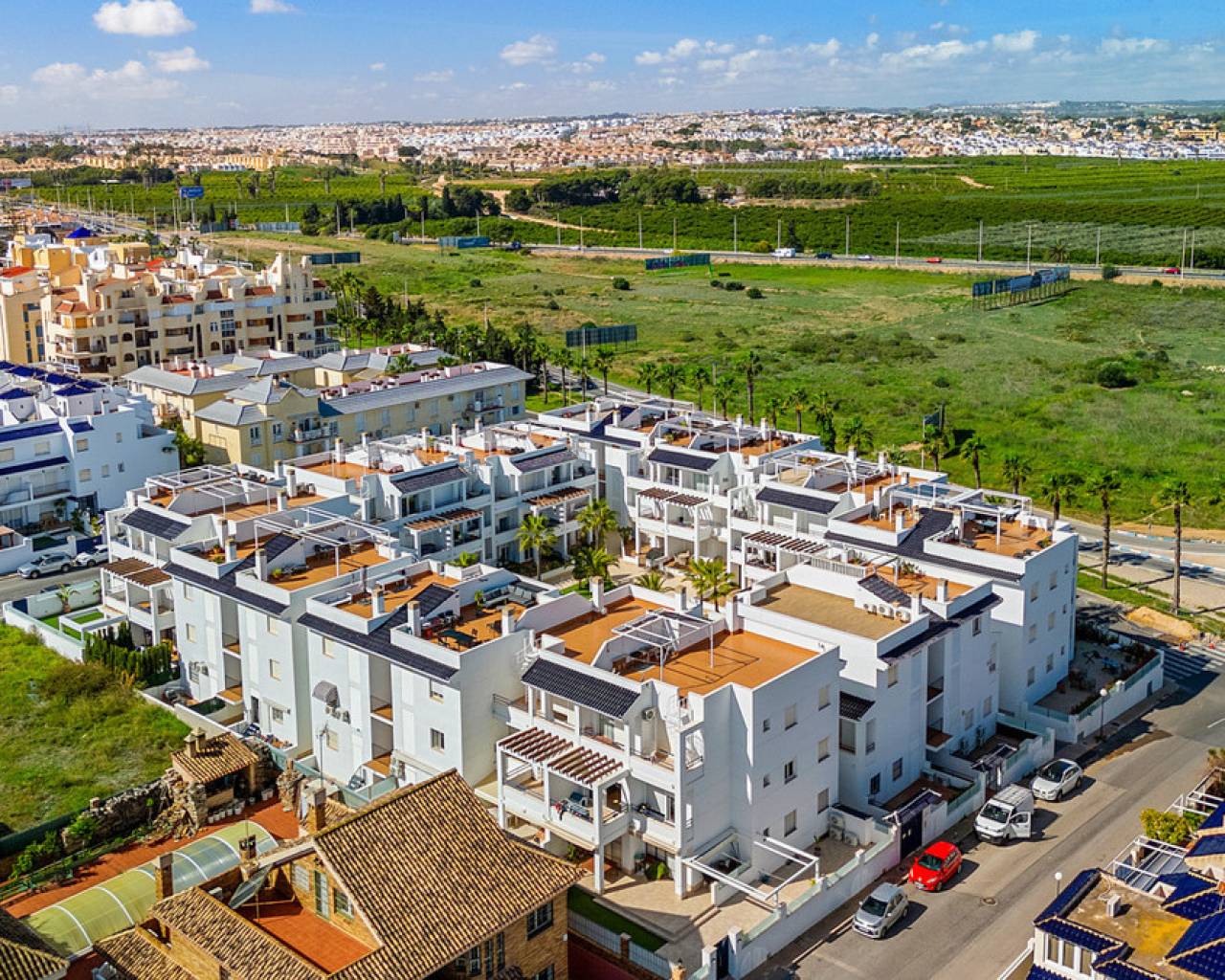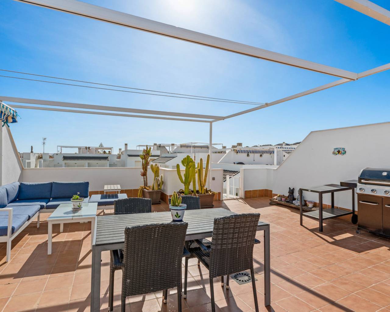 This inviting penthouse apartment from 2005 is located on the 2nd floor in a well-maintained, gated complex with a total of 66 properties. You get a home in very good condition with a well-designed layout, plenty of outdoor space, and a location that ranks among the best in the area. The apartment offers two spacious bedrooms with built-in wardrobes and two bathrooms, one of which is ensuite to the master bedroom. The bathroom in the master bedroom was fully renovated in 2025, giving the property a modern and updated feel. Upon entering the apartment, you are welcomed by an entrance hall with the kitchen located to the right. The kitchen provides ample storage space. From here, there is access to a practical patio area with, among other things, a washing machine. To the left of the entrance, you will find the bright and spacious living room with plenty of space for both a dining area and a lounge. From both the living room and the master bedroom, there is access to a cosy east-facing terrace overlooking the beautiful communal pool area. Here you can enjoy the morning sun in peaceful surroundings, and a side awning provides additional privacy. From the terrace, a staircase leads up to a large and private rooftop terrace, which truly completes the property. Here, the sun can be enjoyed all day, with the option to relax in the shade under the pergola. From the rooftop terrace, there are lovely views of the town and, not least, the characteristic pink salt lake of Torrevieja. There is also a practical storage room on the rooftop. The apartment includes a private parking space in the underground garage. The property is a non-smoking apartment and is generally well maintained. There is air conditioning in both bedrooms as well as in the living room. The air conditioning units in the living room and guest bedroom are approximately 3.5 years old. The communal areas of the complex were renovated, and the entire development was repainted in 2023, giving it a neat and well-kept appearance. The location is excellent. Supermarkets such as Aldi and Lidl are just approximately 260 metres from the property, and there is a bus stop at a similar distance. The sea can be reached within a few minutes' walk – only 300 metres away. In addition, there is a short distance to both Torrevieja town centre and Punta Prima, offering easy access to restaurants, cafés, and local amenities. Alicante Airport is approximately 46 km away, and there is easy access to the main road N332. All in all, this is a wonderful penthouse offering comfort, views, and a highly attractive location – ideal as both a holiday home and a permanent residence.