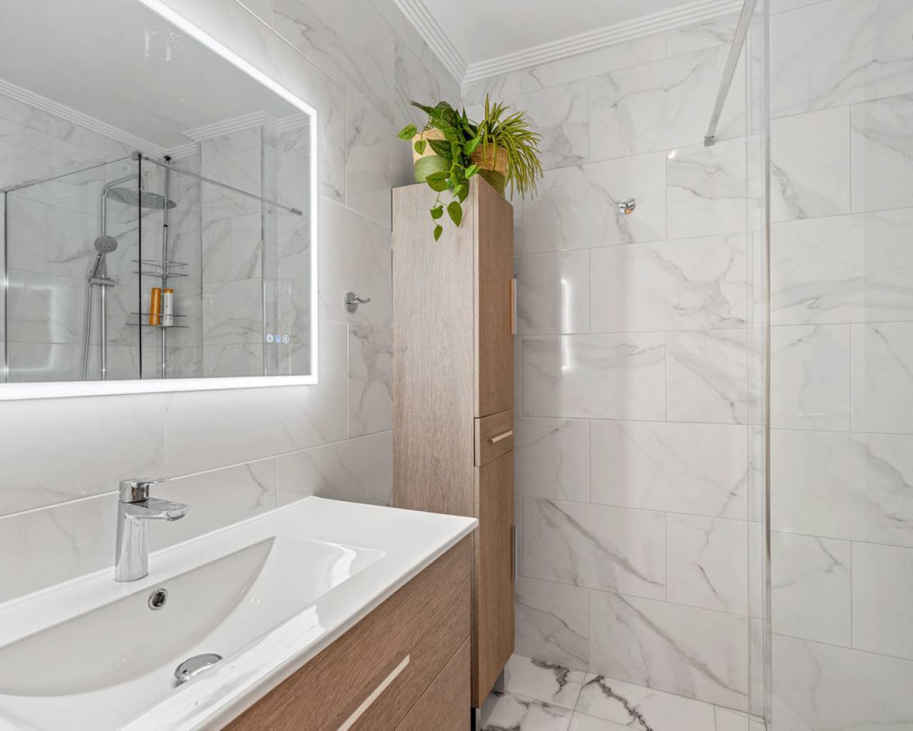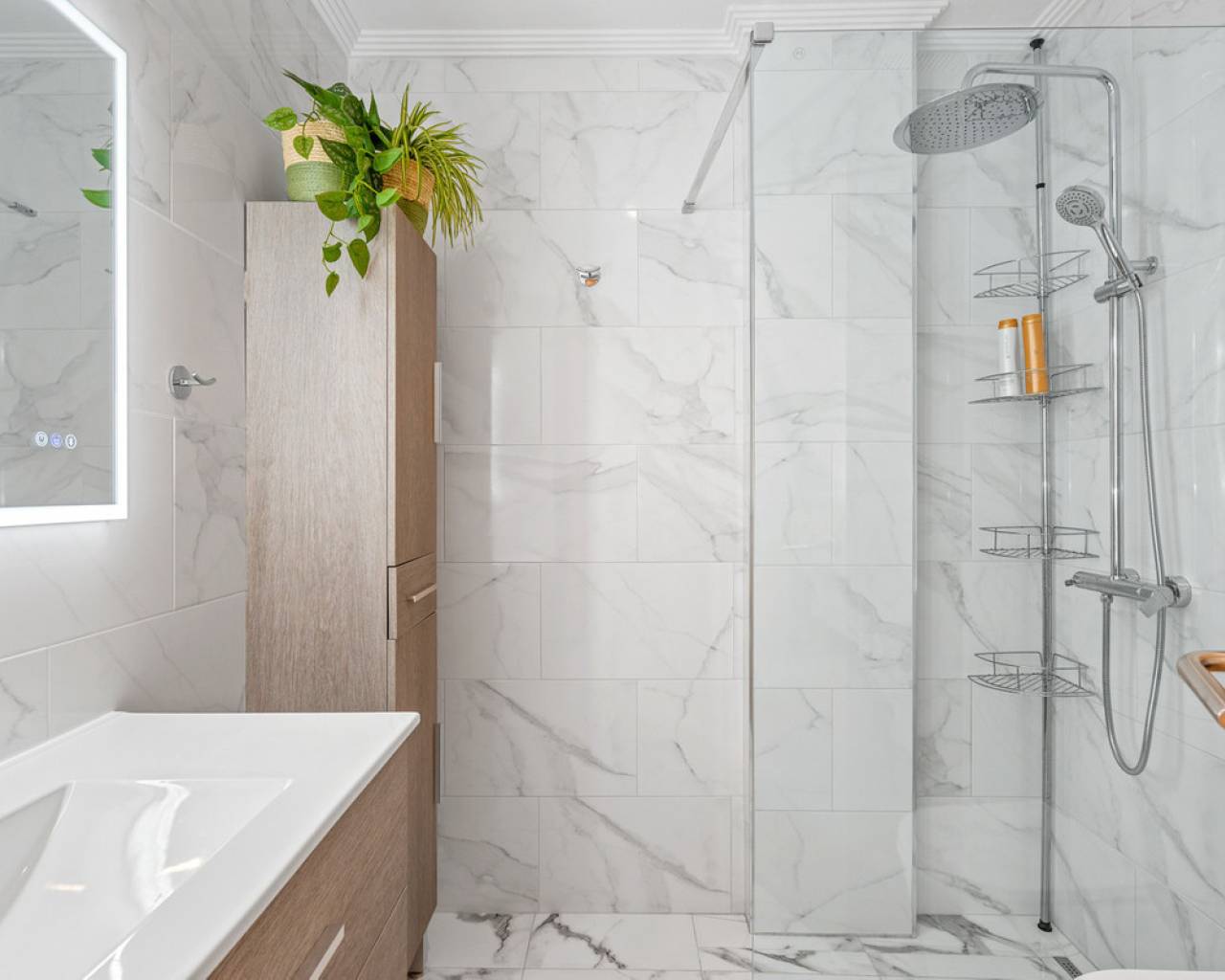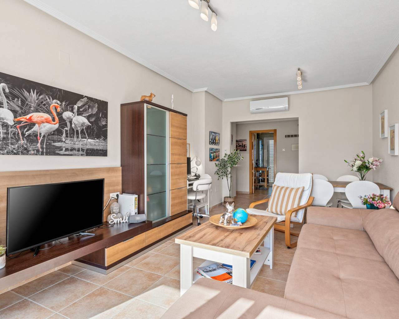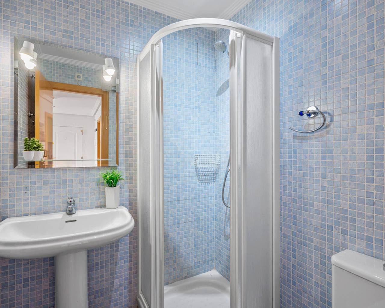 This inviting penthouse apartment from 2005 is located on the 2nd floor in a well-maintained, gated complex with a total of 66 properties. You get a home in very good condition with a well-designed layout, plenty of outdoor space, and a location that ranks among the best in the area. The apartment offers two spacious bedrooms with built-in wardrobes and two bathrooms, one of which is ensuite to the master bedroom. The bathroom in the master bedroom was fully renovated in 2025, giving the property a modern and updated feel. Upon entering the apartment, you are welcomed by an entrance hall with the kitchen located to the right. The kitchen provides ample storage space. From here, there is access to a practical patio area with, among other things, a washing machine. To the left of the entrance, you will find the bright and spacious living room with plenty of space for both a dining area and a lounge. From both the living room and the master bedroom, there is access to a cosy east-facing terrace overlooking the beautiful communal pool area. Here you can enjoy the morning sun in peaceful surroundings, and a side awning provides additional privacy. From the terrace, a staircase leads up to a large and private rooftop terrace, which truly completes the property. Here, the sun can be enjoyed all day, with the option to relax in the shade under the pergola. From the rooftop terrace, there are lovely views of the town and, not least, the characteristic pink salt lake of Torrevieja. There is also a practical storage room on the rooftop. The apartment includes a private parking space in the underground garage. The property is a non-smoking apartment and is generally well maintained. There is air conditioning in both bedrooms as well as in the living room. The air conditioning units in the living room and guest bedroom are approximately 3.5 years old. The communal areas of the complex were renovated, and the entire development was repainted in 2023, giving it a neat and well-kept appearance. The location is excellent. Supermarkets such as Aldi and Lidl are just approximately 260 metres from the property, and there is a bus stop at a similar distance. The sea can be reached within a few minutes' walk – only 300 metres away. In addition, there is a short distance to both Torrevieja town centre and Punta Prima, offering easy access to restaurants, cafés, and local amenities. Alicante Airport is approximately 46 km away, and there is easy access to the main road N332. All in all, this is a wonderful penthouse offering comfort, views, and a highly attractive location – ideal as both a holiday home and a permanent residence.
