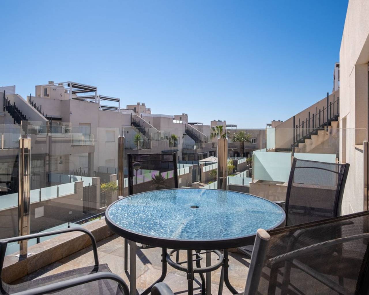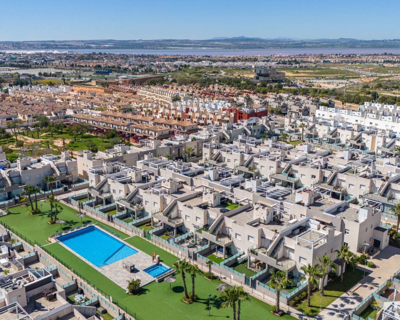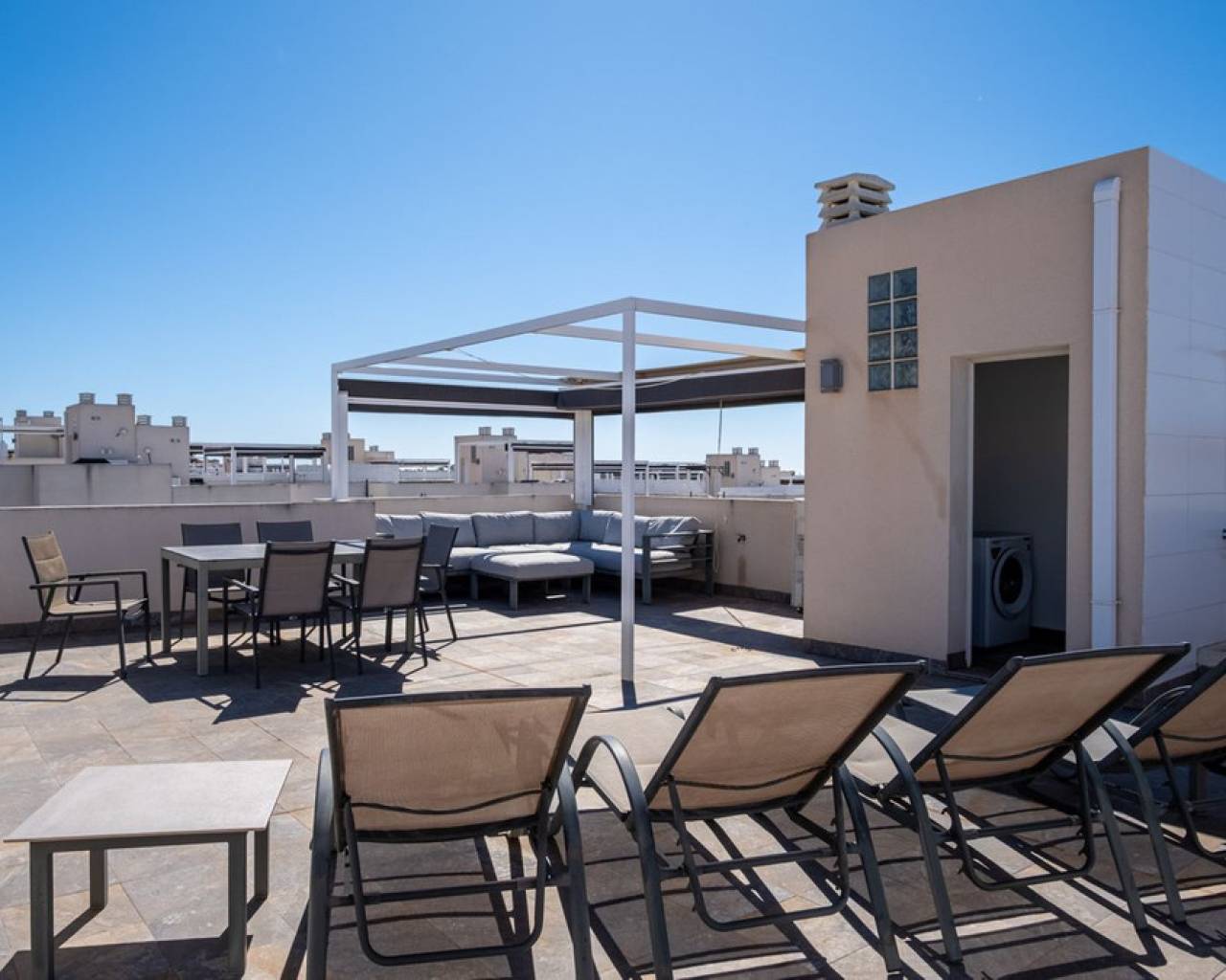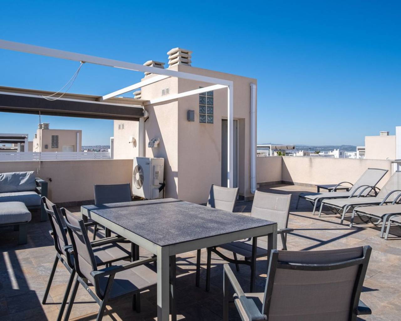 Exclusive Home with Spectacular Rooftop Terrace in Sought-After Solpark – Aguas Nuevas, Torrevieja Welcome to this stylish and modern apartment in impeccable condition, located in the highly sought-after area of Solpark in Aguas Nuevas – one of Torrevieja's most popular and well-maintained residential communities. Here you will find a home where design, comfort, and Mediterranean living come together in perfect harmony. The property features two elegant bedrooms and two tastefully designed bathrooms, created for both comfort and functionality. Bright materials, generous natural light, and a well-thought-out layout create an airy and exclusive atmosphere throughout the home. Start your day with a cup of coffee on the balcony in the morning sun, while enjoying the peaceful and beautifully maintained surroundings. The true highlight of this home is the impressive private rooftop terrace of 65 sqm – a fantastic oasis where you can enjoy the sun from morning until evening. There is plenty of space for lounge furniture, a dining area, and social gatherings under the Spanish sky. Perfect for sunset dinners, relaxing days in the sun, or memorable evenings with family and friends. The apartment is equipped with air conditioning throughout, ensuring a comfortable indoor climate all year round. Solpark is a modern and exclusive residential complex, known for its high standards, beautiful pool areas, and tranquil atmosphere. At the same time, you are just a short distance from Torrevieja's beaches, restaurants, shopping, golf courses, and all essential amenities, making this an ideal home both for permanent living and for holidays. This is a property for those seeking something truly special – an elegant and carefree lifestyle on the Costa Blanca, where every day is defined by sunshine, comfort, and quality of life. A unique opportunity to acquire an exclusive home in one of the area's most desirable residences
