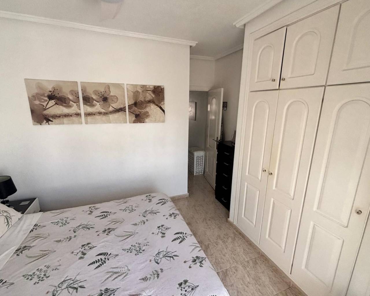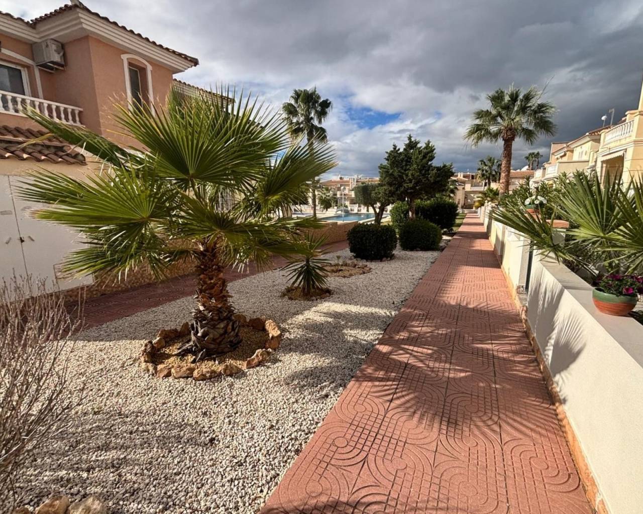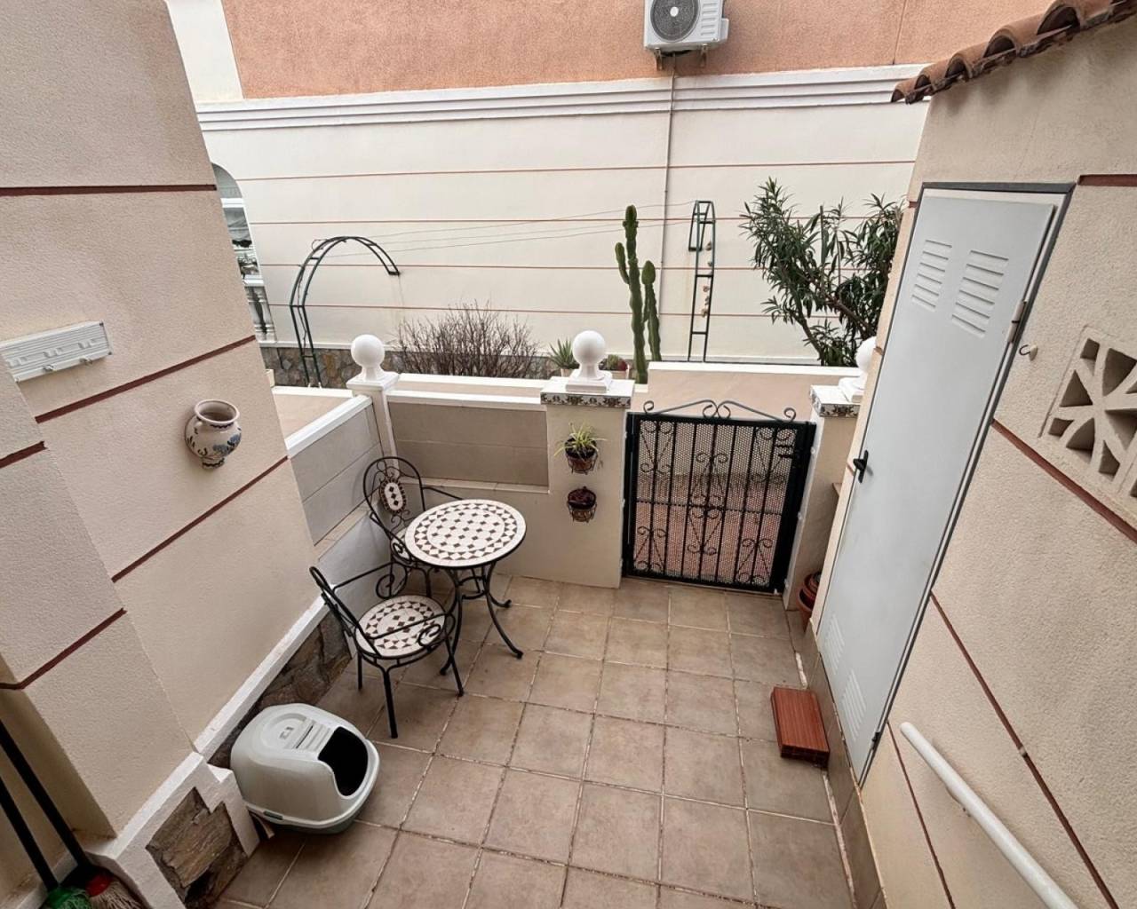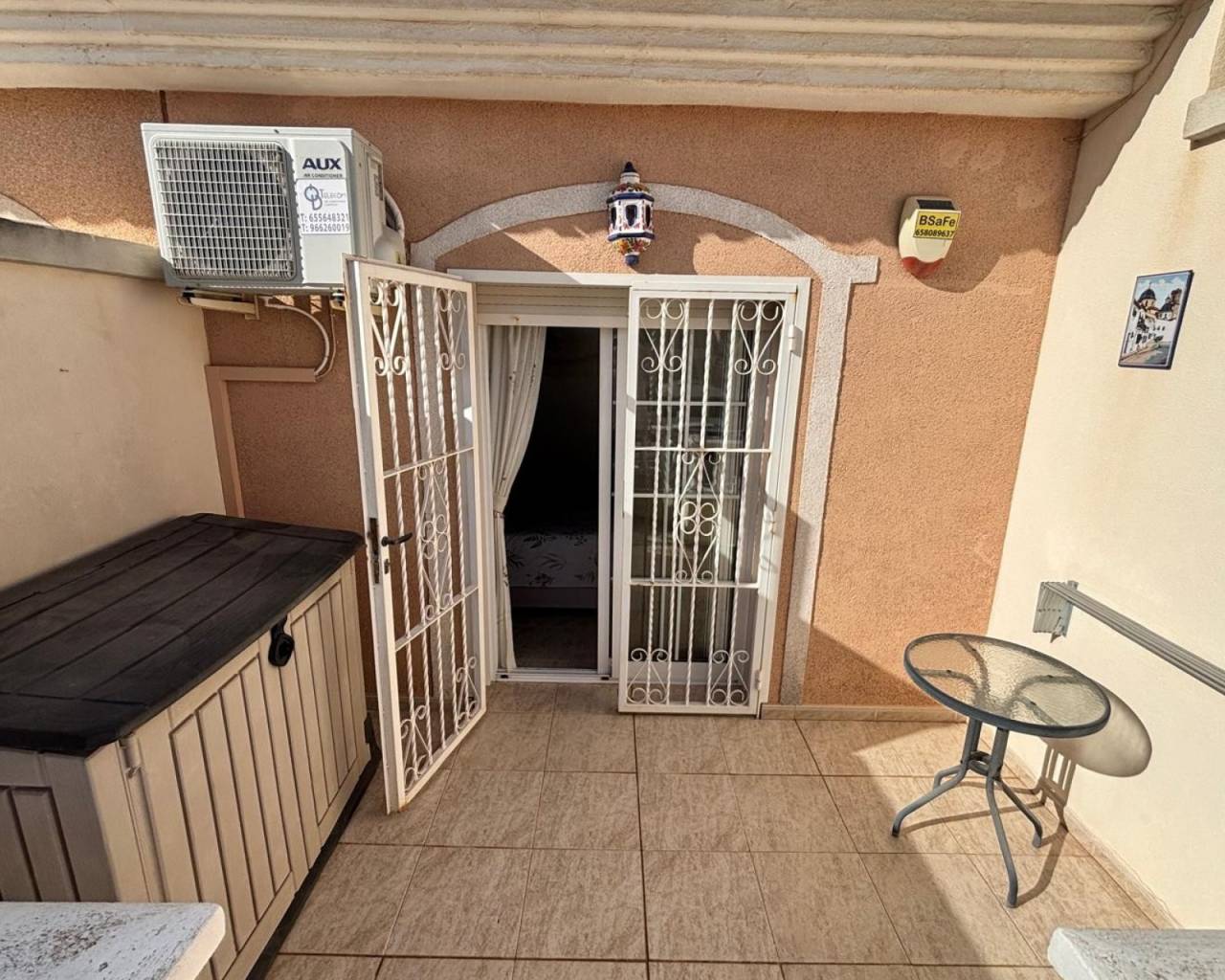 Superb East Facing Home in Dońa Pepa, This well-presented two-bedroom property is offered in excellent condition,The home features a bright open-plan living and dining area with a seperate  kitchen, creating a modern and sociable living space. The kitchen comes fully equipped with white goods, while air conditioning and ceiling fans ensure comfort all year round. There are two bedrooms, both with built-in wardrobes, a family bathroom, and a separate guest toilet. The property also benefits from a Terrace from the main bedroom with views towards the lakes. Outdoor living is enhanced by the ample front garden and glazed terrace which opens right up, perfect for relaxing or entertaining. Residents can also enjoy access to a communal swimming pool and gardens which is only 1 minute stroll at the rear.. Ideally located within walking distance to amenities, the property is just 5 minutes from local shops and services, 15 minutes from the beach and golf courses, and approximately 30 minutes from the airport. Offered fully furnished, this home is ideal as a permanent residence, holiday retreat, or rental investment.