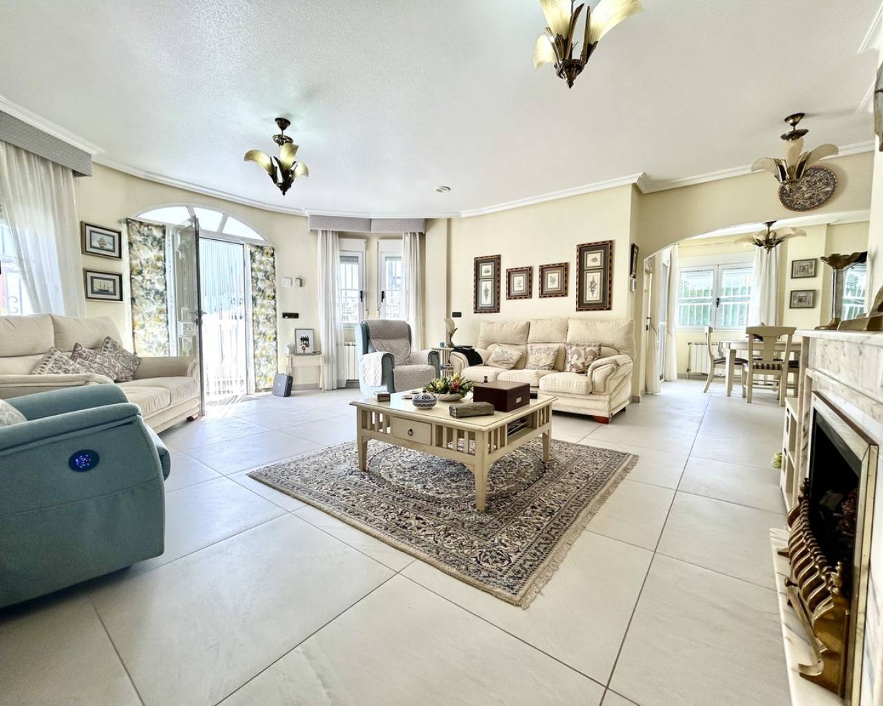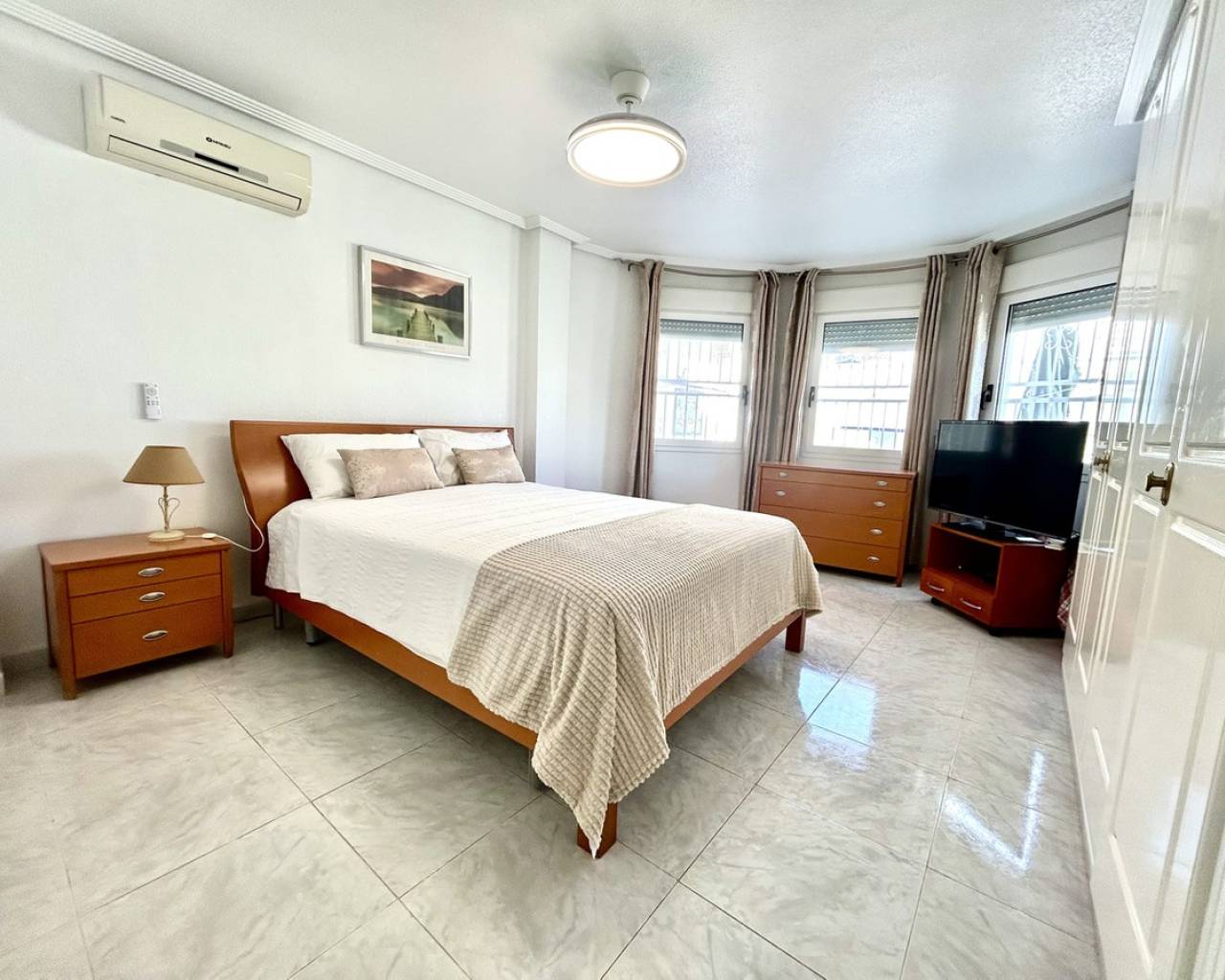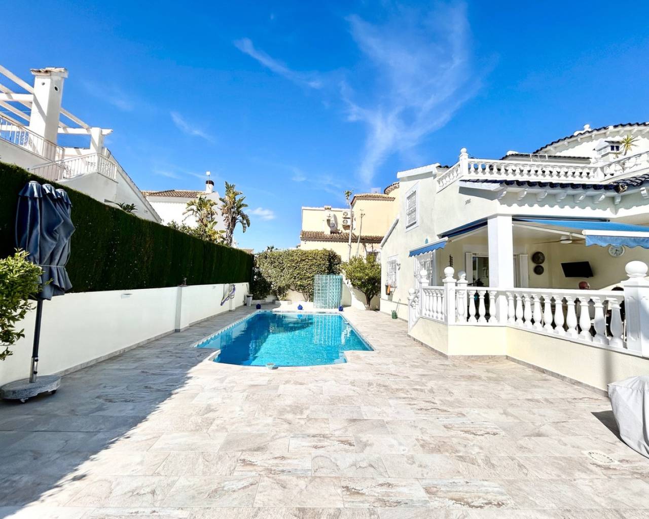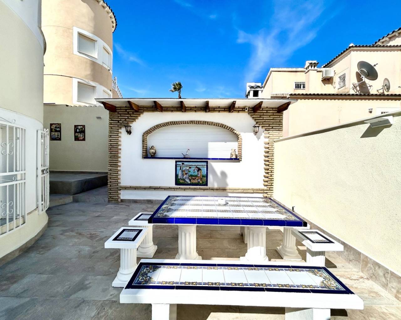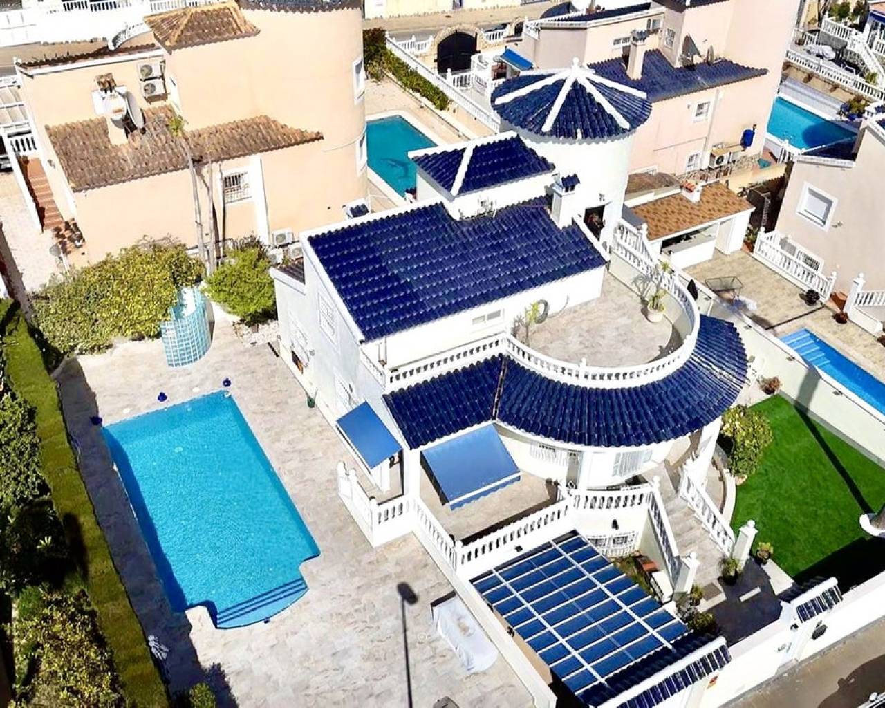 Nestled in the heart of Pinar de Campoverde, this stunning 4-bedroom, 3-bathroom villa offers the perfect blend of comfort, space, and Mediterranean lifestyle — all just a short stroll from local bars, restaurants, shops, and everyday amenities. Designed for both relaxed family living and effortless entertaining, the property boasts a private swimming pool, beautifully landscaped gardens illuminated with solar lighting, and a fully equipped outdoor kitchen — ideal for hosting guests and enjoying long summer evenings. For added peace of mind, the villa is fitted with security cameras throughout. Inside, the home is equipped with oil central heating and air conditioning, ensuring year-round comfort. The main level welcomes you with a spacious and bright living room, complemented by a dedicated dining area and a separate modern kitchen. Also on this floor is the impressive master bedroom featuring a contemporary ensuite bathroom. Downstairs, you'll find a large entertainment area — perfect as a games room, cinema space, or guest suite — along with an additional bedroom and bathroom, offering flexibility for visitors or extended family. The top floor hosts two further bedrooms and two bathrooms, all finished to a high standard. From here, you can enjoy beautiful sea views, which are also visible from the expansive terrace — a perfect spot for morning coffee or sunset relaxation. Completing the property is a large private garage, providing secure parking and additional storage. This villa combines an excellent central location, generous living space, and desirable outdoor features, making it an exceptional opportunity whether as a permanent residence, holiday home, or investment.