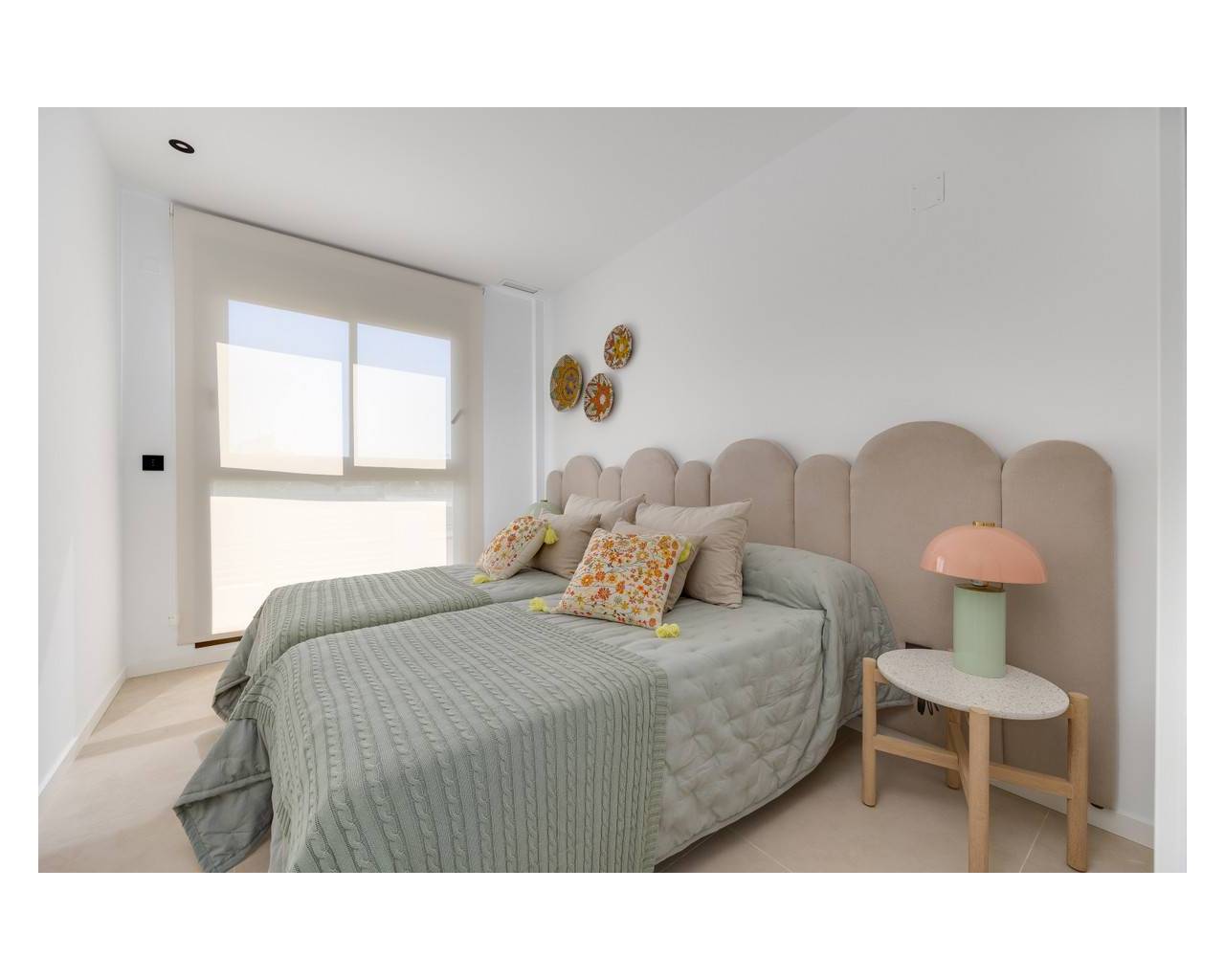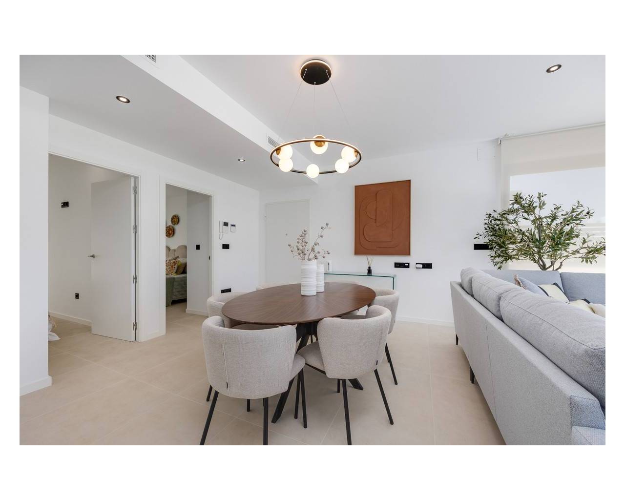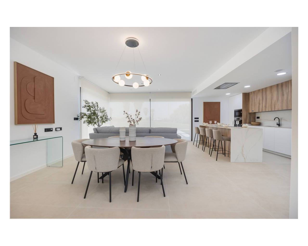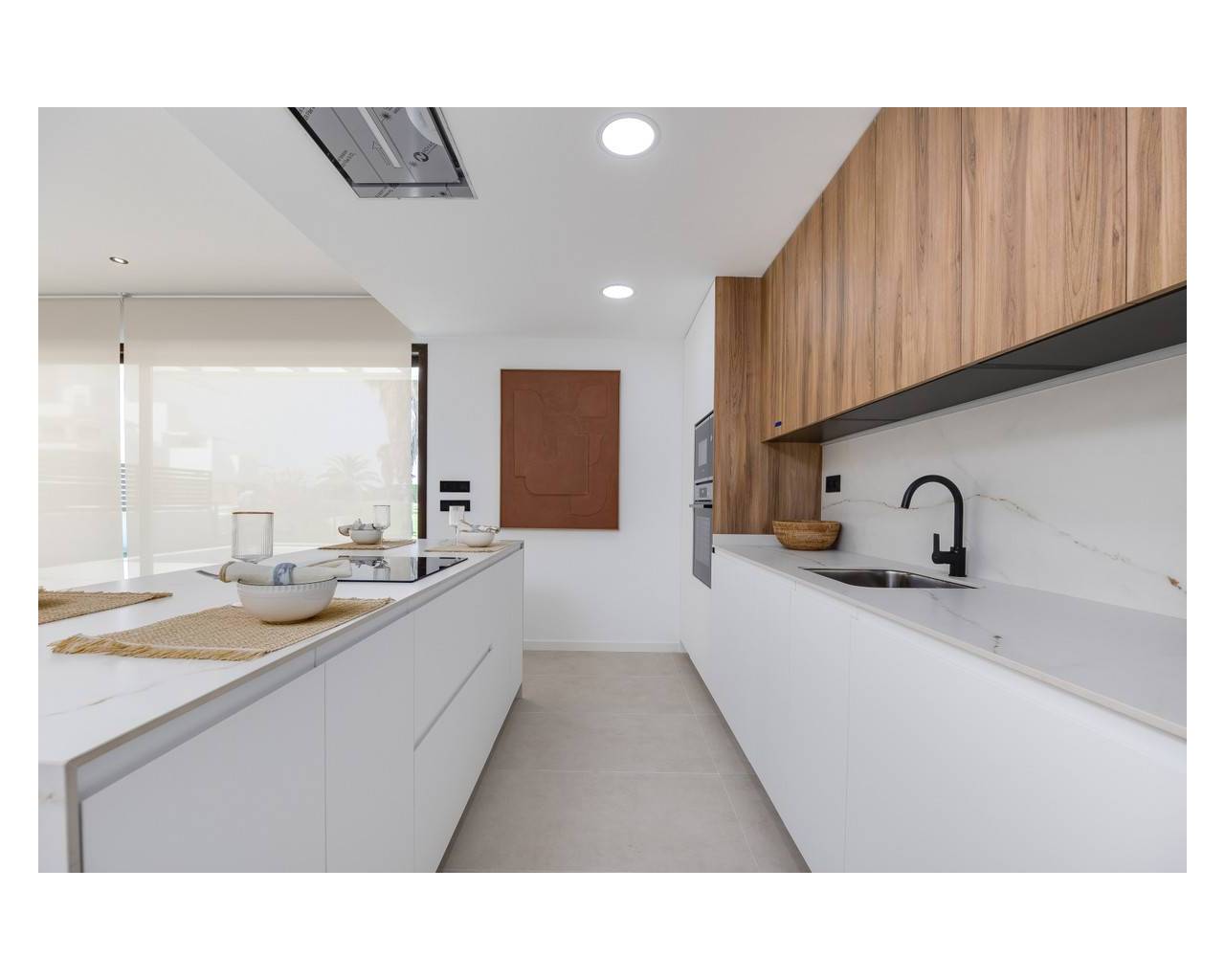 This modern development features a reinforced concrete structure with a flat roof insulated with 6 cm extruded polystyrene. The facade consists of a double-leaf ceramic brick system, also insulated with 6 cm extruded polystyrene for enhanced energy efficiency. Exterior aluminum carpentry in color 7016 (or similar) includes thermal break and Climalit double-glazed windows, while terraces are adorned with sleek glass railings. Inside, white-lacquered wood carpentry complements built-in wardrobes with internal lining and drawers in every room. The development is equipped with pre-installed ducted air conditioning, electric blinds, and an 8 kWp photovoltaic system with a 6 kWp inverter. A private underground garage and a private swimming pool add exclusivity. The kitchen boasts high and low lacquered cabinets with grey interiors and matte white doors, a Neolith (or similar) countertop (color TBD), an undermount sink with a single-lever faucet, and an aerothermal system with a 150-liter hot water tank. Bathrooms feature resin shower trays, glass screens, black built-in shower fittings, suspended porcelain washbasins with cabinets, mirrors, and black single-lever faucets. Flooring throughout the home is porcelain stoneware, with porcelain wall tiles in the bathrooms, both in colors yet to be defined.