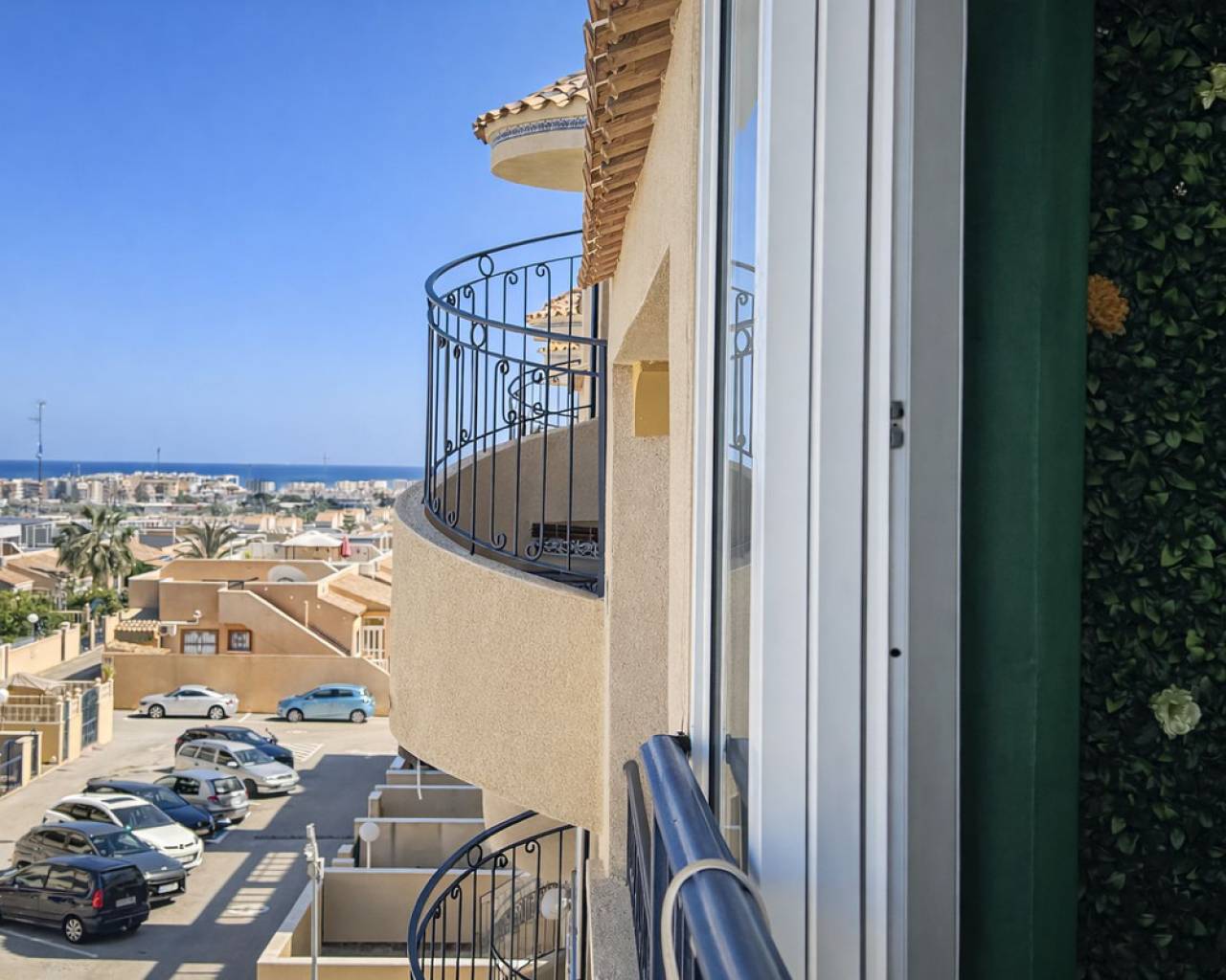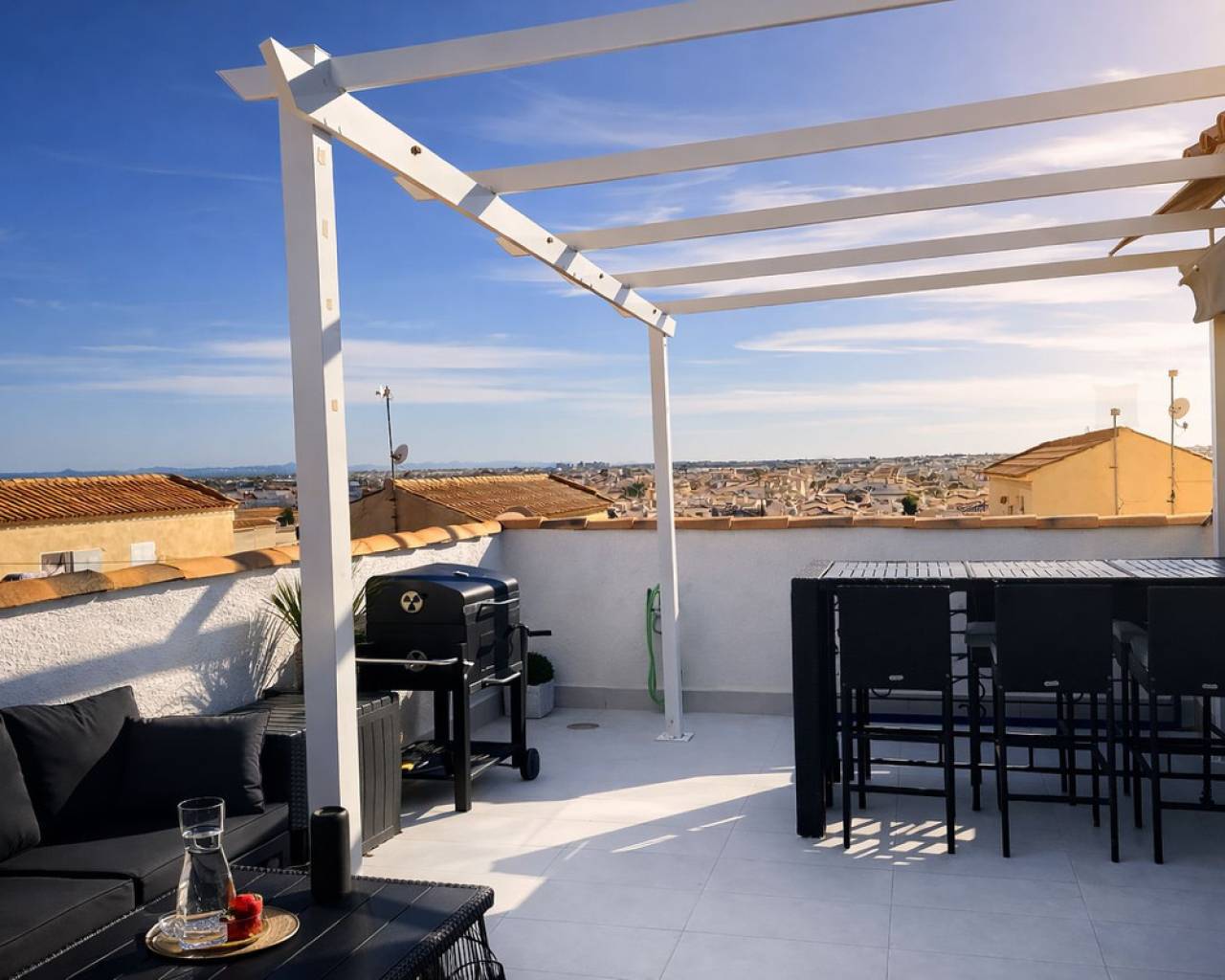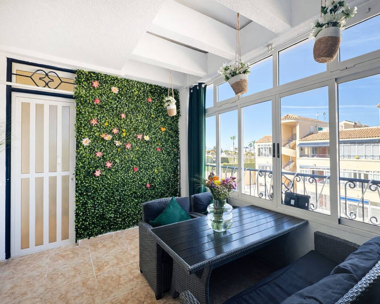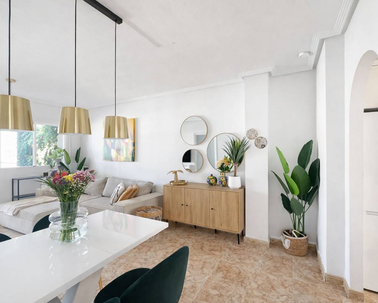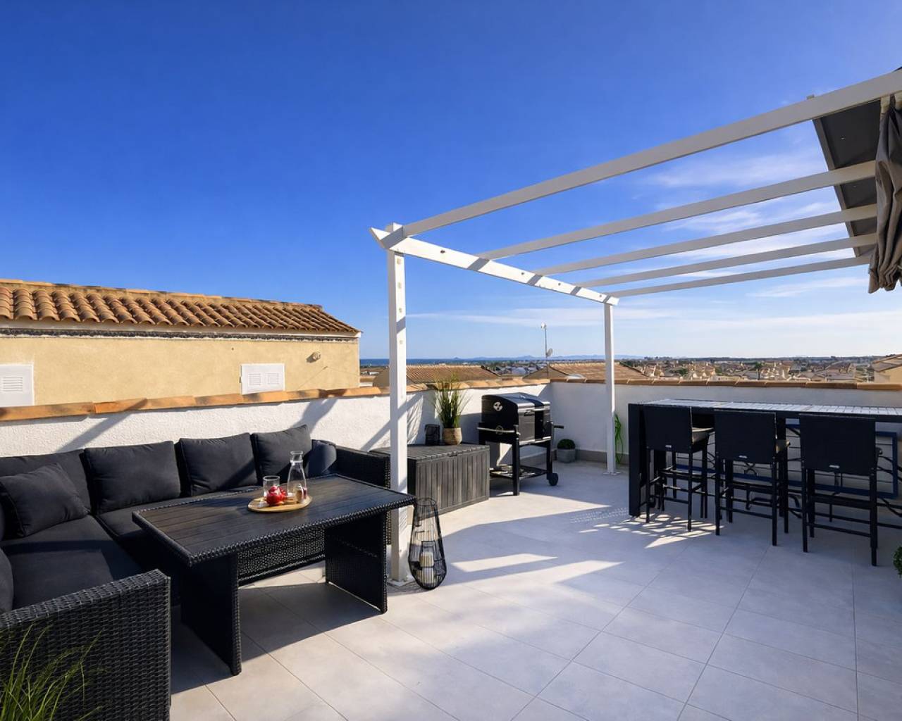 Top Floor Apartment with Sea Views & Private Rooftop Terrace – Los Altos, Costa Blanca This exceptional top floor apartment offers a rare combination of privacy, natural light, and panoramic sea views in a prime south-facing position. Located at the highest point of the building, the property enjoys a peaceful setting with open views across rooftops and towards the Mediterranean Sea, creating a true sense of space and tranquility. The apartment has been fully renovated in a refined Scandinavian style, where clean lines and modern finishes meet subtle Mediterranean warmth. Sold fully furnished, the property is ready to move into immediately, making it an ideal choice for both permanent living and holiday use. Inside, the home features two spacious bedrooms with built-in wardrobes and a fully renovated bathroom finished with high-quality materials. The bright living area flows naturally into a glazed balcony, which extends the living space and offers calming views over the communal pool, lush gardens, and the sea in the distance. The modern kitchen is fully equipped with new appliances, including an induction hob and oven, and is complemented by a practical patio area with integrated laundry space. The highlight of the property is the private rooftop terrace of over 25 sqm, perfectly positioned to the south. This elevated outdoor space is designed for both relaxation and social living, offering uninterrupted views of the Mediterranean. A unique feature is the private mini gym, allowing you to train in complete privacy while enjoying the surrounding views. The property is located in a well-maintained and quiet urbanisation with access to communal pools and green areas, while still being close to all essential amenities. Punta Marina shopping centre, with its selection of restaurants, bars, and services, is within walking distance, and the beach can be reached in approximately 25 minutes. Key features include: South-facing top floor position with sea views Private rooftop terrace (25+ sqm) with panoramic views Fully renovated in modern Scandinavian style Sold fully furnished and move-in ready 2 bedrooms and 1 high-quality bathroom Glazed balcony with views of pool, gardens, and sea Fully equipped kitchen with new appliances Private underground garage space Quiet urbanisation with communal pool and green areas Walking distance to Punta Marina and close to the beach This is a property designed for buyers seeking a high-quality home that combines modern design, outdoor living, and a premium lifestyle on the Costa Blanca.