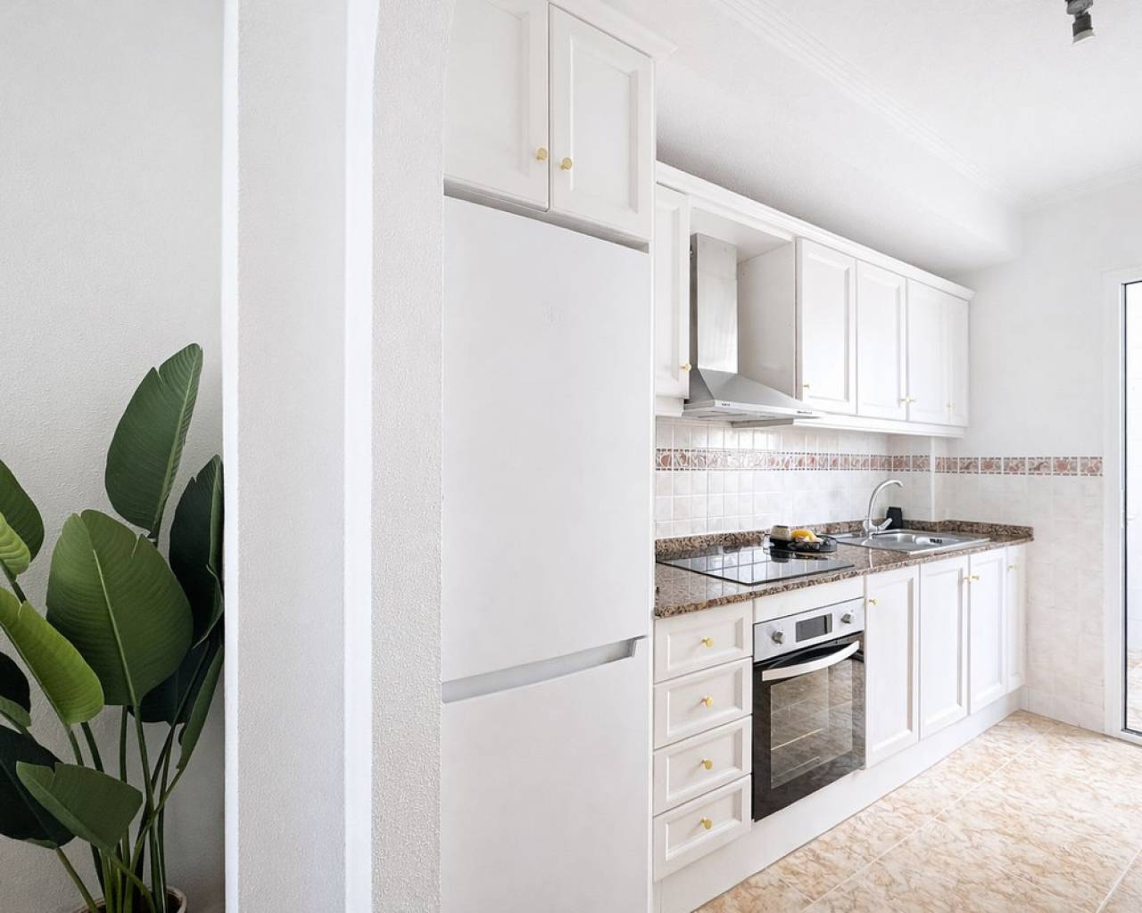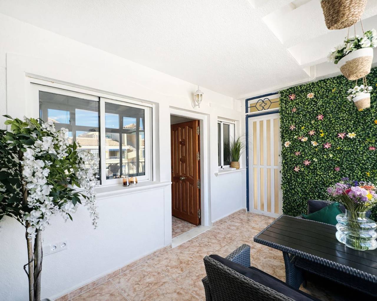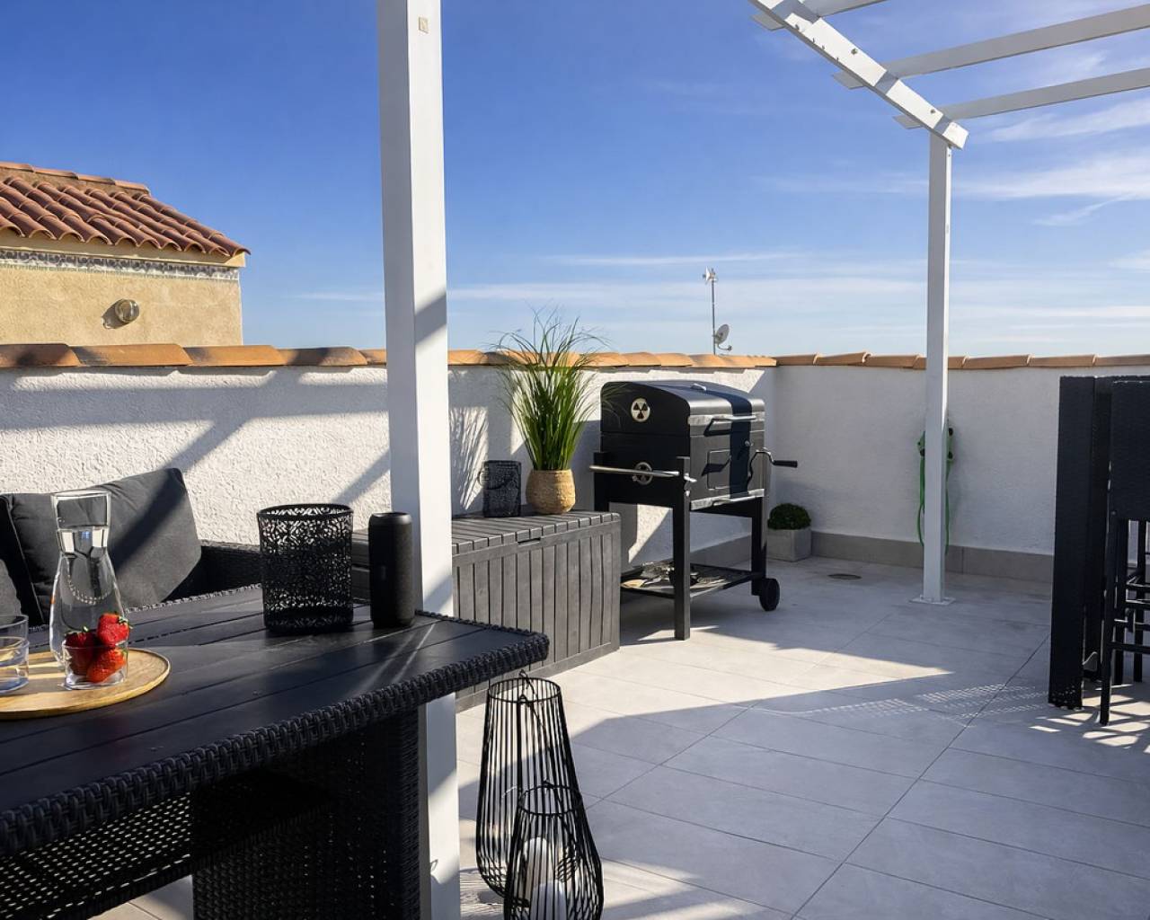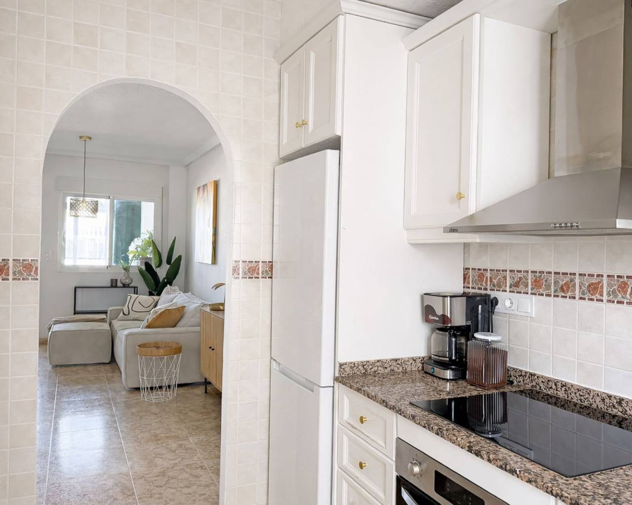 Top Floor Apartment with Sea Views & Private Rooftop Terrace – Los Altos, Costa Blanca This exceptional top floor apartment offers a rare combination of privacy, natural light, and panoramic sea views in a prime south-facing position. Located at the highest point of the building, the property enjoys a peaceful setting with open views across rooftops and towards the Mediterranean Sea, creating a true sense of space and tranquility. The apartment has been fully renovated in a refined Scandinavian style, where clean lines and modern finishes meet subtle Mediterranean warmth. Sold fully furnished, the property is ready to move into immediately, making it an ideal choice for both permanent living and holiday use. Inside, the home features two spacious bedrooms with built-in wardrobes and a fully renovated bathroom finished with high-quality materials. The bright living area flows naturally into a glazed balcony, which extends the living space and offers calming views over the communal pool, lush gardens, and the sea in the distance. The modern kitchen is fully equipped with new appliances, including an induction hob and oven, and is complemented by a practical patio area with integrated laundry space. The highlight of the property is the private rooftop terrace of over 25 sqm, perfectly positioned to the south. This elevated outdoor space is designed for both relaxation and social living, offering uninterrupted views of the Mediterranean. A unique feature is the private mini gym, allowing you to train in complete privacy while enjoying the surrounding views. The property is located in a well-maintained and quiet urbanisation with access to communal pools and green areas, while still being close to all essential amenities. Punta Marina shopping centre, with its selection of restaurants, bars, and services, is within walking distance, and the beach can be reached in approximately 25 minutes. Key features include: South-facing top floor position with sea views Private rooftop terrace (25+ sqm) with panoramic views Fully renovated in modern Scandinavian style Sold fully furnished and move-in ready 2 bedrooms and 1 high-quality bathroom Glazed balcony with views of pool, gardens, and sea Fully equipped kitchen with new appliances Private underground garage space Quiet urbanisation with communal pool and green areas Walking distance to Punta Marina and close to the beach This is a property designed for buyers seeking a high-quality home that combines modern design, outdoor living, and a premium lifestyle on the Costa Blanca.