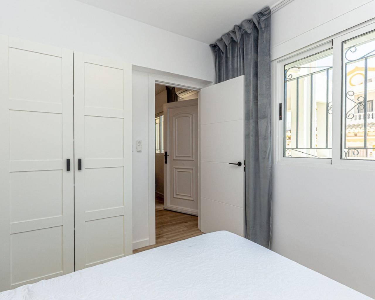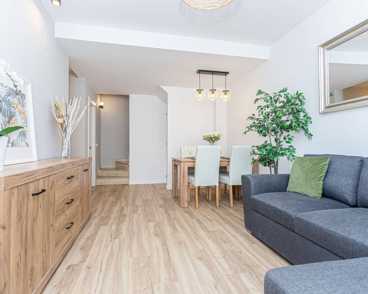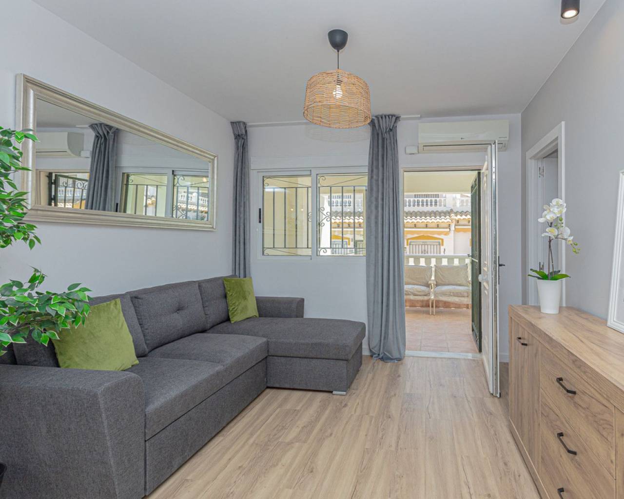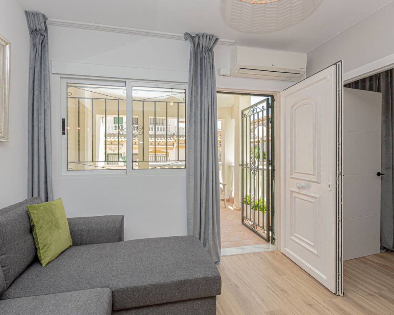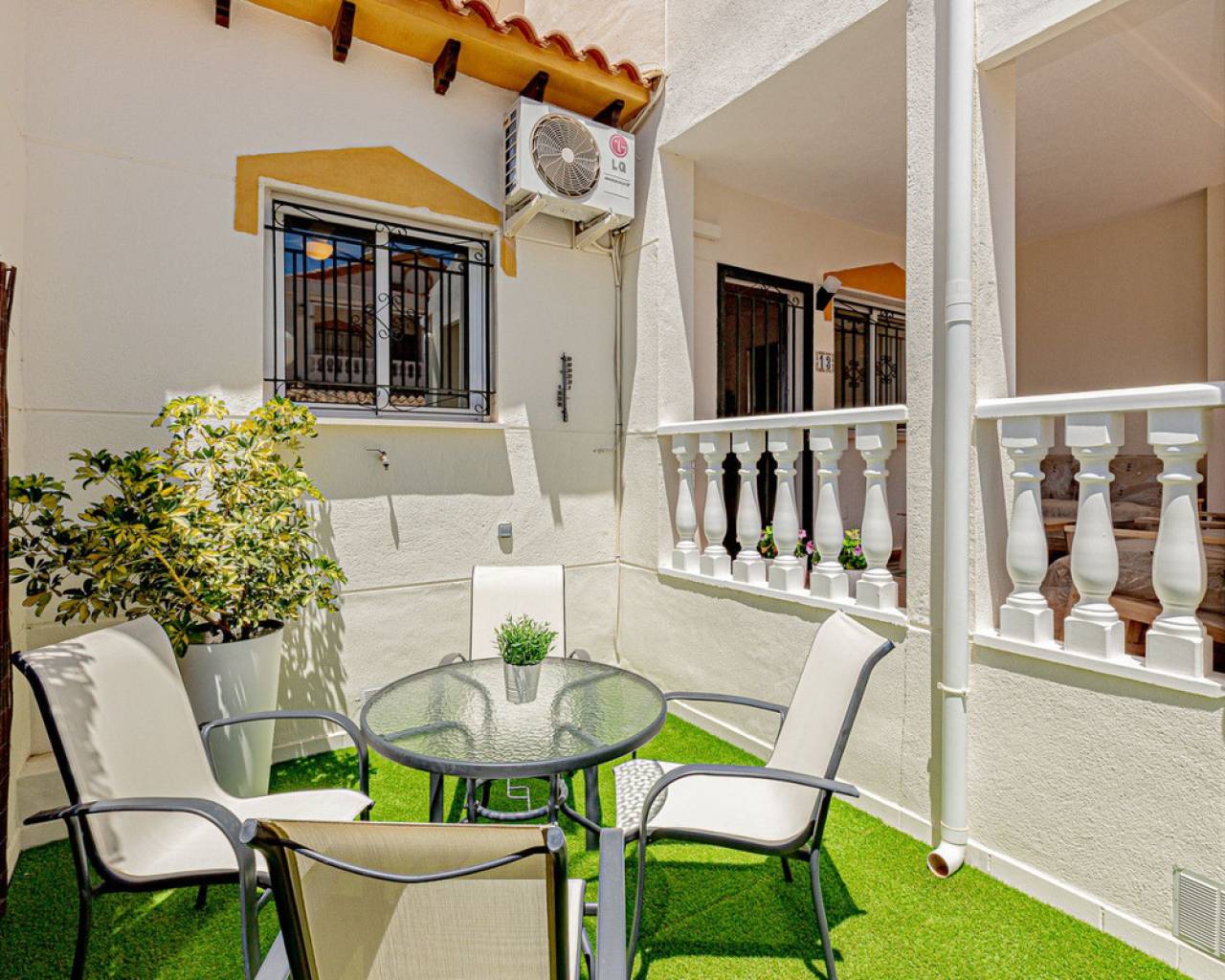 The property is in impeccable condition, ready to move in, and is spread over two floors. It offers a modern and functional layout with 3 bedrooms and 2 full bathrooms.The entrance features a fully tiled private garden, ideal for enjoying the Mediterranean climate with minimal maintenance. A few steps lead to a covered porch, perfect for setting up an outdoor seating area.The ground floor includes a bright L-shaped living-dining room, cleverly adapted to add an extra bedroom—ideal for guests or individuals with reduced mobility. There is also a separate kitchen equipped with all modern appliances, a laundry area, a bathroom with shower, and a handy under-stairs storage space.Upstairs you will find two spacious double bedrooms with freestanding wardrobes, and a second full bathroom with bathtub. The master bedroom benefits from a sunny south-facing orientation with plenty of natural light throughout the day.The home features air conditioning in all bedrooms and the living room, and is sold fully furnished with quality furniture and appliances (excluding personal effects and decorative items).The community offers a lovely communal pool, and the home is located on a quiet street with easy parking and a pleasant environment.Prime location:Only 400 m from Consum supermarketSurrounded by restaurants including Asia Kitchen, a stone-grilled meat restaurant, and the popular pub The Bridge15-minute walk to Punta Marina shopping centreJust 2.5 km from Punta Prima beachIdeal as a permanent residence, holiday home or turnkey rental investment. A fantastic opportunity in one of the most desirable areas of the Costa Blanca.