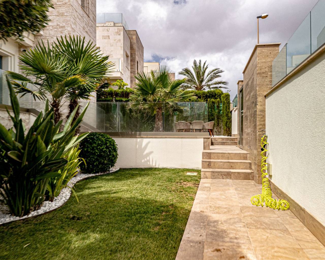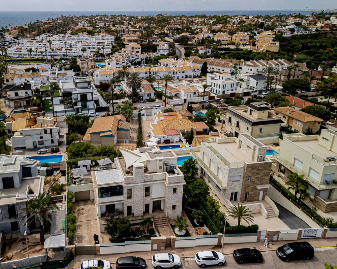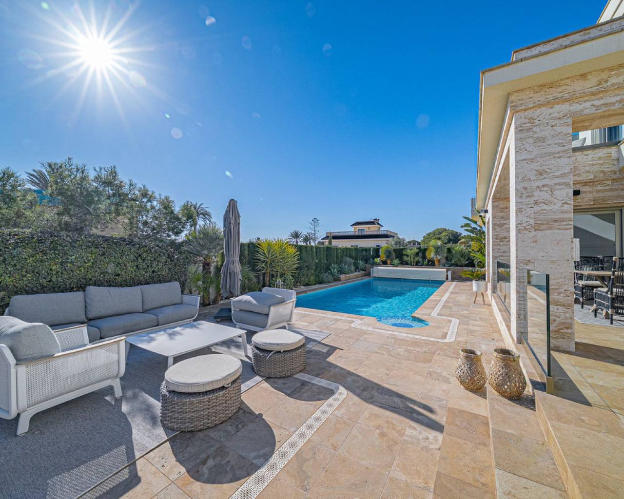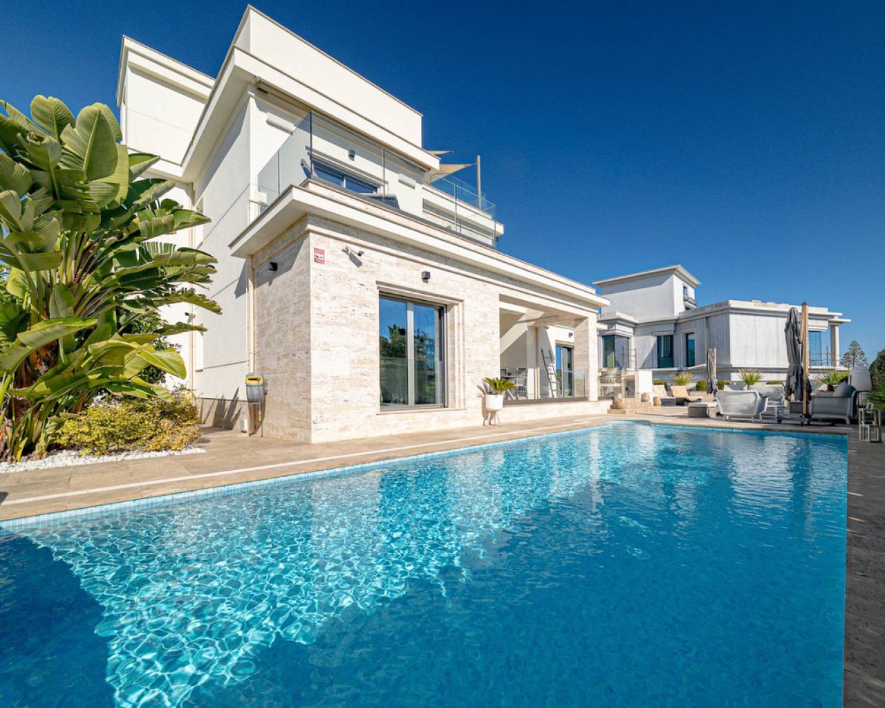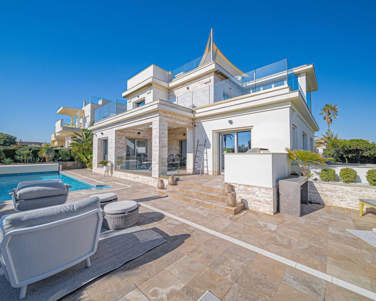 This contemporary beachside villa, built in 2022, offers luxury coastal living just steps from the sea. Set on a 665.66 m² gated plot, the home boasts 442 m² of living space across multiple levels—including a 186.60 m² underbuild featuring a spacious private gym, a large guest bedroom, and direct access to the private garage with room for up to two cars and generous storage space. The layout includes an open-plan living and dining area with expansive floor-to-ceiling windows, a statement fireplace, and a sleek modern kitchen, complemented by a fully equipped utility/laundry room. The home offers six spacious bedrooms and four designer bathrooms—each fitted with Arital design elements and premium Wolf appliances.Enjoy the Mediterranean breeze in over 426 m² of private garden and outdoor living space, surrounded by tropical landscaping, mature palm trees, and premium finishes. The 40 m² climate-controlled swimming pool includes a double-engine-powered stream—perfect for both fitness and relaxation. The 78.80 m² rooftop solarium offers panoramic sea views and features an outdoor kitchen and BBQ area—ideal for entertaining. Located just a few hundred metres from La Zenia Beach, with shops, restaurants, and La Zenia Boulevard all within walking distance. Excellent connectivity via the nearby N-332 coastal road.The property is thoughtfully designed, and the current owner has imported many extras from Sweden, including a 150,000 euro luxury kitchen with high-end appliances, solar panels (9 kW), Tripiu designer doors, Travertine natural stone tiles at the facade, and reinforced bulletproof, anti-vandal windows and doors.A sophisticated fancoil cooling system ensures silent, energy-efficient climate control throughout the home, delivering optimal comfort and air quality year-round.The villa is fully furnished with curated, high-end pieces and showcases designer lighting throughout. It also features a state-of-the-art multi-zone audio system from Mezzanine Audio, with high-end speakers integrated throughout both the interior and exterior. The garden includes an outdoor sound system by Sonance, while each terrace features built-in speakers. Inside, the living room, kitchen, master bedroom, gym, and a guest bedroom are equipped with "invisible" ceiling speakers—seamlessly blended into the architecture. All zones are centrally managed via a Sonos intelligent control system, allowing intuitive operation through app-based domotic technology.This villa must be seen to be fully appreciated—offering a rare combination of architectural elegance, intelligent living, and premium luxury finishes in one of the Costa Blanca`s most exclusive coastal settings.