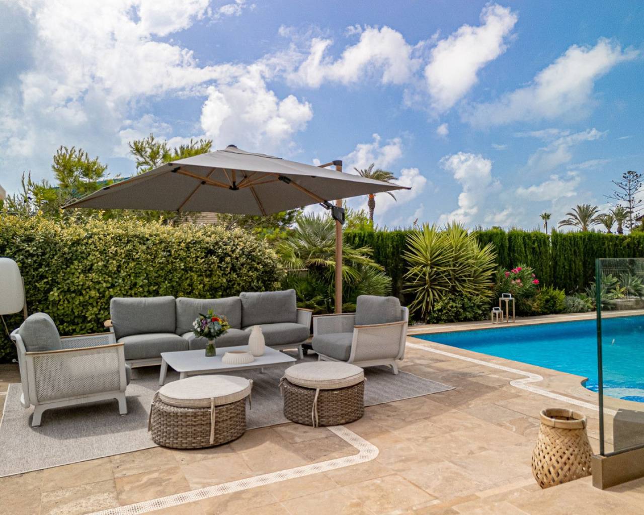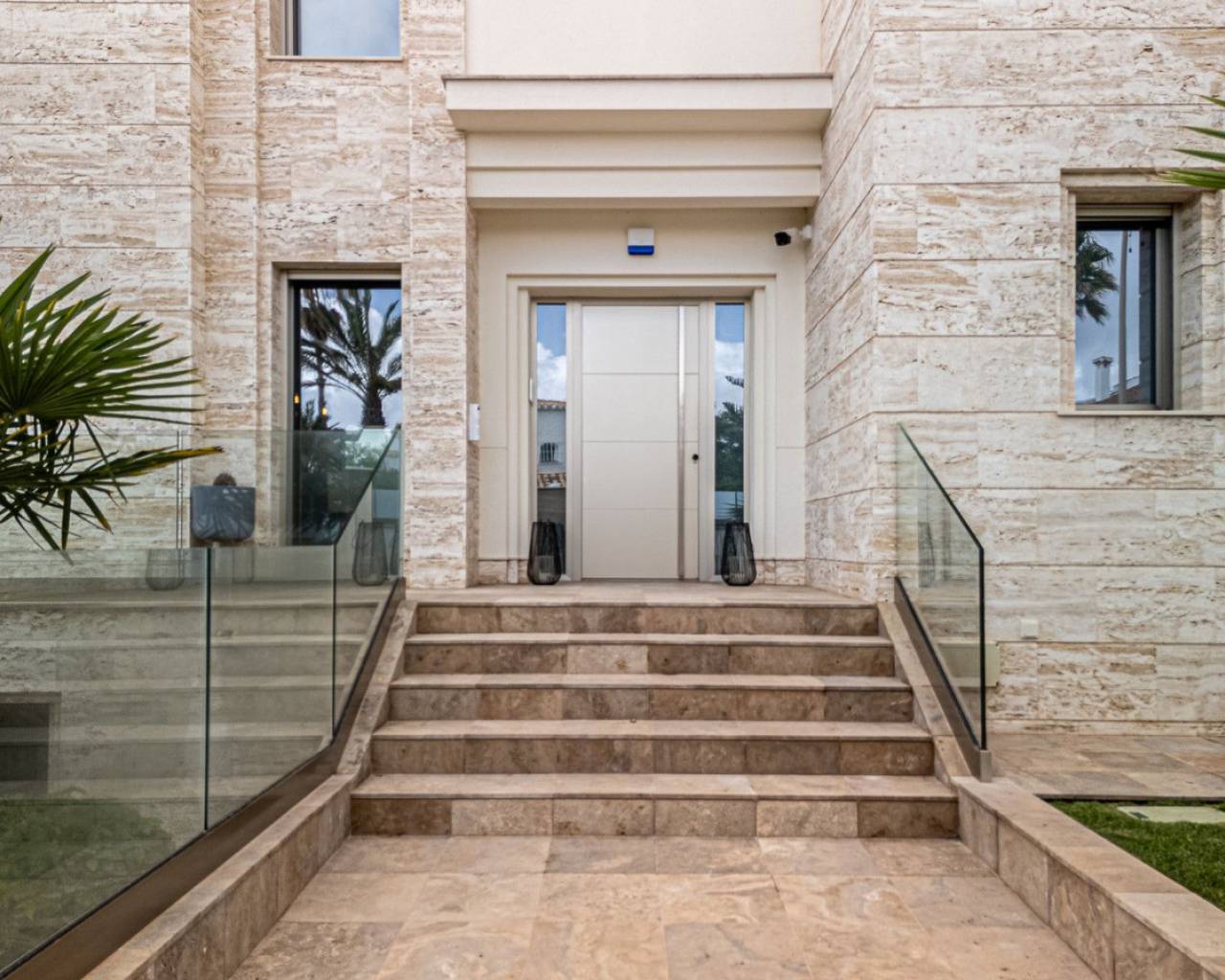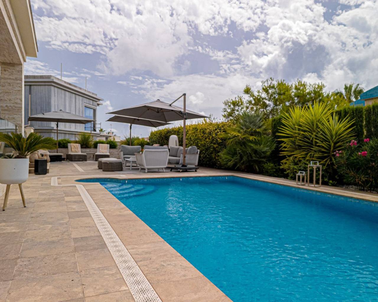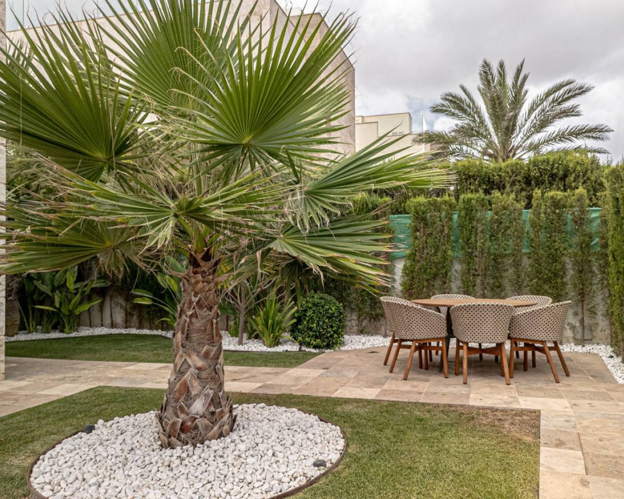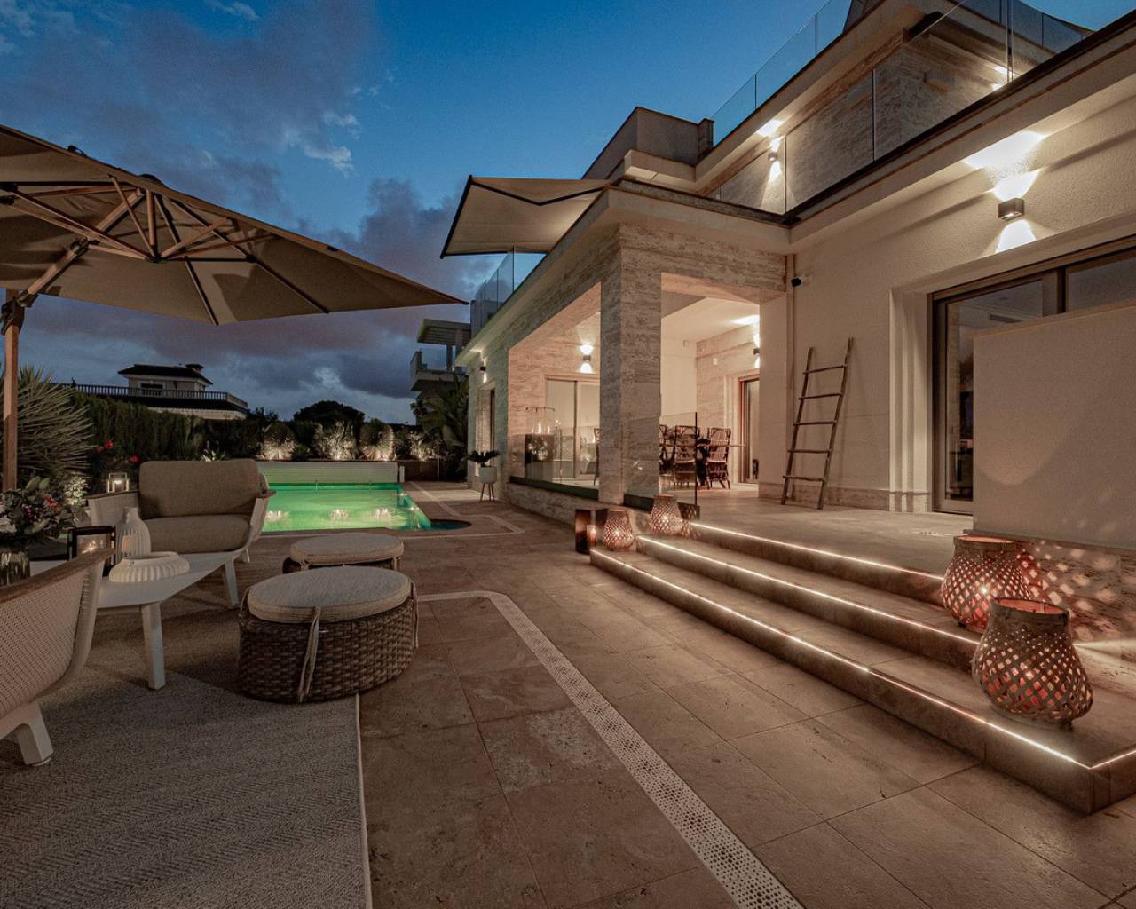 This contemporary beachside villa, built in 2022, offers luxury coastal living just steps from the sea. Set on a 665.66 m² gated plot, the home boasts 442 m² of living space across multiple levels—including a 186.60 m² underbuild featuring a spacious private gym, a large guest bedroom, and direct access to the private garage with room for up to two cars and generous storage space. The layout includes an open-plan living and dining area with expansive floor-to-ceiling windows, a statement fireplace, and a sleek modern kitchen, complemented by a fully equipped utility/laundry room. The home offers six spacious bedrooms and four designer bathrooms—each fitted with Arital design elements and premium Wolf appliances.Enjoy the Mediterranean breeze in over 426 m² of private garden and outdoor living space, surrounded by tropical landscaping, mature palm trees, and premium finishes. The 40 m² climate-controlled swimming pool includes a double-engine-powered stream—perfect for both fitness and relaxation. The 78.80 m² rooftop solarium offers panoramic sea views and features an outdoor kitchen and BBQ area—ideal for entertaining. Located just a few hundred metres from La Zenia Beach, with shops, restaurants, and La Zenia Boulevard all within walking distance. Excellent connectivity via the nearby N-332 coastal road.The property is thoughtfully designed, and the current owner has imported many extras from Sweden, including a 150,000 euro luxury kitchen with high-end appliances, solar panels (9 kW), Tripiu designer doors, Travertine natural stone tiles at the facade, and reinforced bulletproof, anti-vandal windows and doors.A sophisticated fancoil cooling system ensures silent, energy-efficient climate control throughout the home, delivering optimal comfort and air quality year-round.The villa is fully furnished with curated, high-end pieces and showcases designer lighting throughout. It also features a state-of-the-art multi-zone audio system from Mezzanine Audio, with high-end speakers integrated throughout both the interior and exterior. The garden includes an outdoor sound system by Sonance, while each terrace features built-in speakers. Inside, the living room, kitchen, master bedroom, gym, and a guest bedroom are equipped with "invisible" ceiling speakers—seamlessly blended into the architecture. All zones are centrally managed via a Sonos intelligent control system, allowing intuitive operation through app-based domotic technology.This villa must be seen to be fully appreciated—offering a rare combination of architectural elegance, intelligent living, and premium luxury finishes in one of the Costa Blanca`s most exclusive coastal settings.