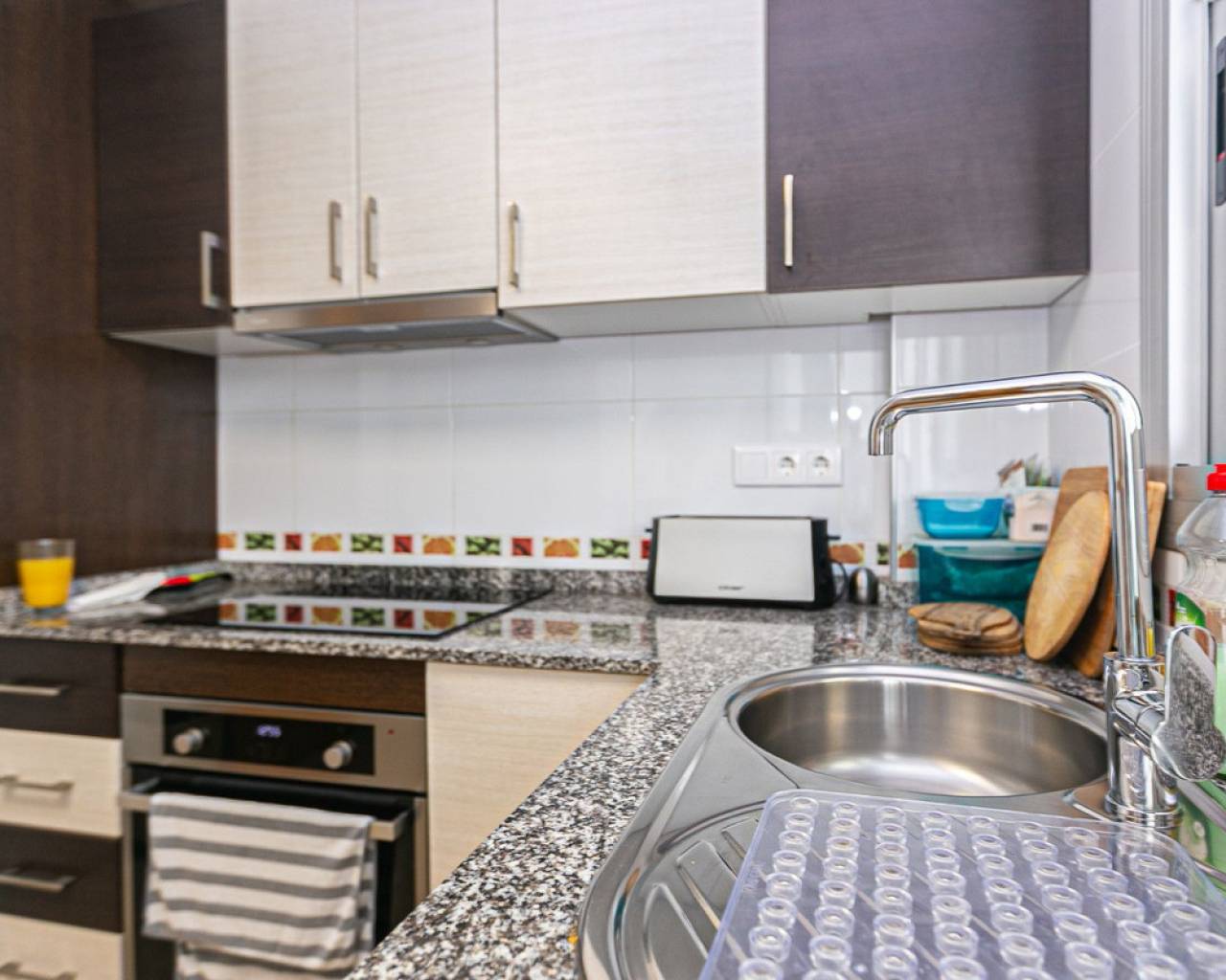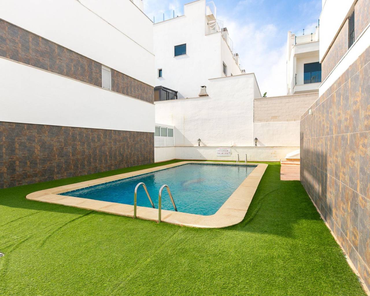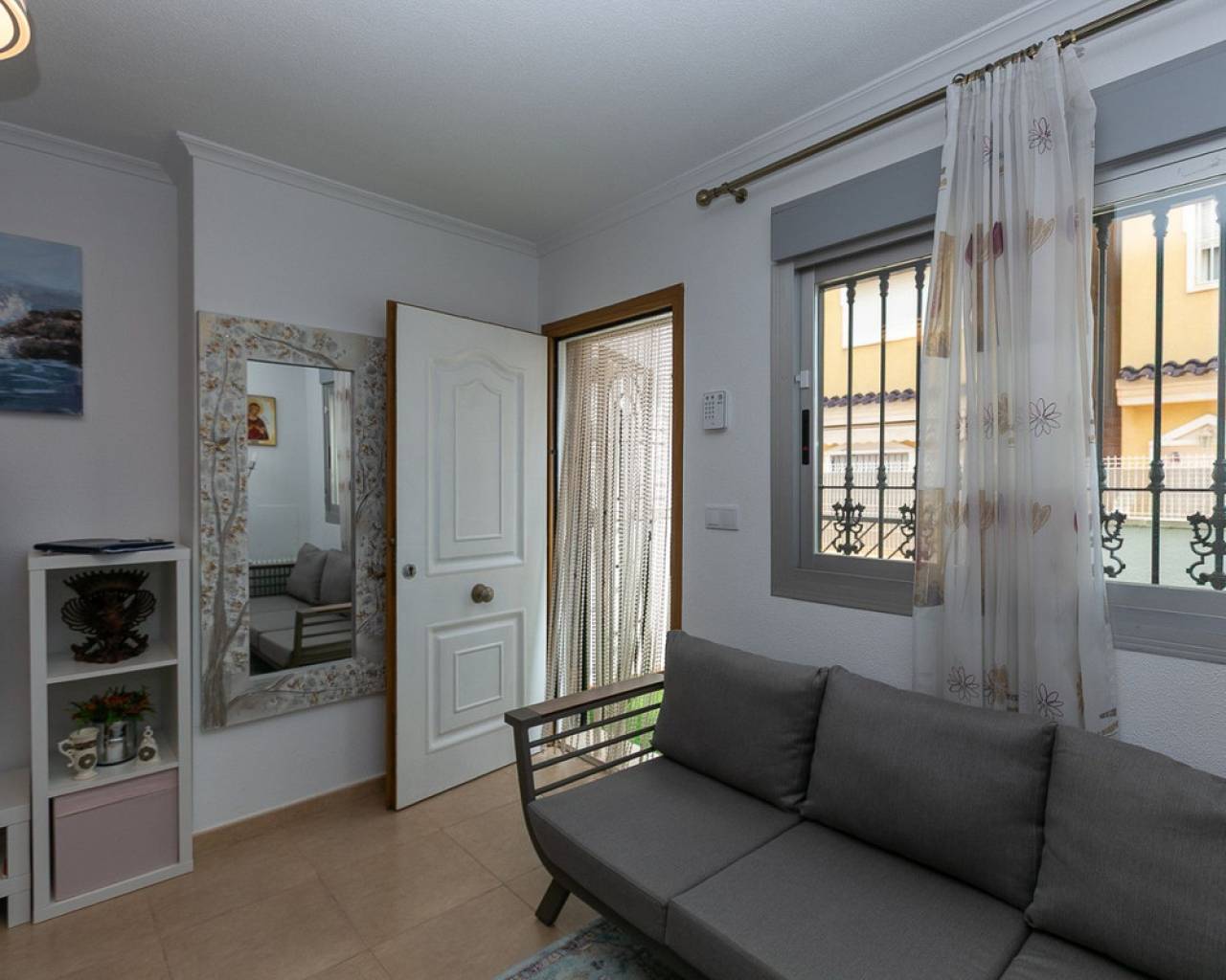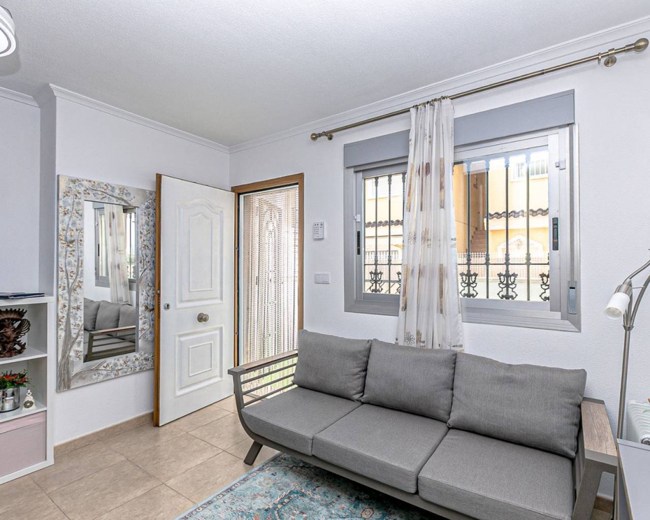 We present an attractive townhouse located in a gated residential complex in Guardamar del Segura, with a communal pool available to all residents.The property has an independent entrance and a front terrace. Upon entering through the main door, there is a living room and a guest toilet. Next is the separate kitchen, which leads to a glazed and enclosed rear patio that can be opened on the sides through sliding windows – ideal as a bright dining area.On the first floor, there are two spacious bedrooms with fitted wardrobes and a modern bathroom with shower. The third floor features another bedroom with two exits: one to a small patio where the washing machine/dryer and water heater are located, and the other to an outdoor terrace perfect for enjoying breakfast in the open air. From this terrace there are sea views.A highlight of this home is its private garage with direct access from the street. It is sold fully furnished (except personal belongings), with appliances, centralized air conditioning, awning, sofa with integrated armchair, solar panel for hot water, and in the third bedroom a split unit, electric towel warmer, ceiling fan and television with German channels.Additional information about Guardamar del Segura and surroundings:Guardamar del Segura is a coastal town located in the south of the Costa Blanca, offering about 11 kilometres of fine sandy beaches. It is approximately 33 km from Alicante–Elche Airport. The La Marquesa Golf Course (in Ciudad Quesada) is one of the nearest in the area, just 7.2 km from the property. Contact us if you wish to arrange a viewing.