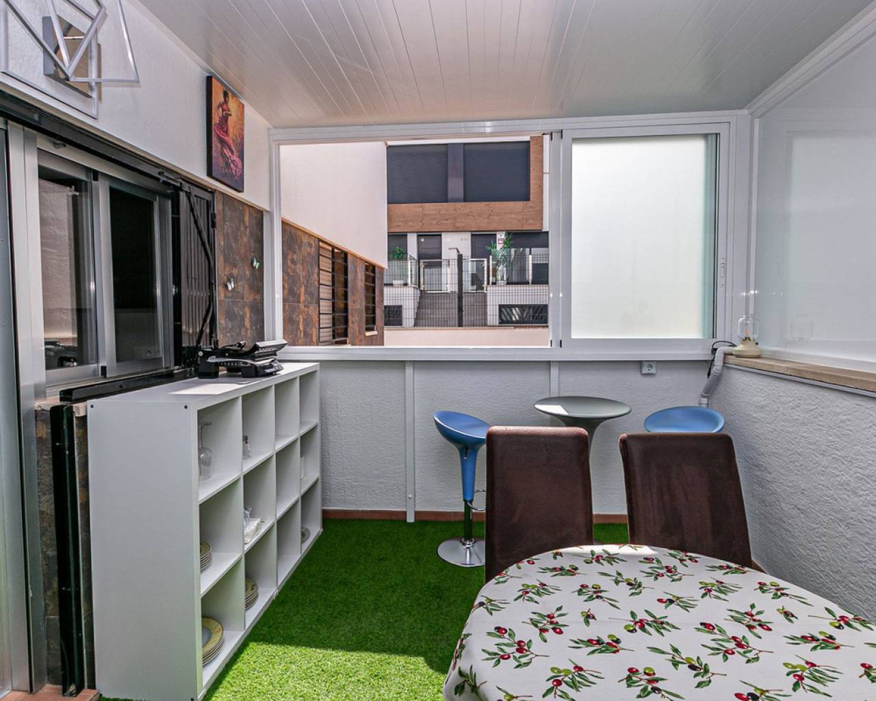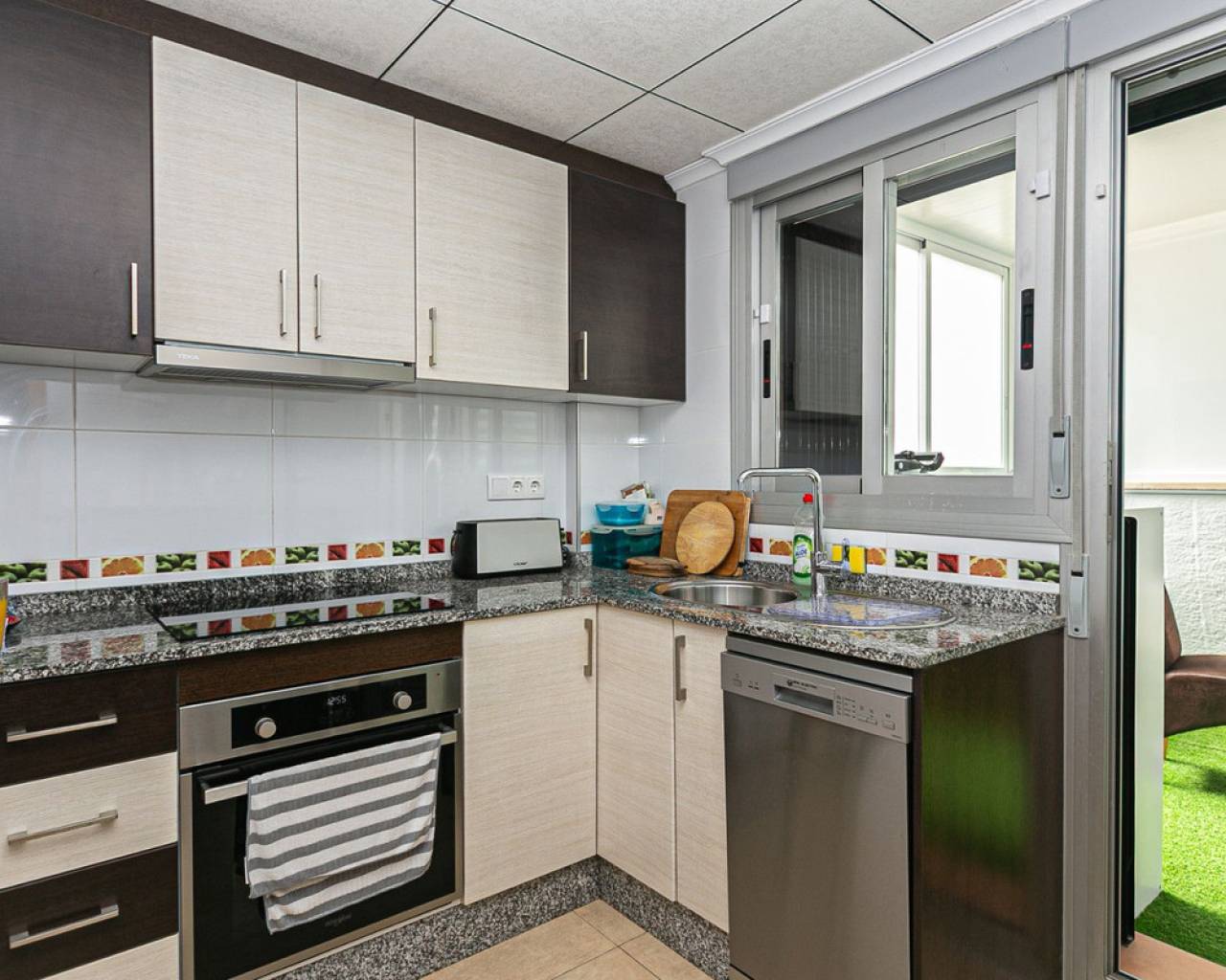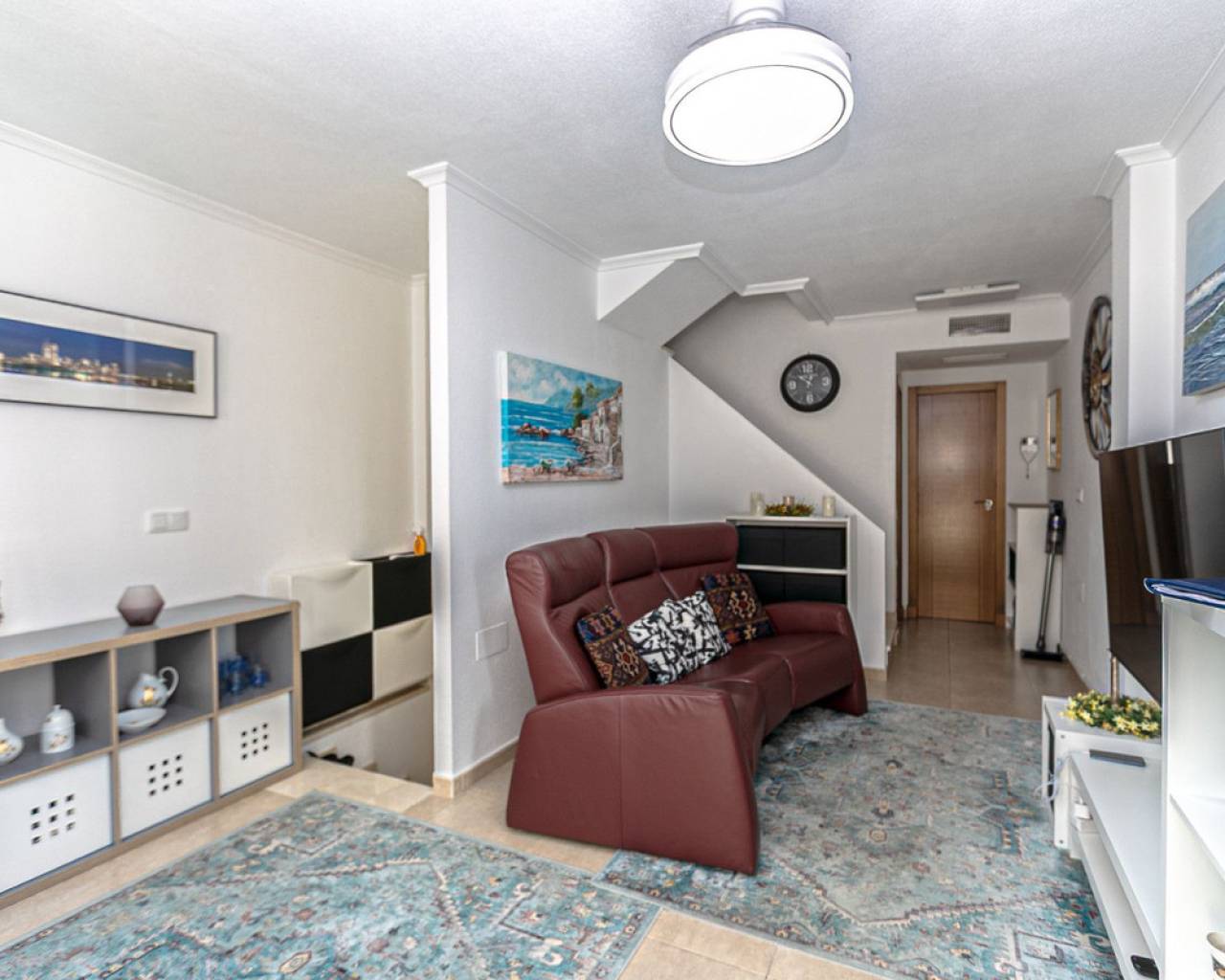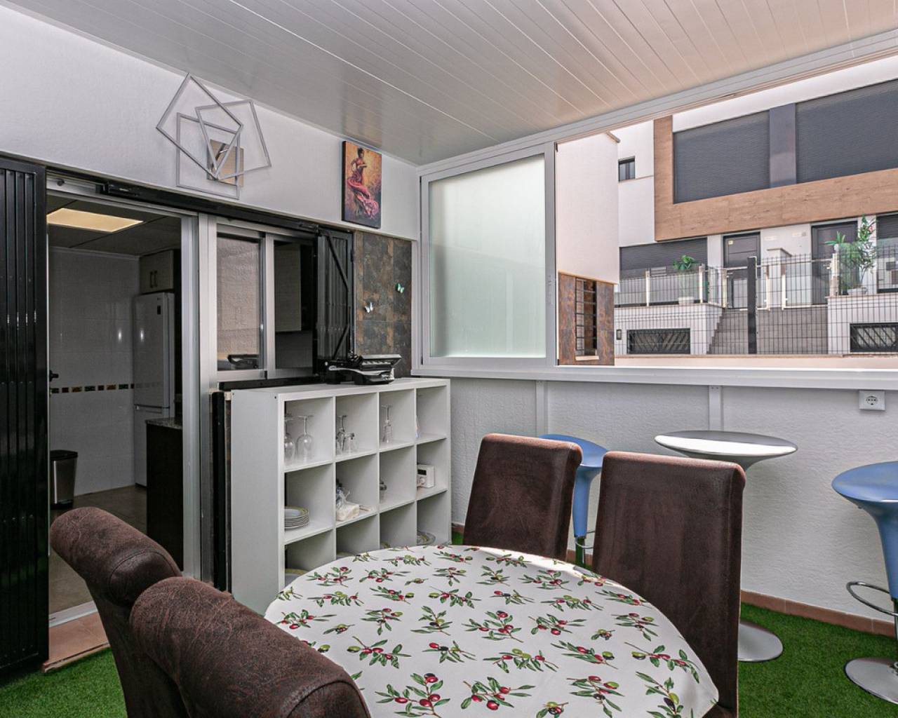 We present an attractive townhouse located in a gated residential complex in Guardamar del Segura, with a communal pool available to all residents.The property has an independent entrance and a front terrace. Upon entering through the main door, there is a living room and a guest toilet. Next is the separate kitchen, which leads to a glazed and enclosed rear patio that can be opened on the sides through sliding windows – ideal as a bright dining area.On the first floor, there are two spacious bedrooms with fitted wardrobes and a modern bathroom with shower. The third floor features another bedroom with two exits: one to a small patio where the washing machine/dryer and water heater are located, and the other to an outdoor terrace perfect for enjoying breakfast in the open air. From this terrace there are sea views.A highlight of this home is its private garage with direct access from the street. It is sold fully furnished (except personal belongings), with appliances, centralized air conditioning, awning, sofa with integrated armchair, solar panel for hot water, and in the third bedroom a split unit, electric towel warmer, ceiling fan and television with German channels.Additional information about Guardamar del Segura and surroundings:Guardamar del Segura is a coastal town located in the south of the Costa Blanca, offering about 11 kilometres of fine sandy beaches. It is approximately 33 km from Alicante–Elche Airport. The La Marquesa Golf Course (in Ciudad Quesada) is one of the nearest in the area, just 7.2 km from the property. Contact us if you wish to arrange a viewing.