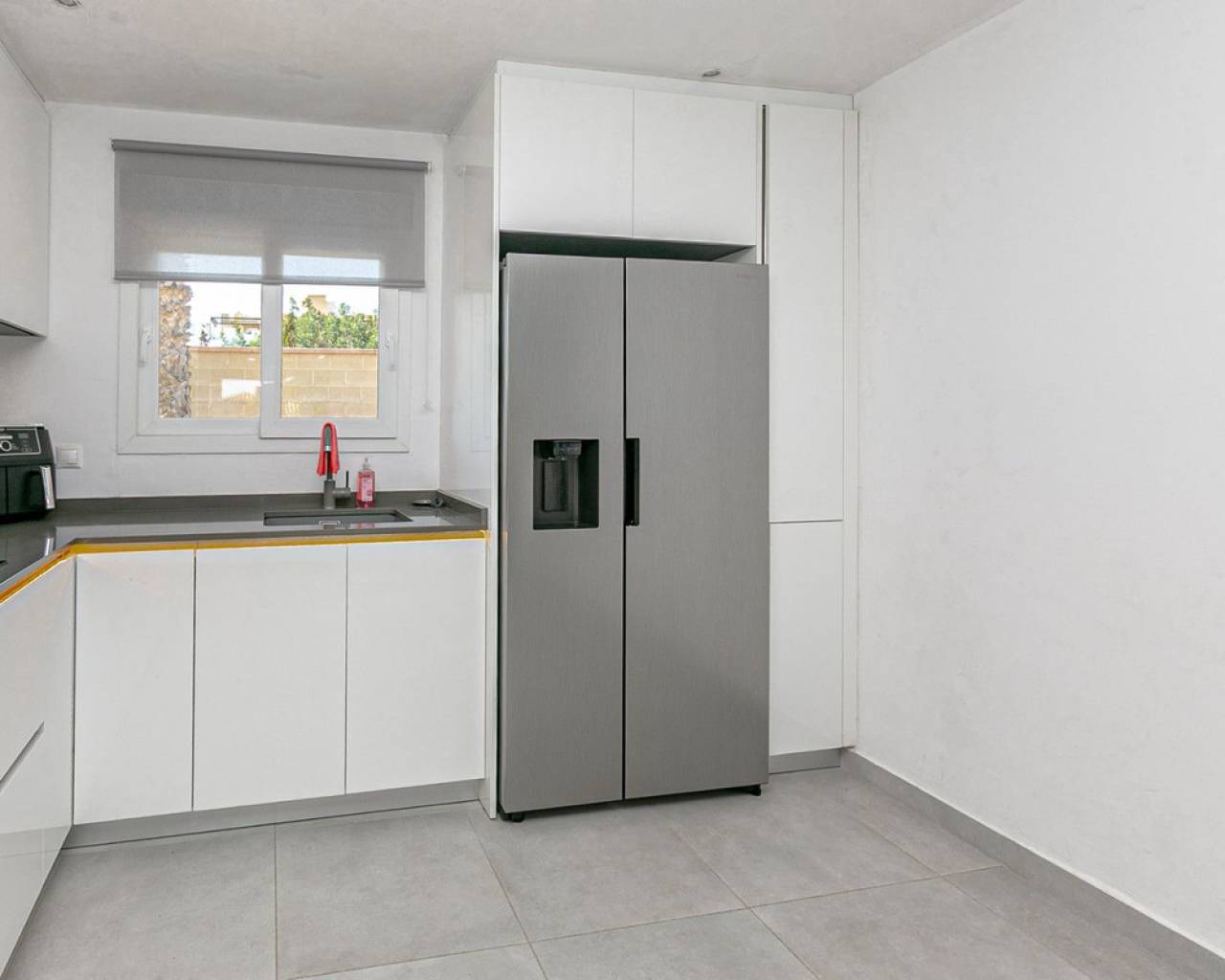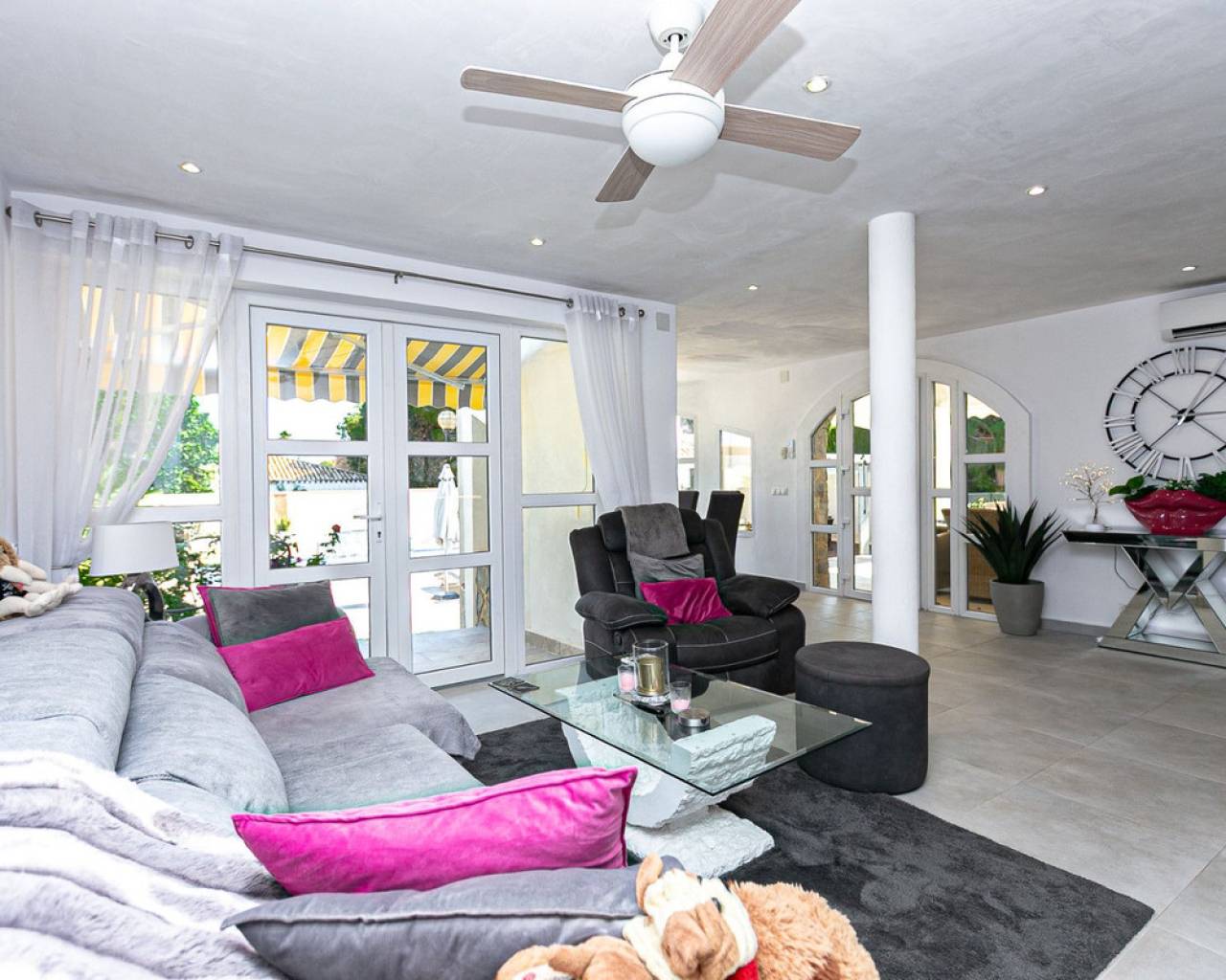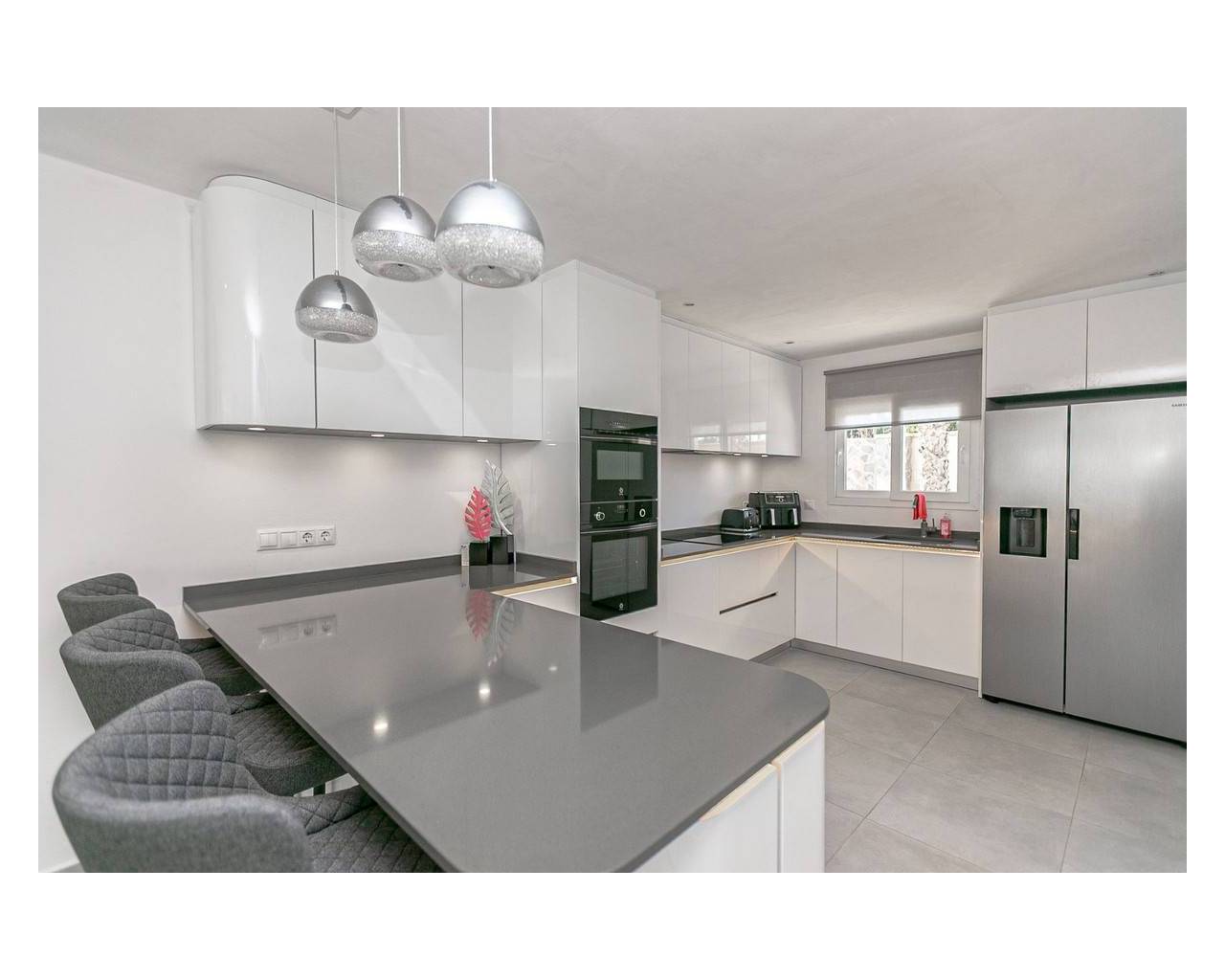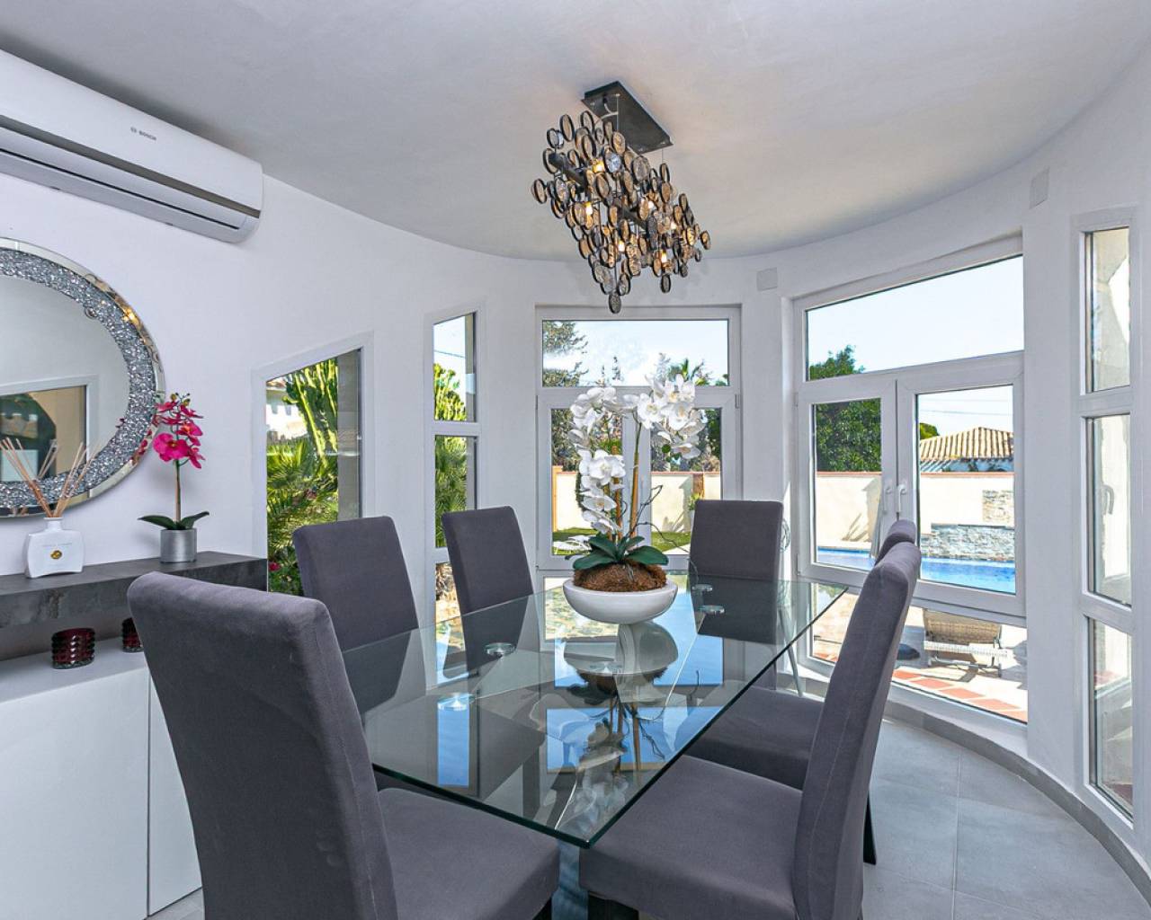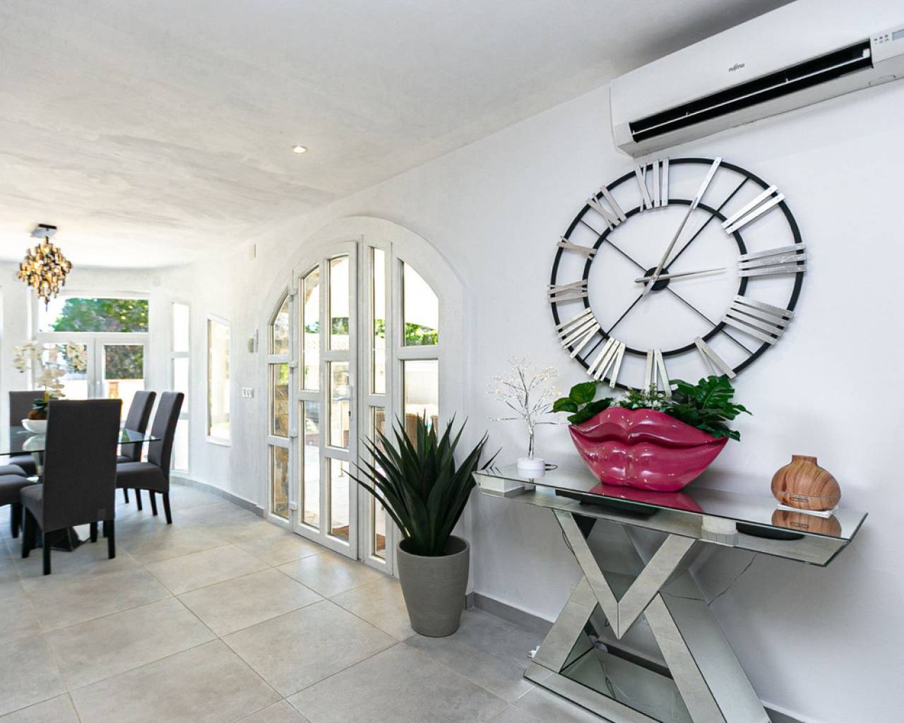 We are proud to present this detached villa located in the prestigious residential area of Lomas de Don Juan, close to Cabo Roig and the renowned beaches of Campoamor and La Zenia. This stunning single-level property has been elegantly renovated to the highest standards, combining contemporary luxury with the charm of its original Mediterranean character.Set on a generous 1,300 m² private plot, the villa offers a total built area of 344 m², surrounded by beautifully landscaped, low-maintenance gardens and complete privacy within its secure perimeter walls. Despite its peaceful and residential setting, the property is within walking distance of a variety of local amenities including restaurants, cafés, bars, supermarkets, and just minutes from several prestigious golf courses and the blue-flag beaches of the Orihuela Costa.Upon entering through a large, covered front terrace, you are welcomed into an open-plan living and dining area filled with natural light, seamlessly connected to a state-of-the-art kitchen equipped with premium integrated appliances and an American-style fridge-freezer.The villa comprises six spacious bedrooms and four modern bathrooms, including a luxurious master suite and an additional bedroom currently used as an office/sports lounge. Each bedroom features fitted wardrobes and French doors, providing direct access to the outdoor areas. The rear bedrooms enjoy beautiful views of the pool and garden and share a large bathroom with a walk-in shower and a freestanding bathtub.The interior renovation, completed in 2024, includes top-quality finishes, flooring, lighting, and fixtures throughout, ensuring both comfort and sophistication.The outdoor area is equally impressive, featuring a 9 x 6 metre private swimming pool, a stone-built gazebo with a fully equipped bar, glass curtains, and a lounge area — perfect for entertaining all year round. There is also a large retractable awning providing shade and multiple seating areas to enjoy the Mediterranean climate.Additional features include:Solar water heating systemIndependent air conditioning units in all roomsGas fireplace in the main living areaAlarm system and double garageTwo external storage roomsOption to create an independent 2-bedroom, 1-bathroom guest apartment with its own lounge and kitchenette, ideal for guests or rental income.This property represents a rare opportunity to acquire a luxurious, move-in-ready villa in one of the most desirable locations of Orihuela Costa — combining elegance, functionality, and Mediterranean lifestyle in perfect harmony.