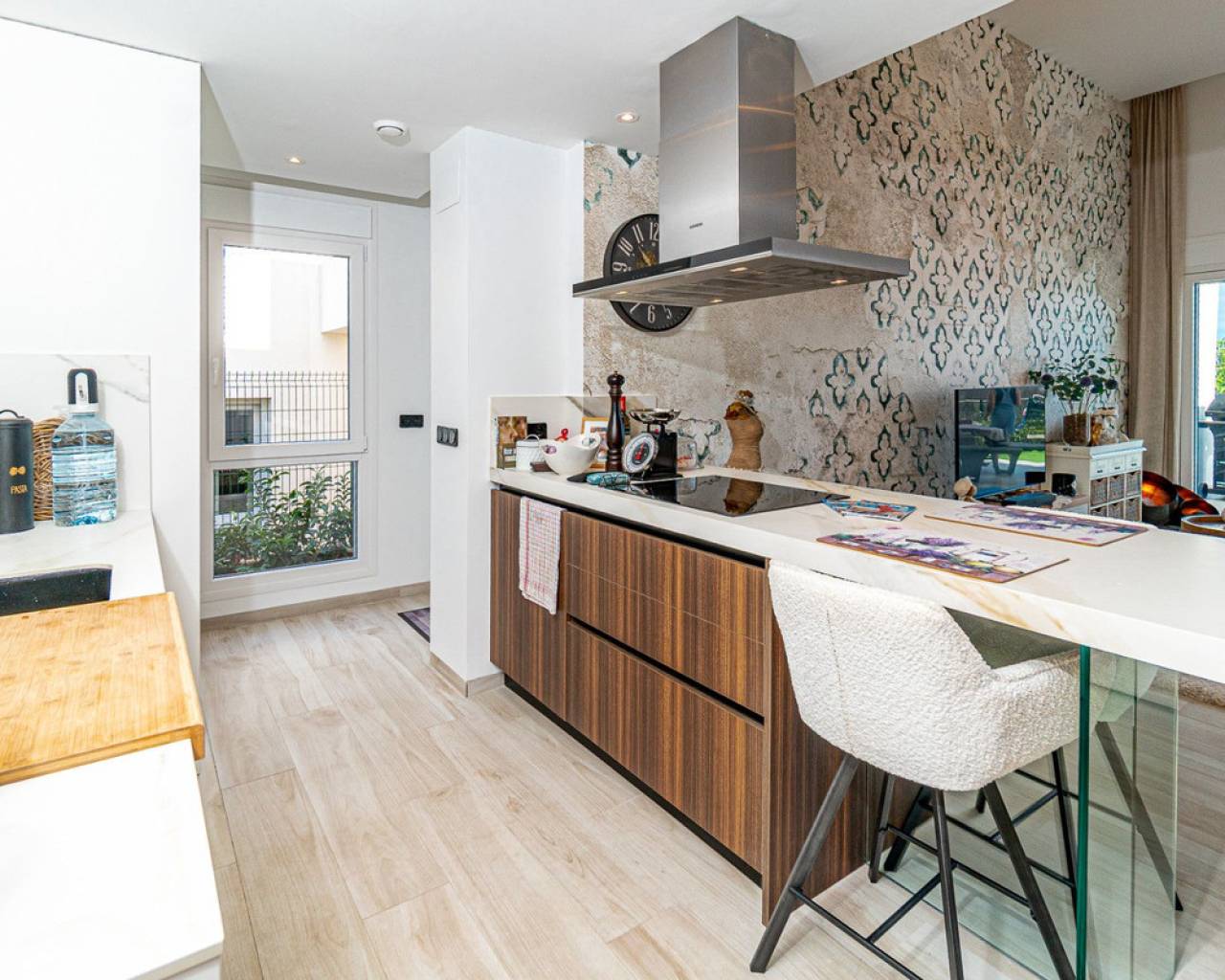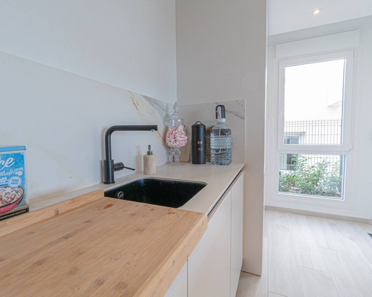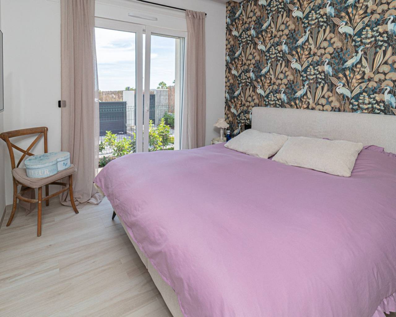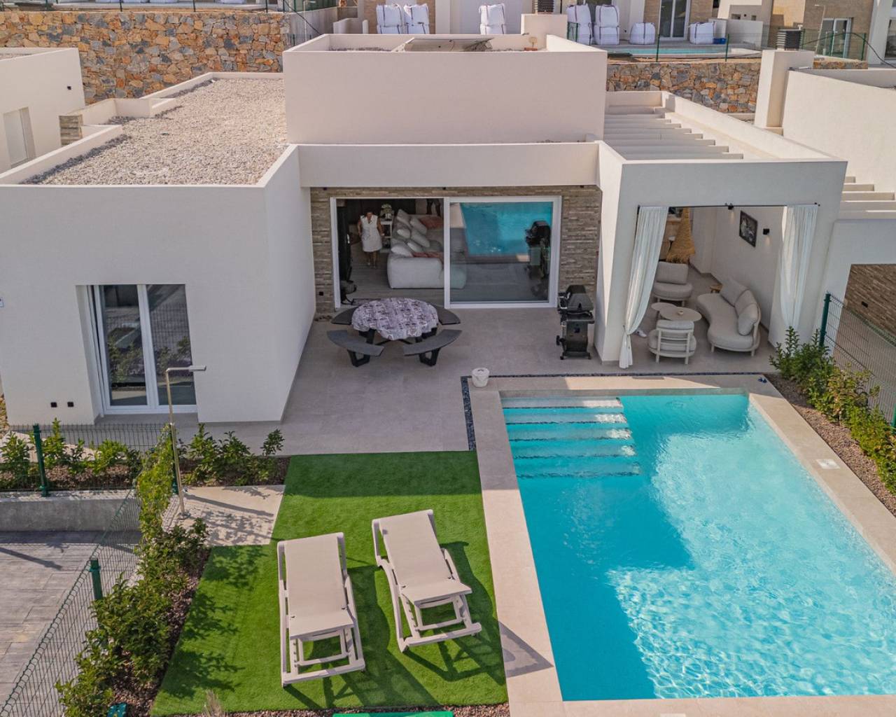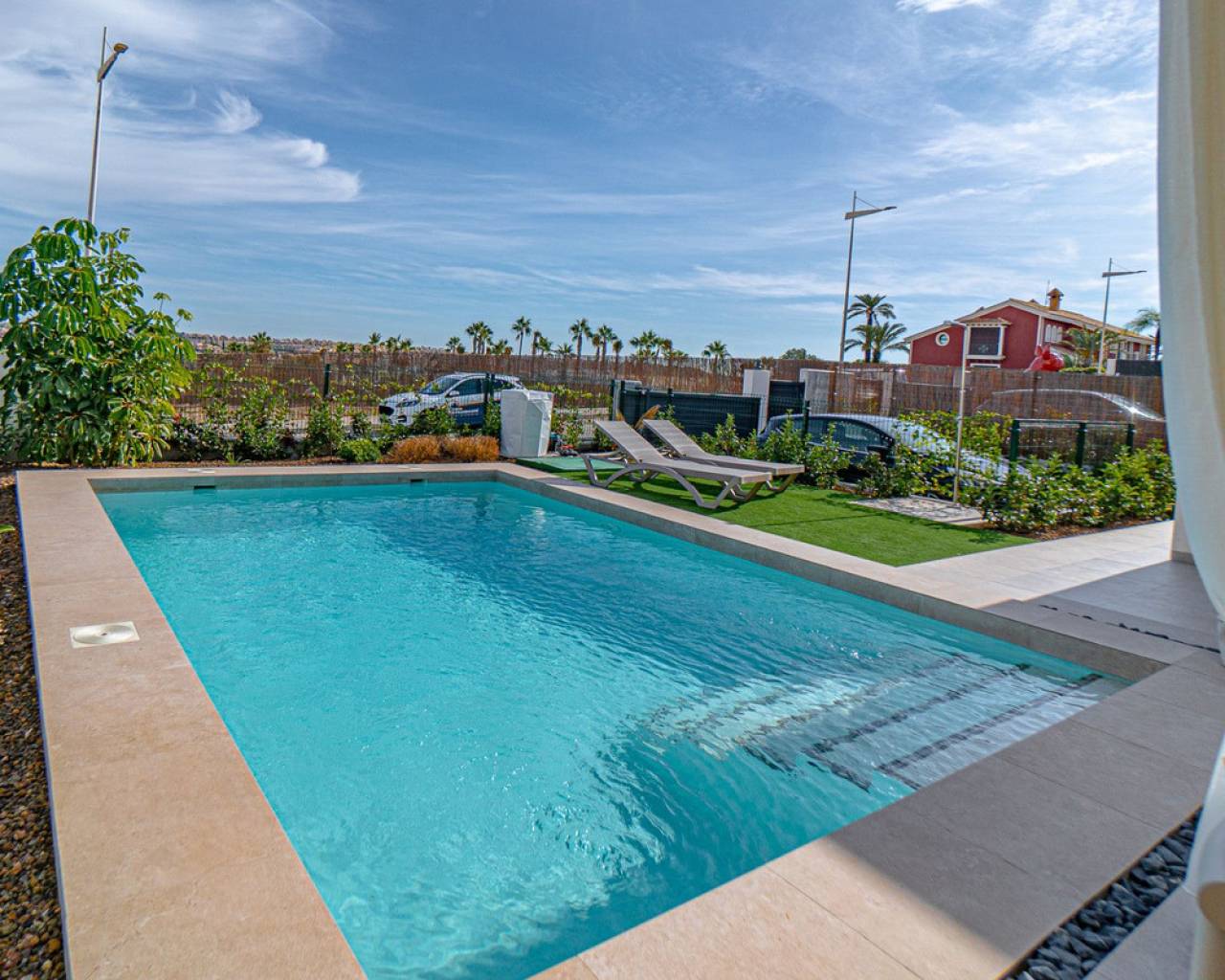 We are pleased to present this stunning luxury villa with panoramic views due to it´s elevated position at the 5 star La Finca Golf course. This impressive modern home is a perfect example of a resale of a new build without the wait and packed with luxury extras. The home offers a vast living/dining space, typically not seen in such homes, and offers the perfect area for leisure and entertainment, there is still ample space for a formal dining area or you can sit at the large island leading to the high end kitchen, which features floor to ceiling integrated cabinetry, ample work top space and top of the range white goods, plus leading out to a utility area and to the side patio terrace. The home offers 3 bedrooms, the master suite comprises a spacious double bedroom with patio doors to the garden and sun terrace, large walk in dressing room, with ample storage and floor to ceiling mirror, plus luxury shower room with his and hers sinks. The further 2 guest bedrooms both feature integrated wardrobes with ample storage space and share a further modern shower room. The whole home inside presents like a show room and has been made unique by the owners eye for detail and shows clearly their passion for interior design. Each piece and all decor has been lovingly chosen to integrate sympathetically with the wood and stone design, yet brings a touch of class to each room. The villa is set on a low maintenance plot of over 400m2 with sun terrace to the front offering some shade from the Spanish sun and is the perfect space for al fresco dining, likewise a sunny corner along with an summer kitchen/bar area offers the ideal spot for entertaining. The villa of course offers private swimming pool to cool off in the height of summer and the remainder of the plot is low maintenance with high quality tiles, gravel and artificial grass, a easy to access driveway offers secure gated parking, although there is ample quiet street parking outside the villa. Boasting stunning unobstructed mountain and country side views due to it´s elevated position this home offers everything a discerning buyer could wish for. This stunning villa will be sold part furnished although inventory can be discussed dependent on offers and is sold with many extras including integrated white goods, air conditioning, remote controlled blinds and gates, plus much more. Located a mere 200m to the La Finca Golf hotel Spa and club house , ideal for golf lovers for those extended holidays or ideal for permanent living as under 3km to both the traditional village of Algorfa which offers Spanish charm,local restaurants, bars, local shops and the traditional village square and the commercial area at La Finca also noted for some quality restaurants, cocktail bars and much more. Around 17km to the beaches of Guardmar del Segura , La Mata and Torrevieja, meaning you are never far from the coast. This home must be seen to be appreciated and is even more stunning in real life. Contact us today for your viewing
