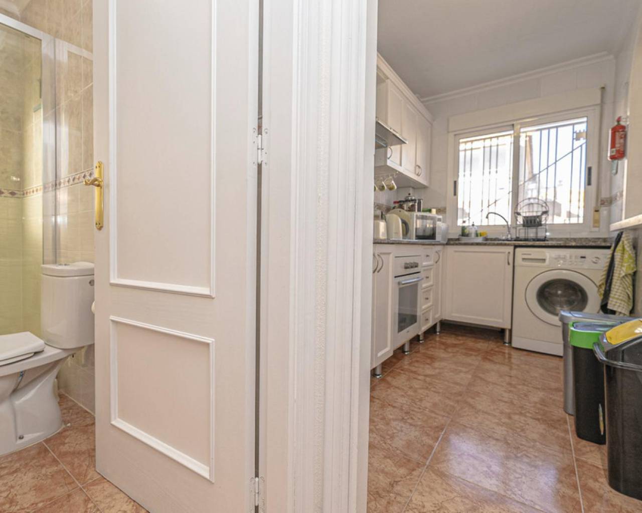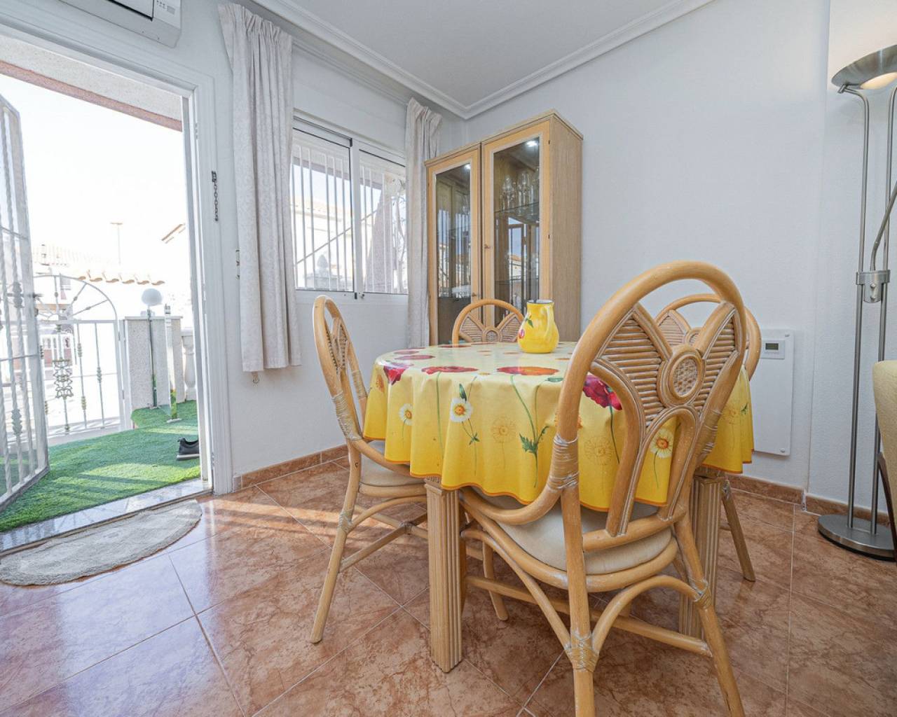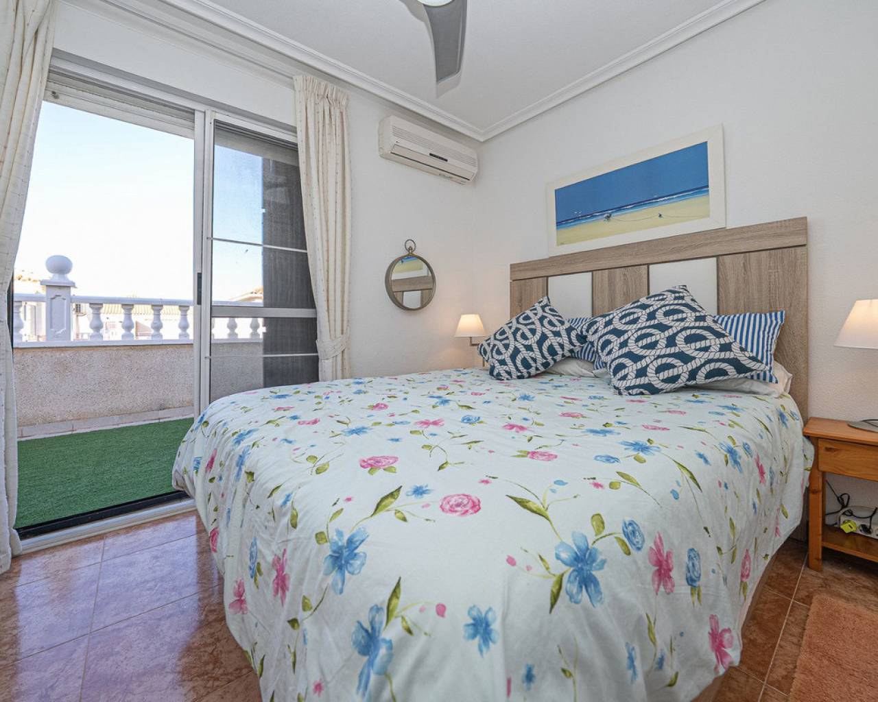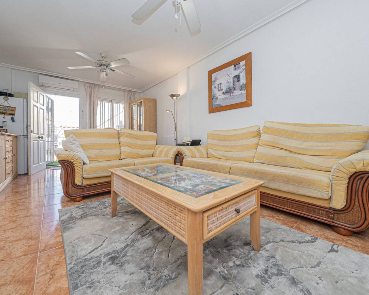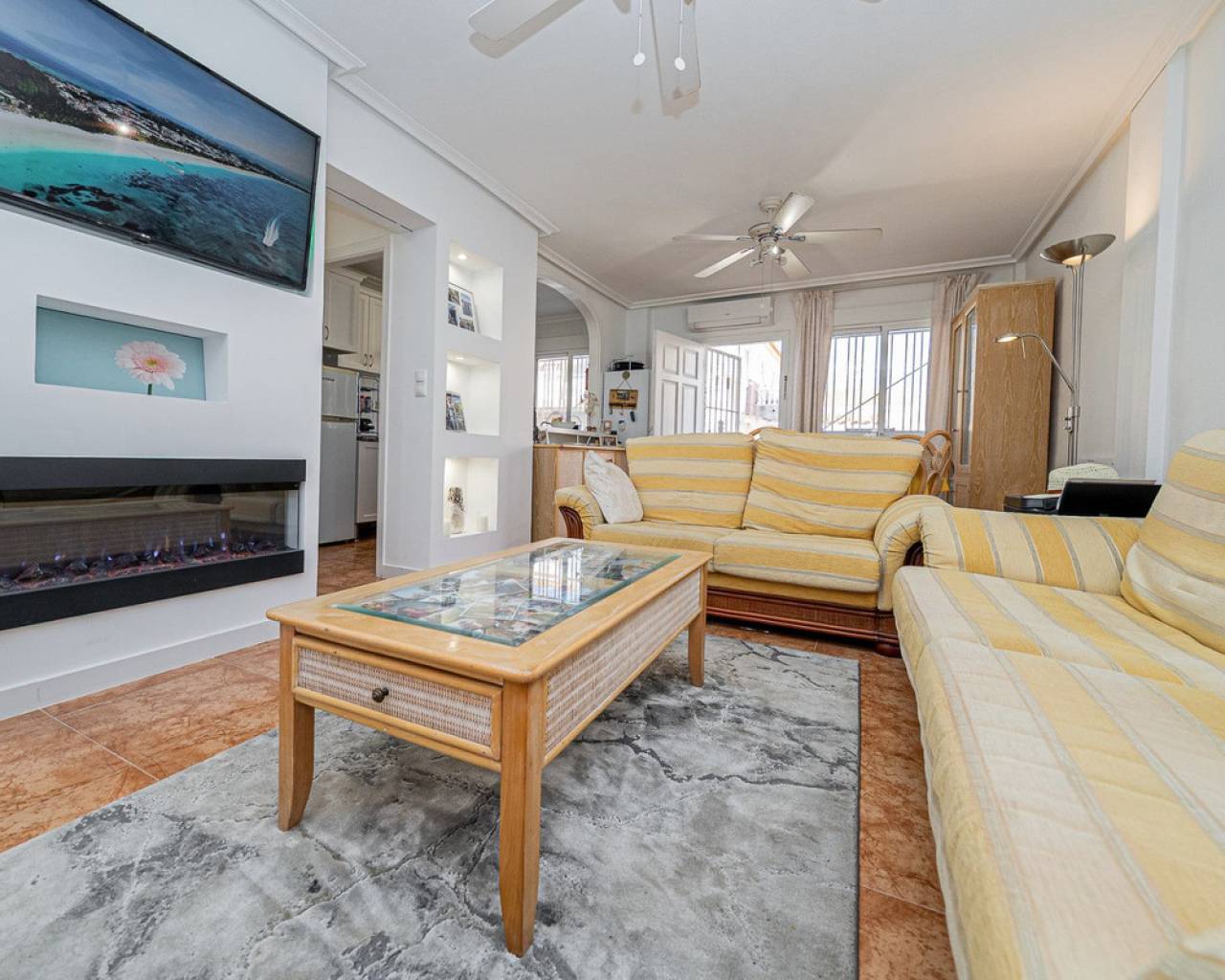 Well presented 3 bedroom 2 bathroom quad villa in the La Regia area of Cabo Roig. This charming home is in excellent condition and ideal for holidays or permanent living. The living room/dining room is open plan with ample space and renovated, built in wall display unit, semi open modern fitted kitchen with American breakfast bar, spacious under-stairs storage room, plus for added convenience a ground floor bathroom, with walk in shower, double bedroom, The second floor offers a further 2 double bedrooms both with access to private balcony terraces and a fully renovated bathroom with walk in shower, Outside space offers ample terraces, patio garden laid to artificial grass and tiles with newly installed glass panels and on site parking. The property benefits from air conditioning, infrared panel heaters, ceiling fans, pvc guttering, white goods, part renovated and fully furnished and is totally key ready. Charming community with communal swimming pool, gardens, football pitch, and children´s park, Quiet location walking distance to the renowned Cabo Roig strip (Under a 10 minute walk) which hosts many shops, cafe- bars restaurants and supermarkets, the sandy blue flag beach of La Caleta, Cabo Roig is under a 15 minutes walk, and only a short drive to the La Zenia boulevard shopping centre and many first-class golf courses. Contact us today for a viewing.