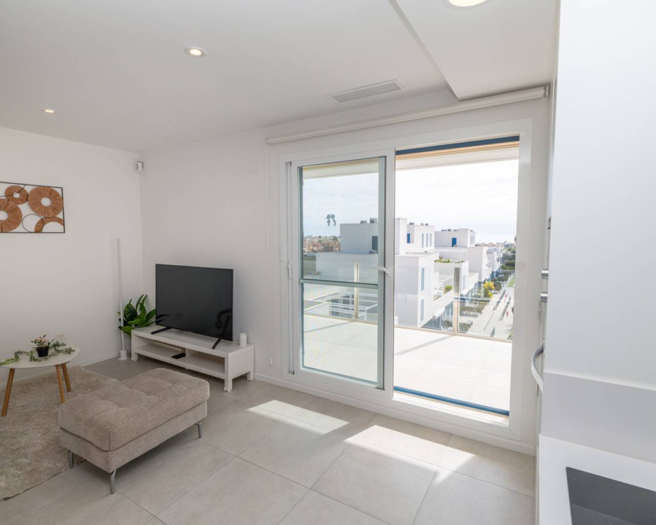 In an exceptional coastal location in Playa Flamenca, this stunning penthouse offers breathtaking views of the Mediterranean Sea. A unique property for those who want to enjoy peace, comfort and a privileged seafront setting. The property is bright, modern and fully move in ready. The living area feels open and spacious and connects seamlessly to the sunny terrace. The fully equipped kitchen and the comfortable bedroom with built in wardrobes ensure a pleasant level of comfort, both for personal use and rental purposes. The terrace is without doubt one of the main highlights of this penthouse. Thanks to its ideal orientation, you can enjoy both sea views and views of the communal pool. A perfect place to have breakfast in the morning sun or relax during long warm evenings. An additional advantage is the possibility to purchase two spacious underground parking spaces separately in the secured garage of the complex, a rare asset in this area. The location is excellent. Within walking distance you will find the beaches of Playa Flamenca, various shops, supermarkets and restaurants, as well as the popular shopping centre La Zenia Boulevard. Sports facilities and golf courses are also nearby. This penthouse is an ideal choice as a second home, rental investment or permanent residence on the Costa Blanca. A property that perfectly combines views, comfort and location.