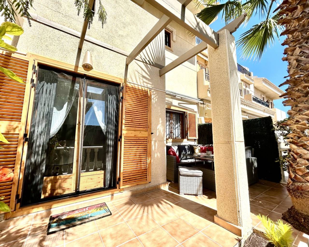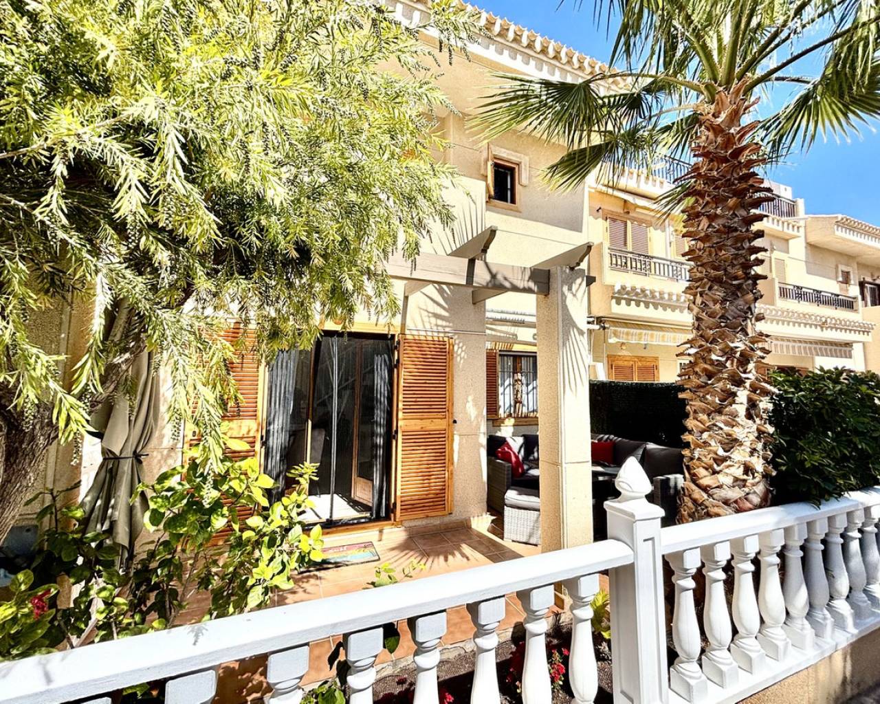 Located in the highly sought-after area of Playa Flamenca, this gorgeous and spacious 2-bedroom, 2-bathroom townhouse offers the perfect combination of comfort, convenience, and Mediterranean lifestyle. Set within a secure gated urbanisation, the property provides both privacy and peace of mind, while benefiting from access to a well-maintained communal pool—ideal for relaxing and enjoying the sunshine. The home itself is beautifully presented and truly walk-in ready, featuring bright, airy interiors filled with natural light. The generous living spaces flow effortlessly, creating a warm and inviting atmosphere throughout. A sunny terrace at the front of the property offers the perfect spot for outdoor dining or simply unwinding in the sun. Upstairs, the master bedroom boasts its own private sunny balcony, creating a retreat to enjoy your morning coffee or evening breeze. A central heating system connected to mains gas ensures year-round comfort, making this home ideal for both permanent living and holidays. Additional features include a private garage, adding both convenience and valuable storage space. Perfectly positioned within walking distance to the famous Playa Flamenca Market and the ever-popular La Zenia Boulevard, as well as a wide range of restaurants, bars, and everyday amenities, this property offers an unbeatable location. Whether you're looking for a permanent residence, holiday home, or investment opportunity, this exceptional townhouse ticks all the boxes.