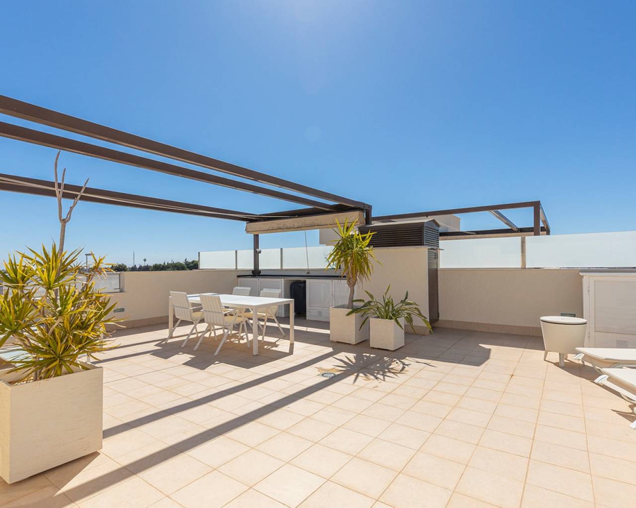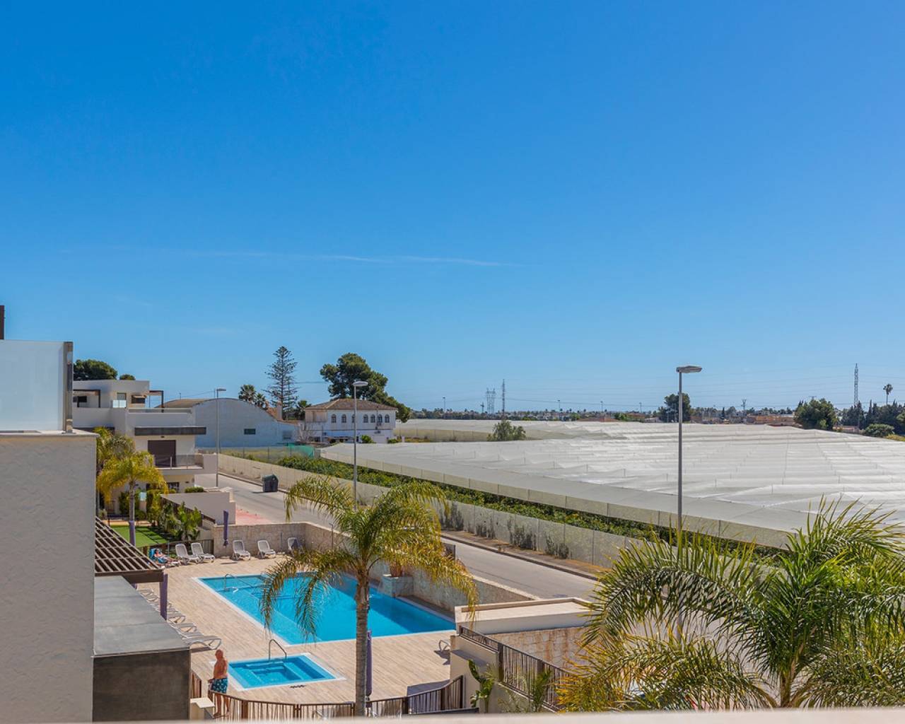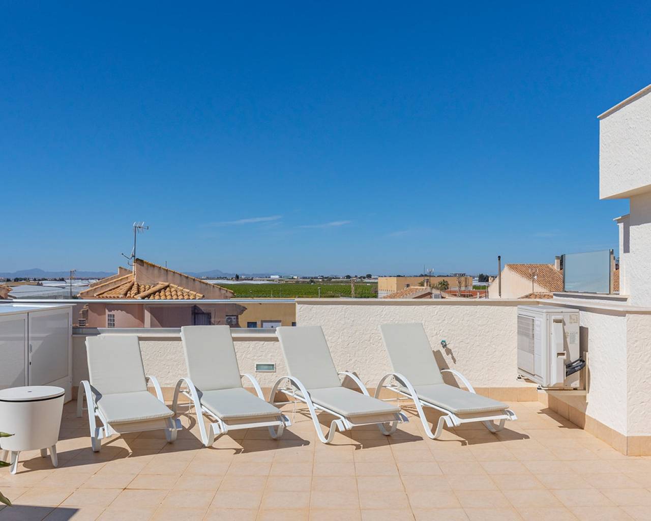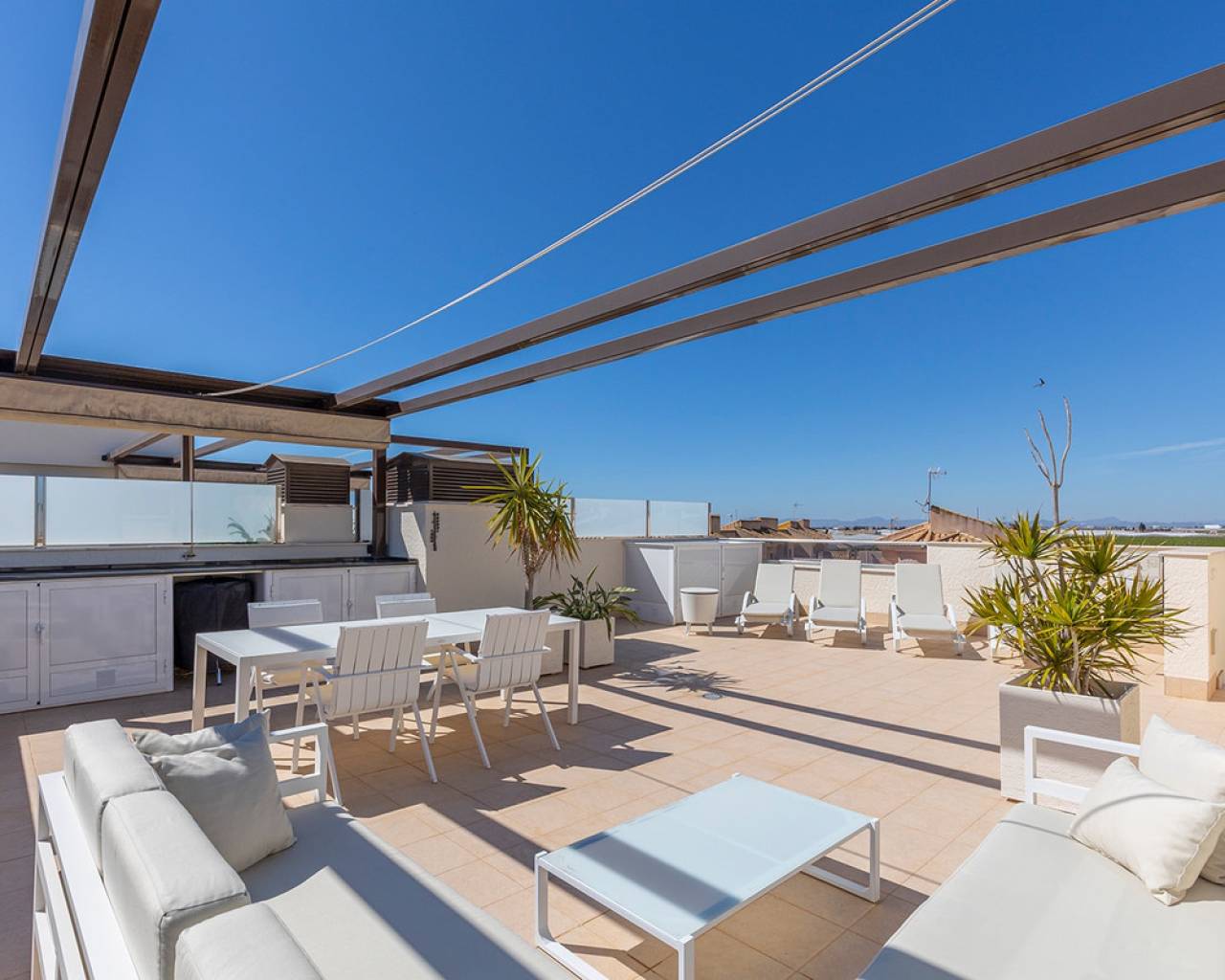 Welcome to this stunning, modern penthouse where comfort, tranquillity and luxury come together. Situated in a peaceful neighbourhood, this property offers the ideal setting to enjoy the Mediterranean lifestyle. The penthouse features two spacious bedrooms and two modern bathrooms, one of which is en-suite to the master bedroom. The property is finished to a high standard with quality materials and boasts a fully fitted, contemporary kitchen equipped with all modern conveniences. Adjacent to the living area is a cosy and spacious terrace with a sun awning. Fly screens are also fitted. One of the property's standout features is the spacious roof terrace. Here you will find a charming outdoor kitchen, perfect for long evenings with family and friends whilst enjoying the lovely climate. This property offers views of the communal swimming pool and jacuzzi, where you can relax and soak up the sun. A parking space is also included. Situated in the authentic Spanish village of Dolores de Pacheco, you can experience the tranquillity and charm of local life. There are numerous shops and amenities within a 10-minute drive. The location is ideal: just 4 km from the beaches of the Mar Menor, and for golf enthusiasts, Roda Golf is only 2 km away. Murcia Airport is a 25-minute drive away. Please do not hesitate to contact us for further information or to arrange a viewing.