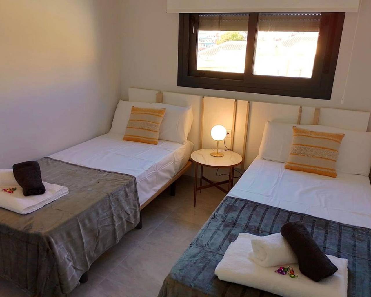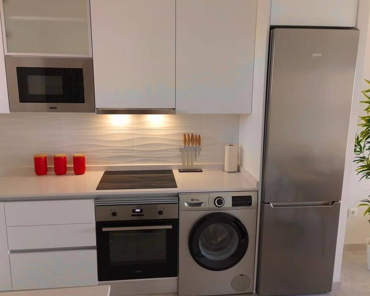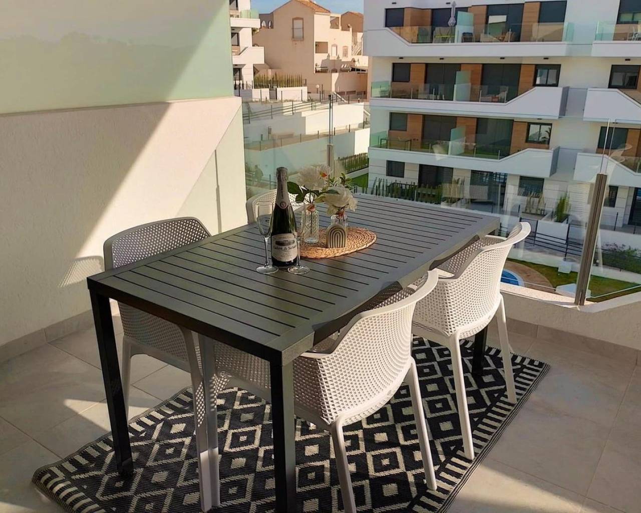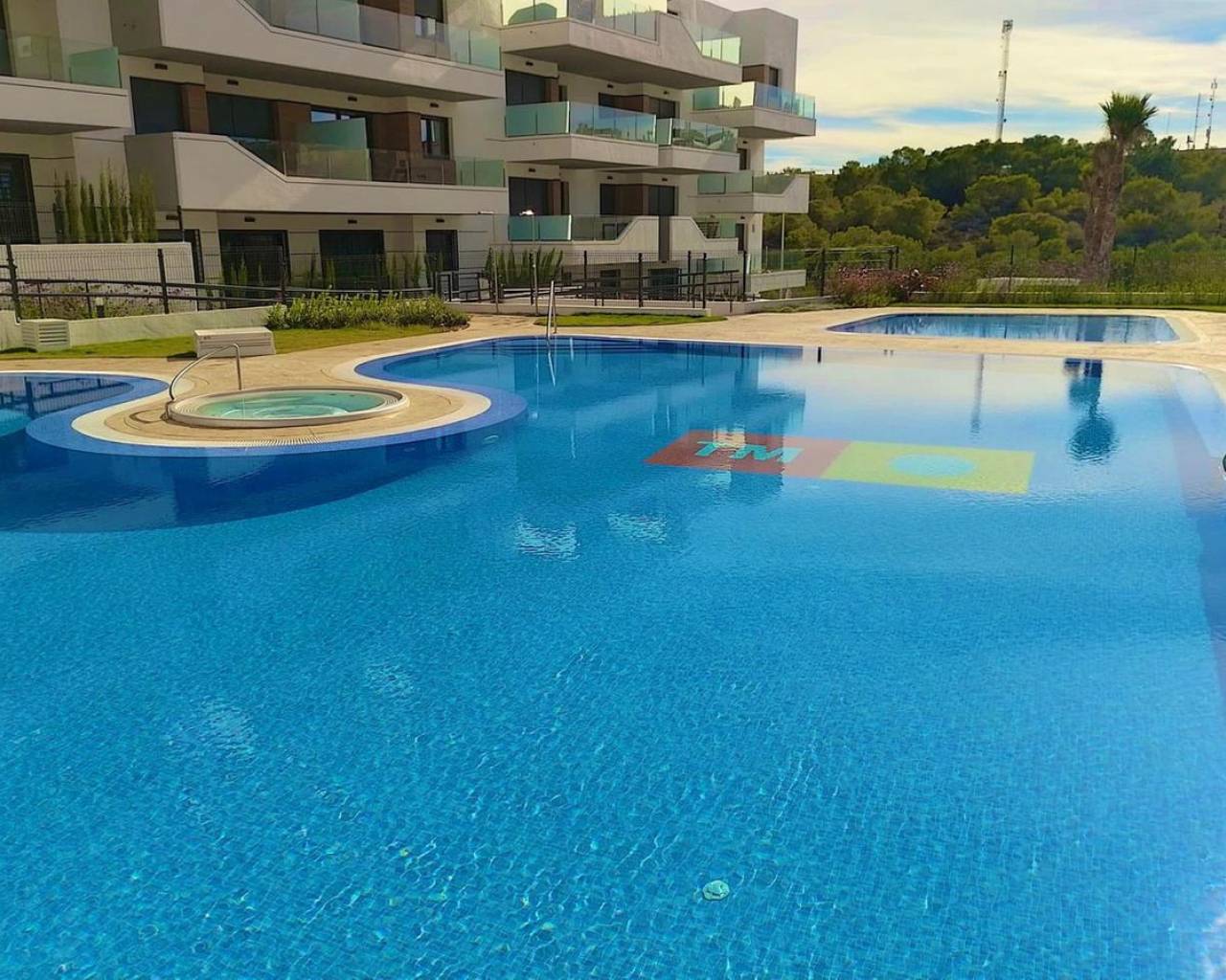 Modern luxury 2 bedroom apartment (on the second floor) in Villamartin, Alicante with beautiful communal gardens and swimming pools. The apartment will be sold fully furnished and consists of a spacious bright living/dining room, a modern fully equipped open plan kitchen, two bedrooms with fitted wardrobes, two bathrooms (one is en-suite), air conditioning (hot/cold) throughout the property, intercom connected to the two pedestrian entrances to the residential complex included, and an allocated parking space in the garage. The communal areas are roughly 4.400sqm big and there are two swimming pools, jacuzzi, children's playground, and 2 petanque courts. Wi-Fi will be available in all communal areas. Designed to fulfil the needs of those who are looking for the Mediterranean lifestyle, in a quiet are in a quiet but well established area and yet close to the sea (8 minutes) and very close to all amenities. The gated community has a total of 94 units.
