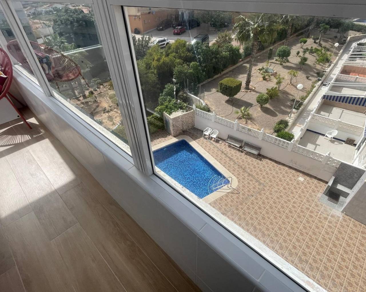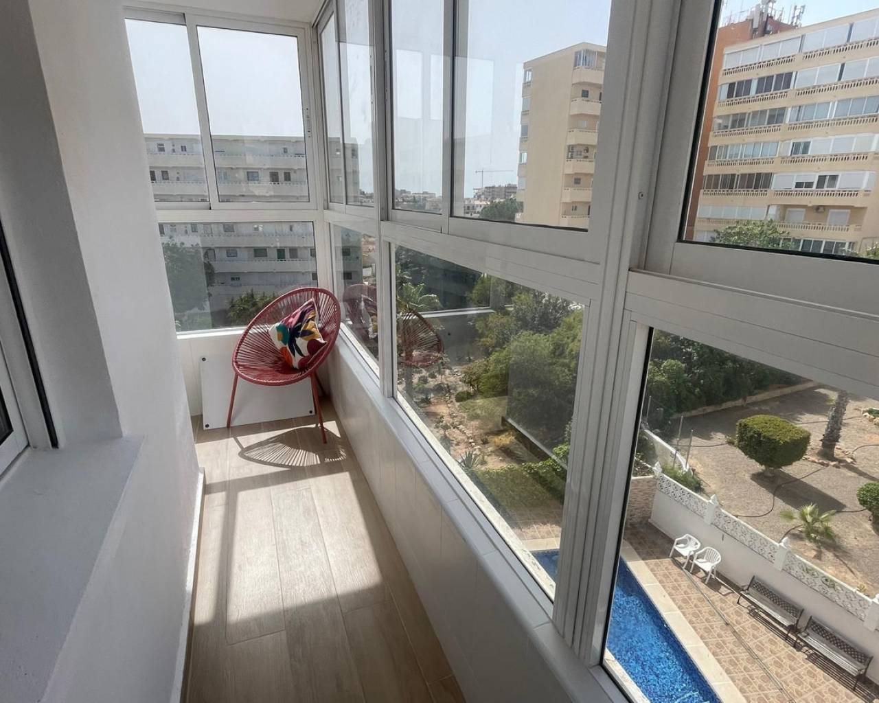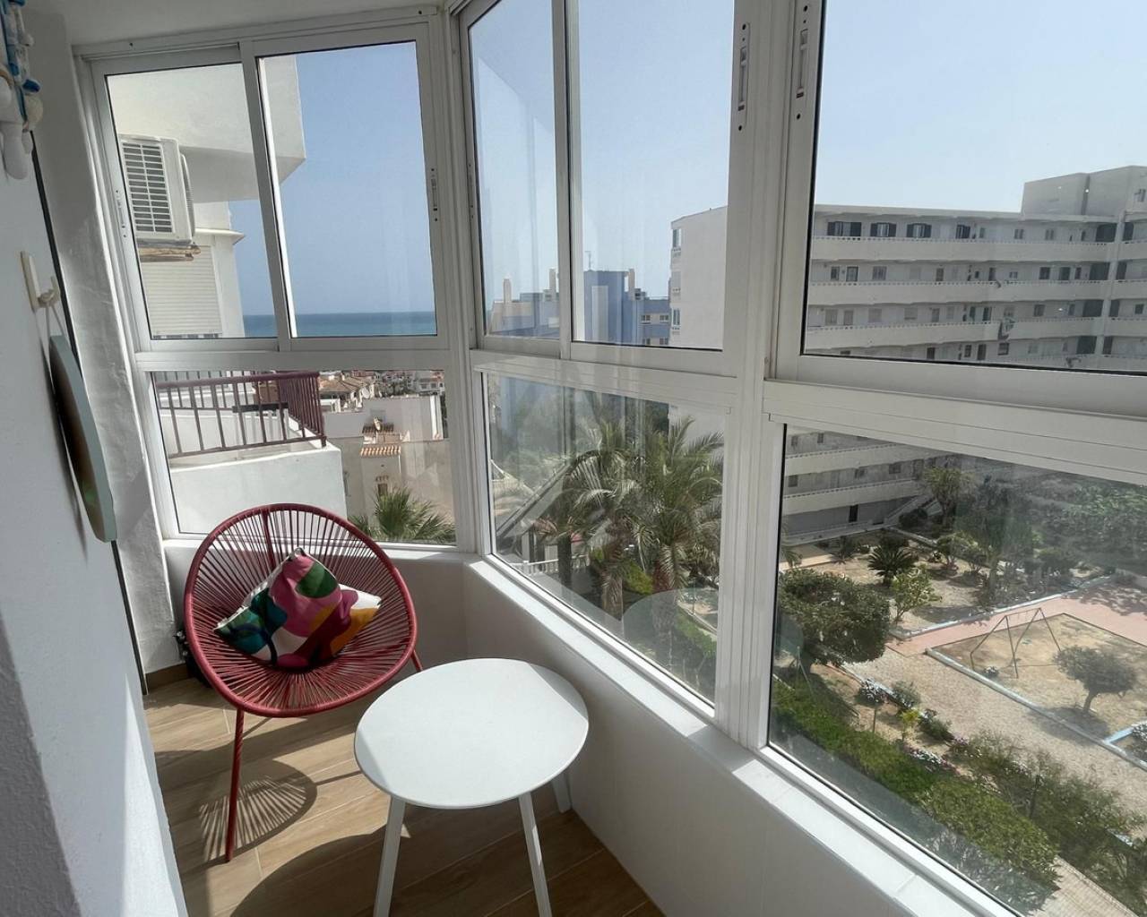 Beautifully Renovated Studio with Sea Views – La Mata, Costa Blanca This fully reformed, south‑east–facing studio offers bright morning light, open sea views, and a modern finish throughout — the perfect lock‑up‑and‑go holiday base or an ideal first step onto the thriving Costa Blanca property ladder. The property features a spacious enclosed wraparound terrace, providing an extra living area that can be enjoyed all year round. Inside, the studio has been renovated to a high standard, including a stylish open‑plan American‑style kitchen. It is sold fully furnished and ready to move straight into. Located just 800 metres from the beach, you'll have easy access to shops, restaurants, and essential services. The well‑maintained communal pool area offers ample seating and a relaxed atmosphere for enjoying the sunshine. Nestled above the charming seaside village of La Mata, and only a 5‑minute drive from the larger town of Torrevieja, this property combines tranquillity with convenience. A smart, affordable option in a highly desirable coastal area — ideal for holidays, rentals, or year‑round living. Middle Floor Studio, La Mata, Costa Blanca. Built 30 m², Terrace 5 m². Orientation : South. Condition : Excellent, Good, Recently Renovated. Pool : Communal. Climate Control : Air Conditioning. Views : Sea, Mountain, Panoramic. Features : Covered Terrace, Lift, Near Transport, Private Terrace. Furniture : Fully Furnished. Kitchen : Fully Fitted. Garden : Communal. Security : Gated Complex, Entry Phone. Parking : Private.