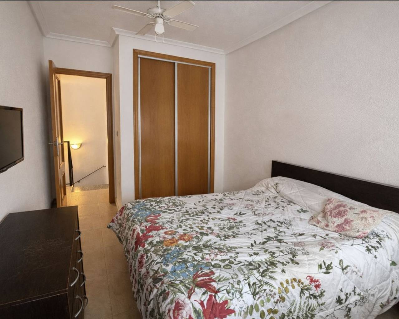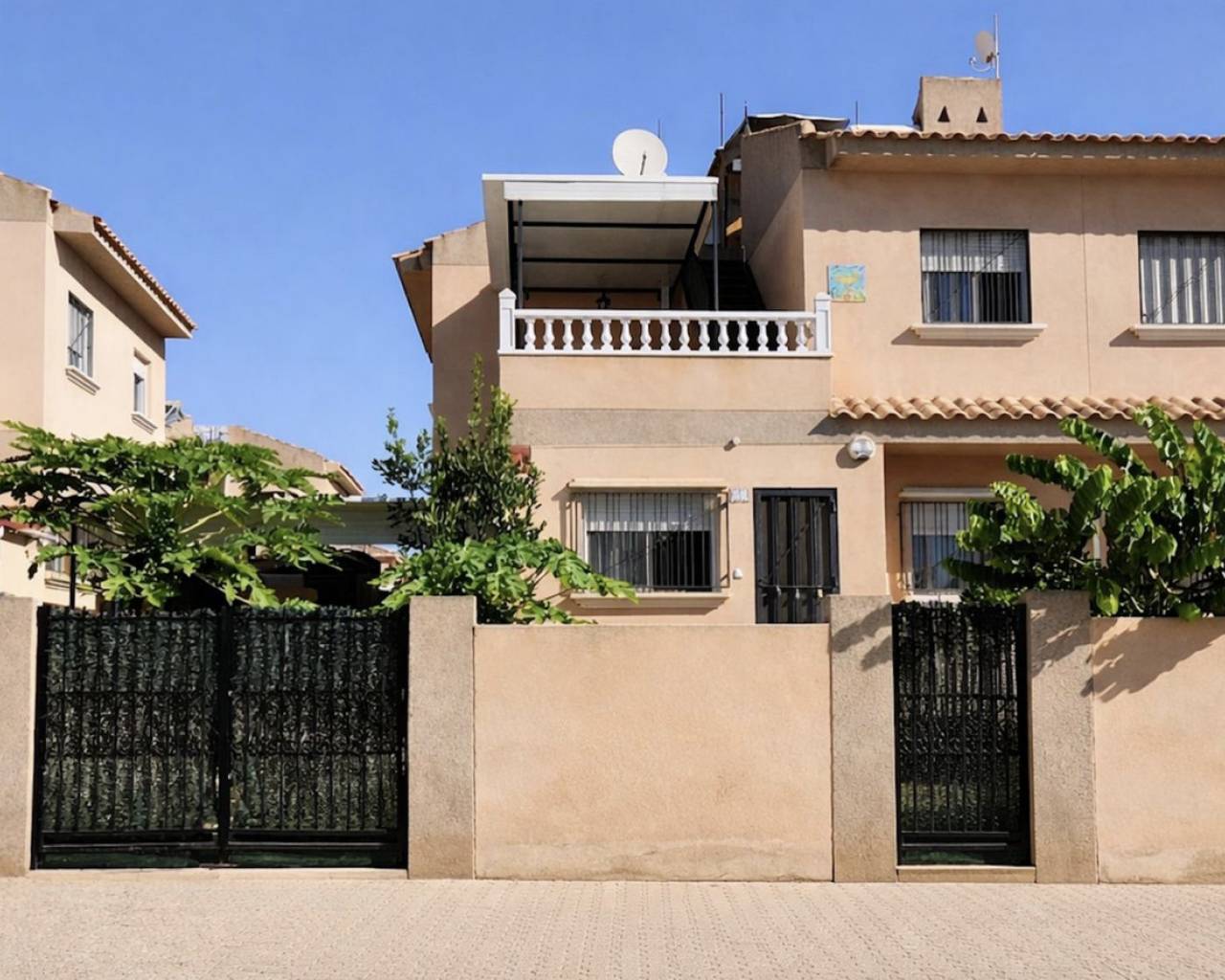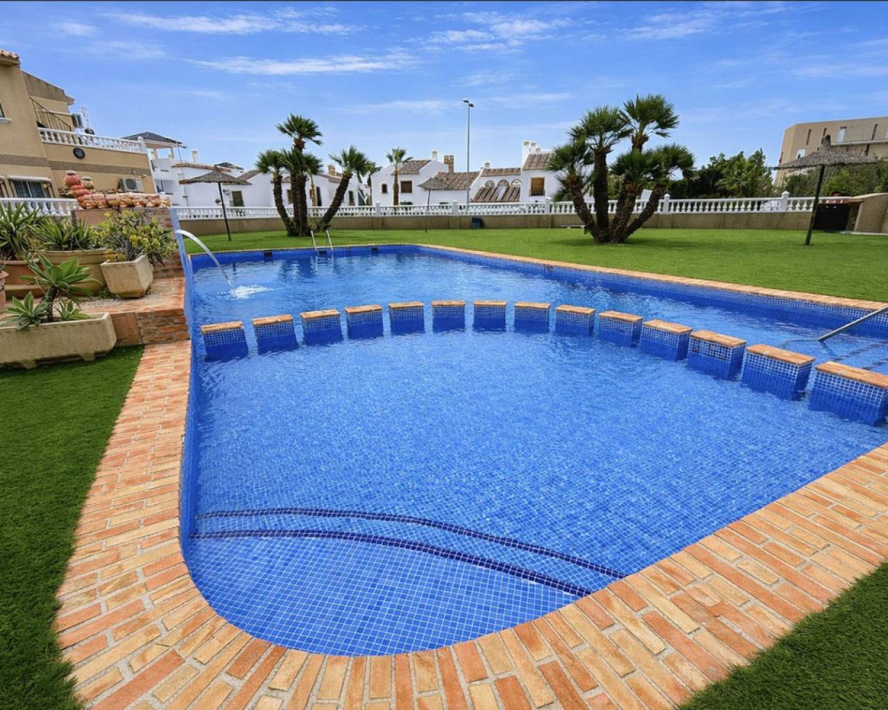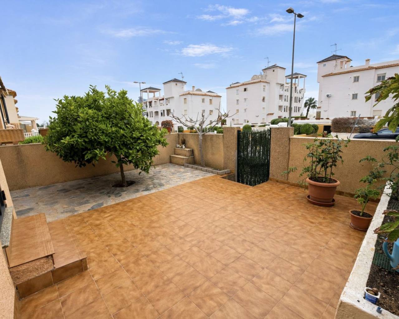 Beautiful South-Facing Semi-Detached House with Private Solarium, Parking & Communal Pool Bright and sunny semi-detached house enjoying an excellent south-facing orientation, providing natural light throughout the day. The property is distributed over two floors plus a private solarium and offers spacious indoor and outdoor living areas, ideal for permanent living, holidays, or investment. On the ground floor, the property features a spacious living room with open-plan fully equipped kitchen, one bedroom, a full bathroom, and a storage room. There is also ample additional storage space under the stairs, maximizing practicality and organization. To the front of the property, you will find a large open private terrace of approximately 20m², perfect for outdoor dining and relaxing, featuring water access and an outdoor shower, ideal for cooling off during warm summer days. The terrace also includes private covered parking with space for up to 2 cars, complete with electricity access. Additional parking is always available directly on the street. The house also benefits from private direct access from the street, offering convenience and privacy. On the first floor, there are two spacious bedrooms, a full bathroom, and a large covered terrace of approximately 15m². From here, stairs lead up to the very private rooftop solarium, complete with barbecue area and water access. This space offers fantastic potential and could easily be upgraded to include a private jacuzzi or sauna, creating a luxurious rooftop retreat. The home offers extensive storage throughout, including additional outdoor storage areas and further storage on the solarium. The garden area includes beautiful fruit trees, including papaya and lemon trees, adding charm and Mediterranean character to the outdoor space. Located within a well-maintained urbanization featuring a beautiful communal swimming pool surrounded by artificial grass and palm trees, the property is perfectly situated: Only 1.5 km from Villamartín Plaza, with supermarket, bank, bars, and restaurants Less than 2 km from Villamartín Golf Club Just 3.5 km from La Zenia Beach Approximately 50 km from the nearest airport The property is sold fully furnished and with appliances included, ready to move into immediately.