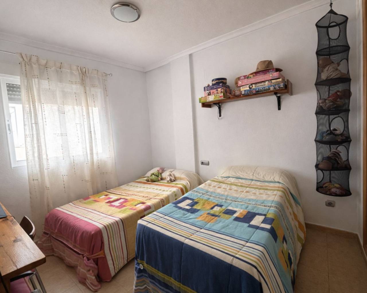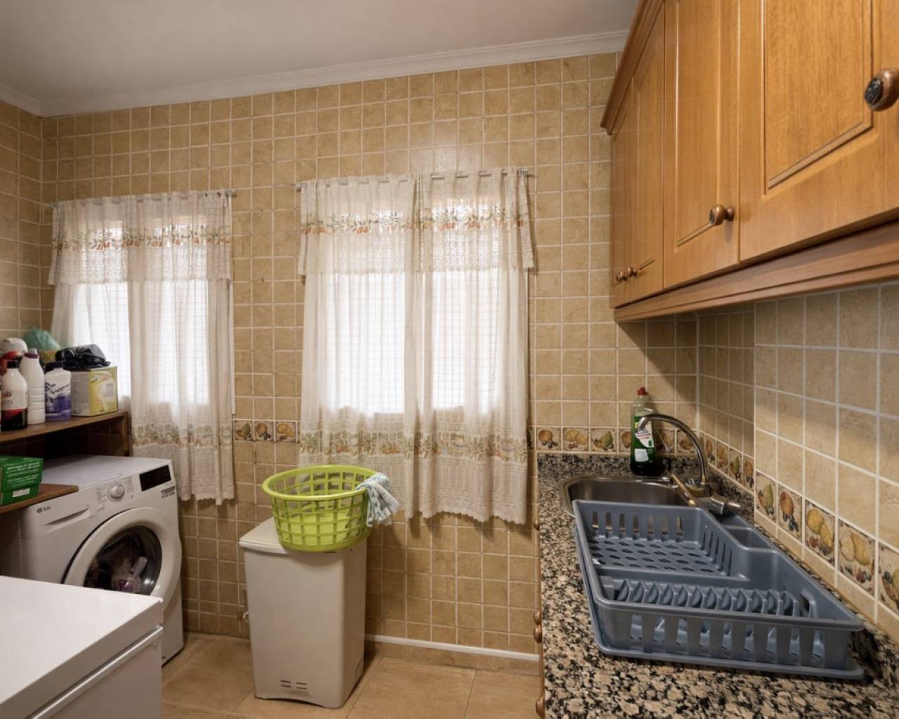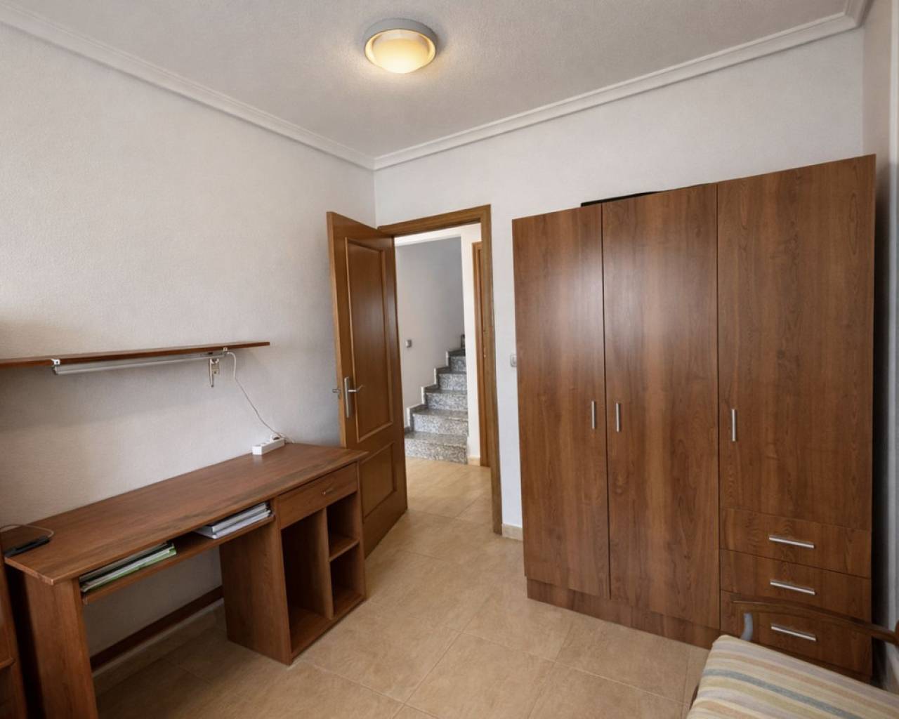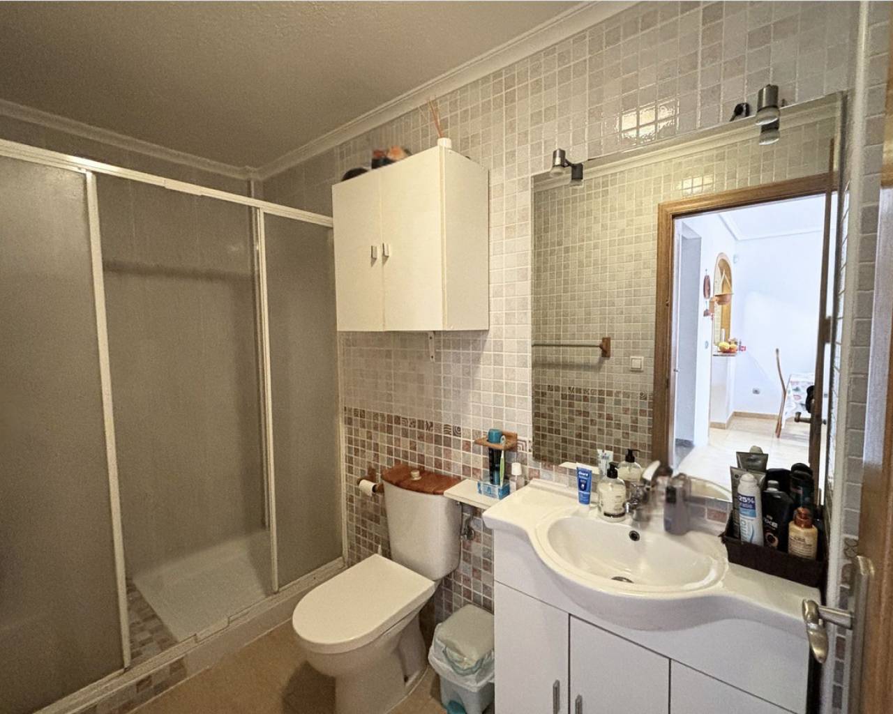 Beautiful South-Facing Semi-Detached House with Private Solarium, Parking & Communal Pool Bright and sunny semi-detached house enjoying an excellent south-facing orientation, providing natural light throughout the day. The property is distributed over two floors plus a private solarium and offers spacious indoor and outdoor living areas, ideal for permanent living, holidays, or investment. On the ground floor, the property features a spacious living room with open-plan fully equipped kitchen, one bedroom, a full bathroom, and a storage room. There is also ample additional storage space under the stairs, maximizing practicality and organization. To the front of the property, you will find a large open private terrace of approximately 20m², perfect for outdoor dining and relaxing, featuring water access and an outdoor shower, ideal for cooling off during warm summer days. The terrace also includes private covered parking with space for up to 2 cars, complete with electricity access. Additional parking is always available directly on the street. The house also benefits from private direct access from the street, offering convenience and privacy. On the first floor, there are two spacious bedrooms, a full bathroom, and a large covered terrace of approximately 15m². From here, stairs lead up to the very private rooftop solarium, complete with barbecue area and water access. This space offers fantastic potential and could easily be upgraded to include a private jacuzzi or sauna, creating a luxurious rooftop retreat. The home offers extensive storage throughout, including additional outdoor storage areas and further storage on the solarium. The garden area includes beautiful fruit trees, including papaya and lemon trees, adding charm and Mediterranean character to the outdoor space. Located within a well-maintained urbanization featuring a beautiful communal swimming pool surrounded by artificial grass and palm trees, the property is perfectly situated: Only 1.5 km from Villamartín Plaza, with supermarket, bank, bars, and restaurants Less than 2 km from Villamartín Golf Club Just 3.5 km from La Zenia Beach Approximately 50 km from the nearest airport The property is sold fully furnished and with appliances included, ready to move into immediately.