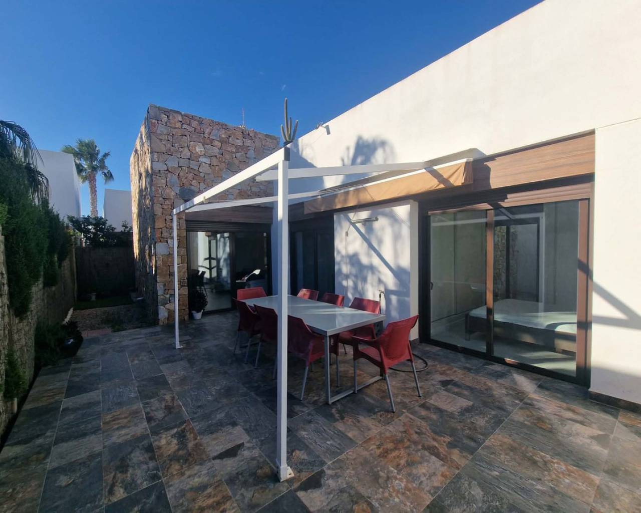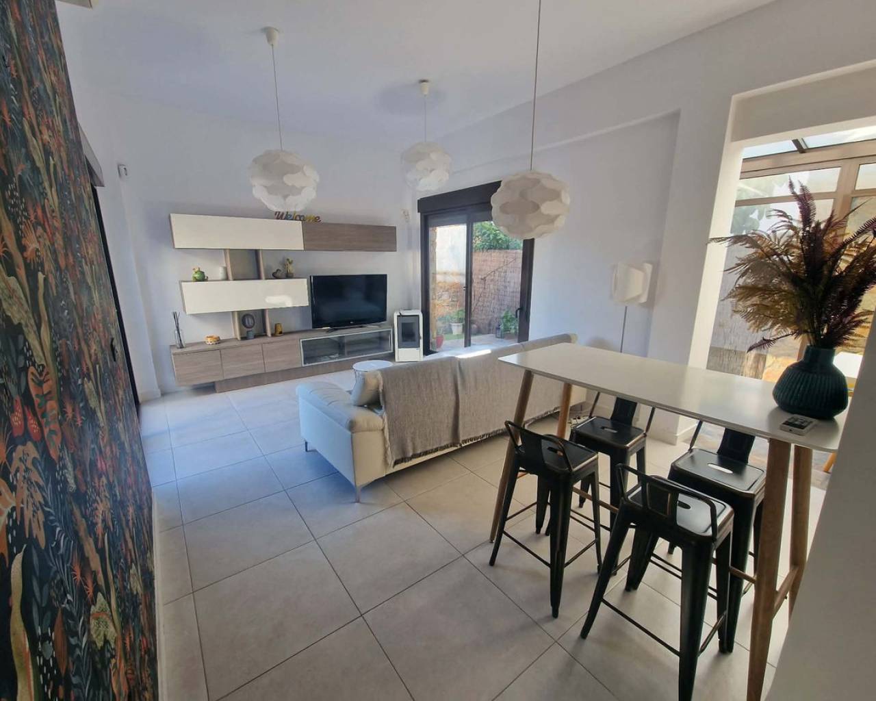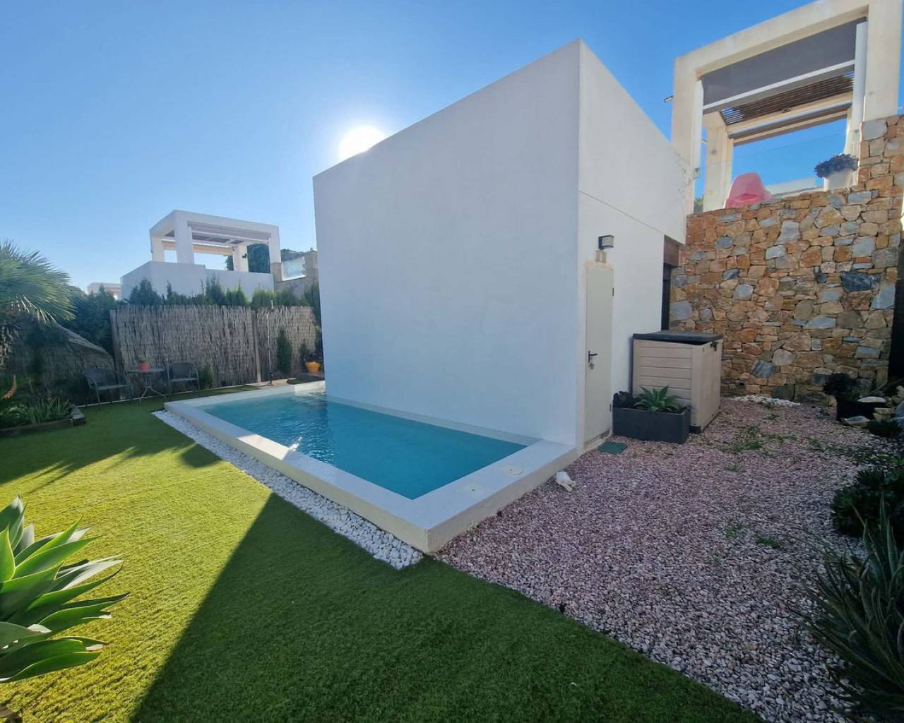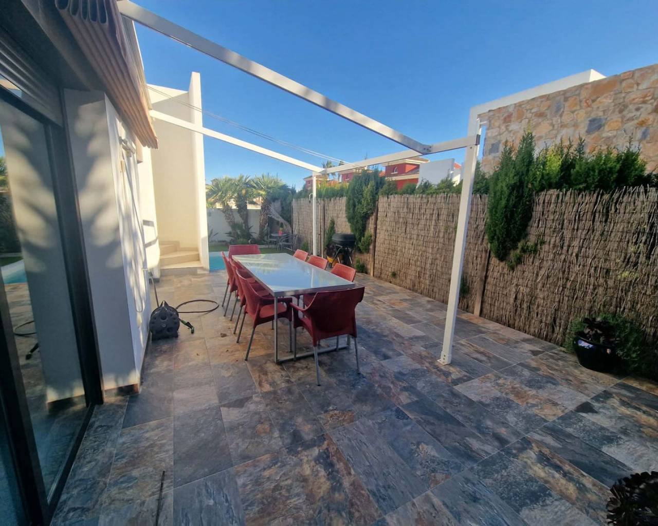 Welcome to Orihuela Costa. We are pleased to present a charming villa in mint condition. 2 bedrooms, 2 bathrooms, open-plan kitchen, bright dining room, living room with direct access to the garden and private swimming pool. Private sun terrace with sunshine all day long. Reversible air conditioning in every room. Pellet stove. Sold furnished. Alarm system. Painted 2 months ago. Parking space in front of the house. The Lomas de Cabo Roig neighbourhood is a quiet area, just 2.5 km from the seafront and beaches. Bars and restaurants 400 metres away. Mini-golf in the neighbourhood. 5 minutes' drive from the region's best golf courses. 60 km from Murcia and Alicante airports. Translated with DeepL.com (free version)