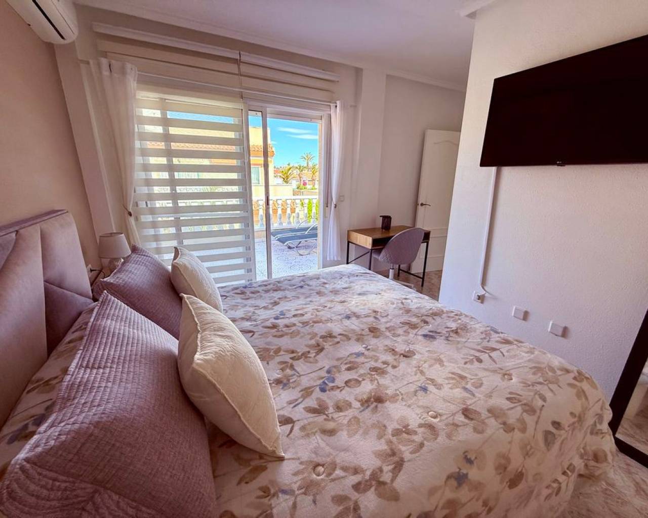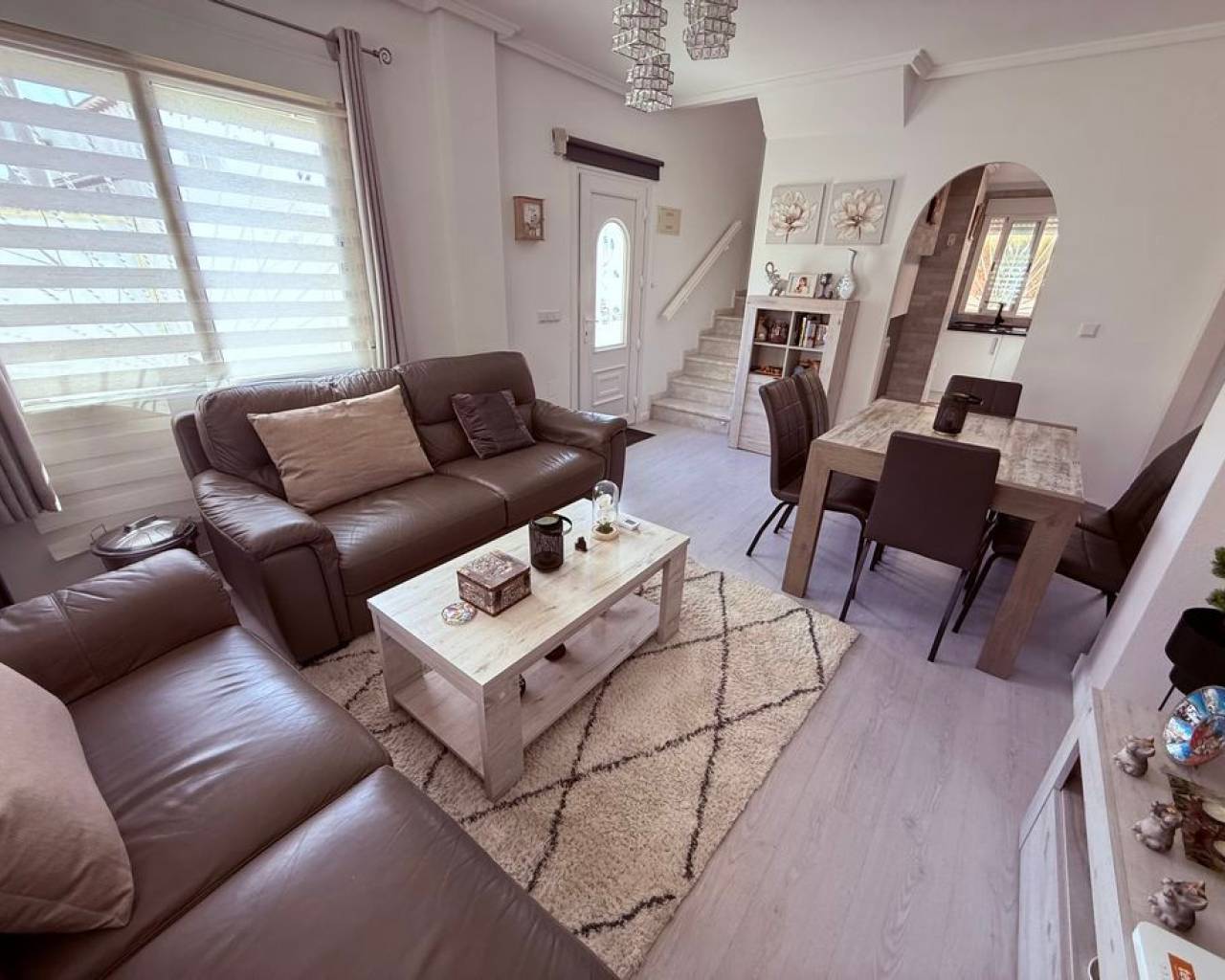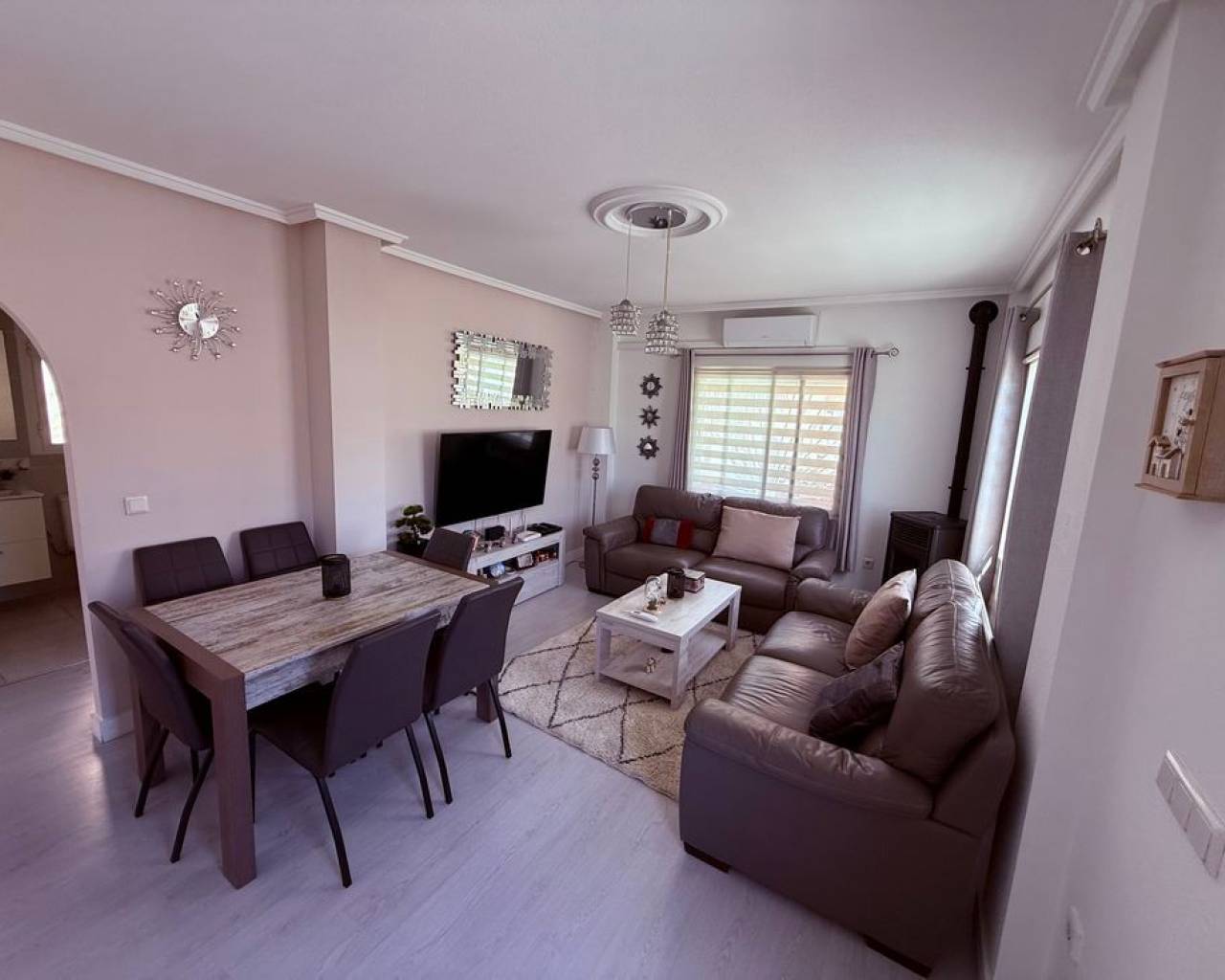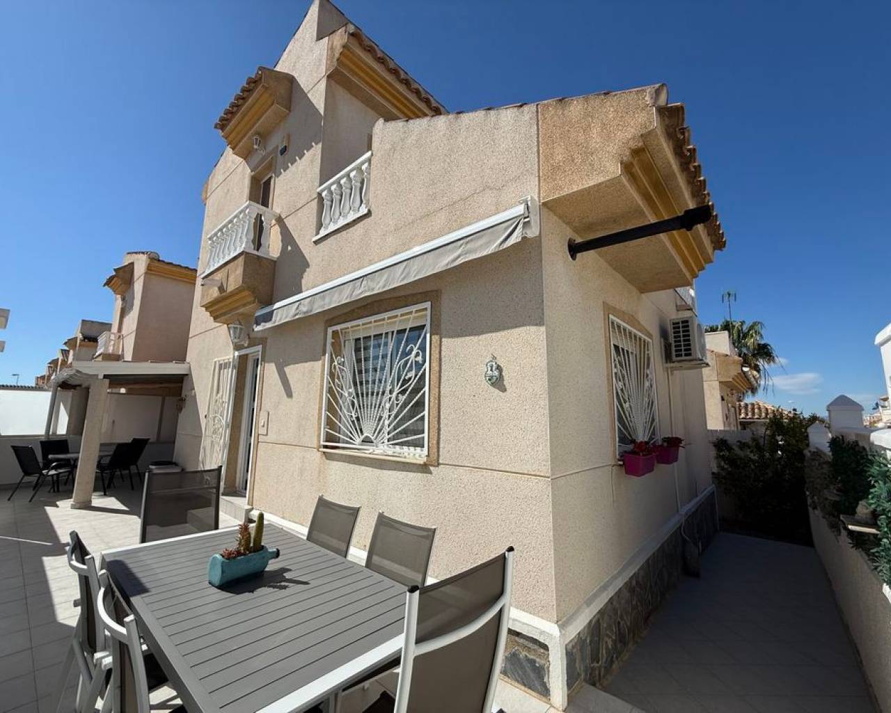 This beautifully presented detached villa, fully refurbished in 2023, is located in Ciudad Quesada, Rojales, in the sought-after Costa Blanca South, and offers stylish, comfortable living in excellent condition throughout. Set on a 135 m² plot with 88 m² built, the property enjoys an east-facing orientation, providing morning sunshine on the front terrace, complete with an awning for shade and privacy. The ground floor terrace is also particularly private, creating a peaceful and secluded outdoor space. The ground floor features a separate fully fitted kitchen complete with white goods including a dishwasher, washing machine, fridge freezer, oven and hob. The property is being sold unfurnished. There is also an open dining area and a bright living space with air conditioning and a pellet burner, which efficiently heats the entire home during the winter months. Two double bedrooms with fitted wardrobes and a modern family bathroom complete this level, all designed for practical and comfortable living. Upstairs, the property offers a charming and cosy seating area at the top of the landing, leading into the master bedroom with fitted wardrobes, air conditioning and a stylish en-suite bathroom. From the bedroom, you access a spacious private terrace where you can enjoy sun all afternoon, ideal for relaxing or sunbathing in complete privacy. The villa also benefits from off-road parking and is just a short two-minute walk from a well-maintained communal pool area with plenty of space to relax and enjoy the sun. This is a fantastic opportunity to own a beautifully refurbished home in a desirable location. Ciudad Quesada comes under the town of Rojales, it is located approximately 8 kilometres inland on the Costa Blanca from Guardamar de la Segura. Alicante and Murcia airports are both 50 kilometres away and the nearest beach is within 10 minutes' drive. The town centre of Ciudad Quesada is well provided with shops, bars, restaurants, a golf course La Marquesa and its own water park. There are many championship golf courses to choose from: Villamartin, Las ramblas, La Finca and Campoamar are the closest. There are many more within an hour's drive. Torrevieja town and other markets nearby are open every day during the summer months. There are an abundance of flamingos and other wildlife on the salt lakes. The area is considered to have a very healthy climate. The many Blue flag beaches of Torrevieja, Guardamar del Segura, and Santa Pola are all within 15 minutes' drive.