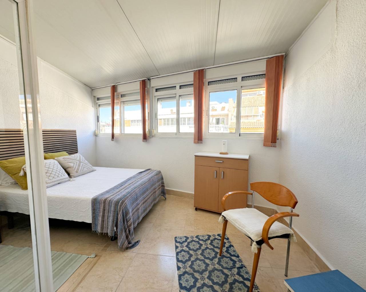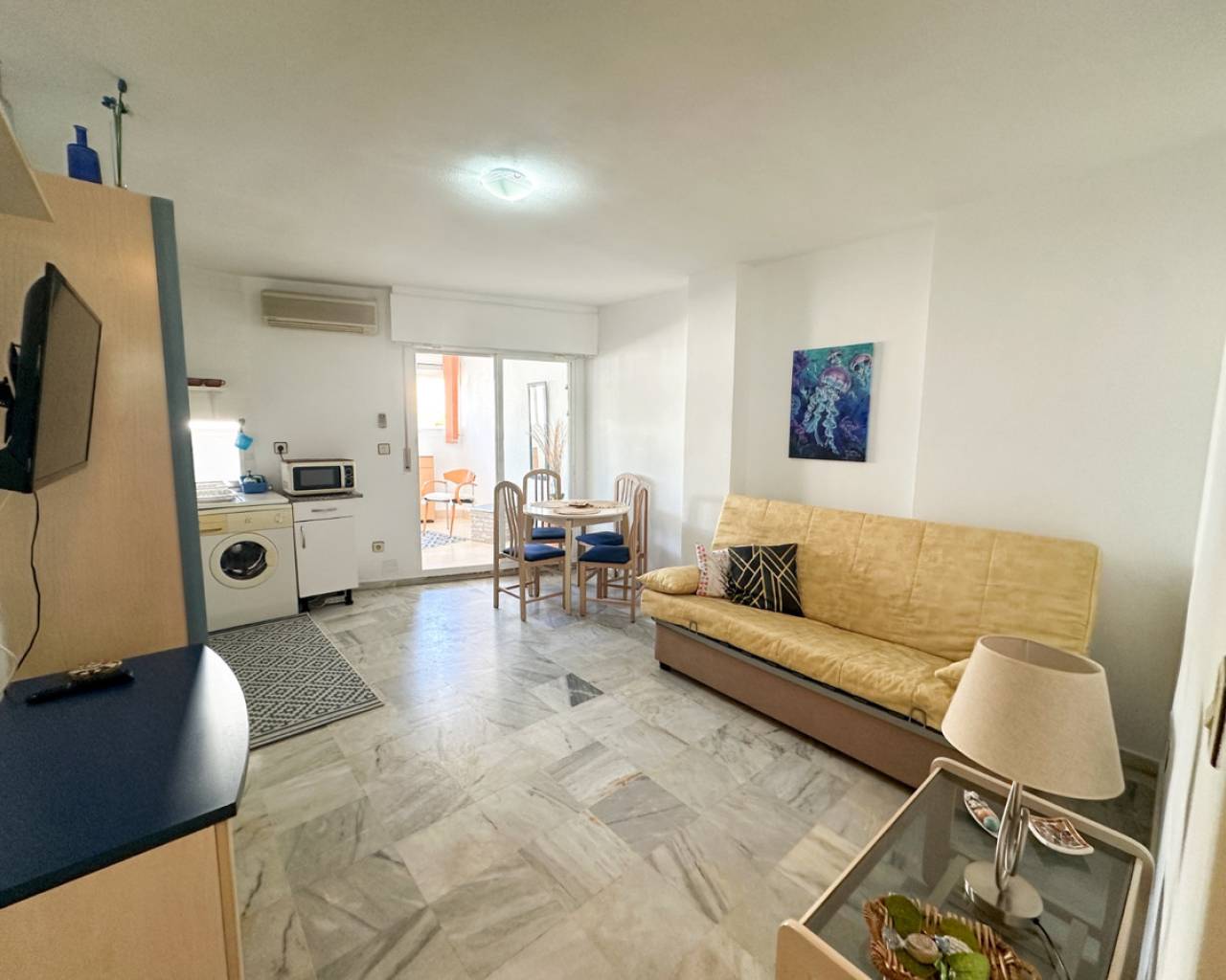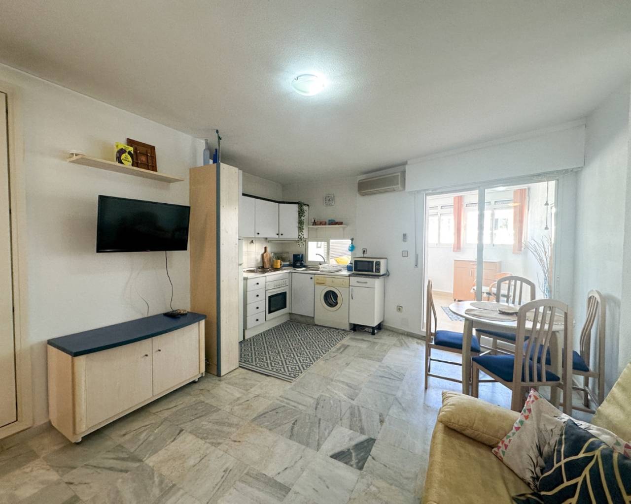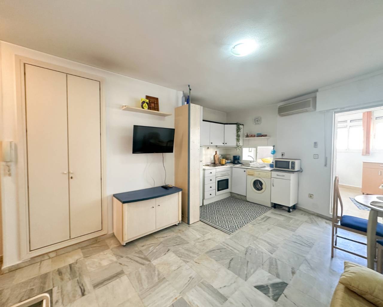 This cozy studio apartment is ideally located in Torrevieja, just 200 meters from the popular Playa del Cura, making it perfect for enjoying the Mediterranean lifestyle. The property offers a bright and open living space, thoughtfully designed to maximize comfort and functionality. Large windows allow plenty of natural light to fill the room, creating a warm and inviting atmosphere. The studio features a practical layout with a combined living and sleeping area, a fully equipped kitchenette, and a modern bathroom. Whether you're looking for a holiday getaway, a rental investment, or a compact home by the sea, this apartment provides everything you need. Situated in a lively area, you'll find a wide range of restaurants, cafés, shops, and local amenities within walking distance. The beach is just a short stroll away, where you can enjoy sunbathing, swimming, or relaxing walks along the promenade. This is a fantastic opportunity to own a charming property in one of Torrevieja's most sought-after coastal locations.