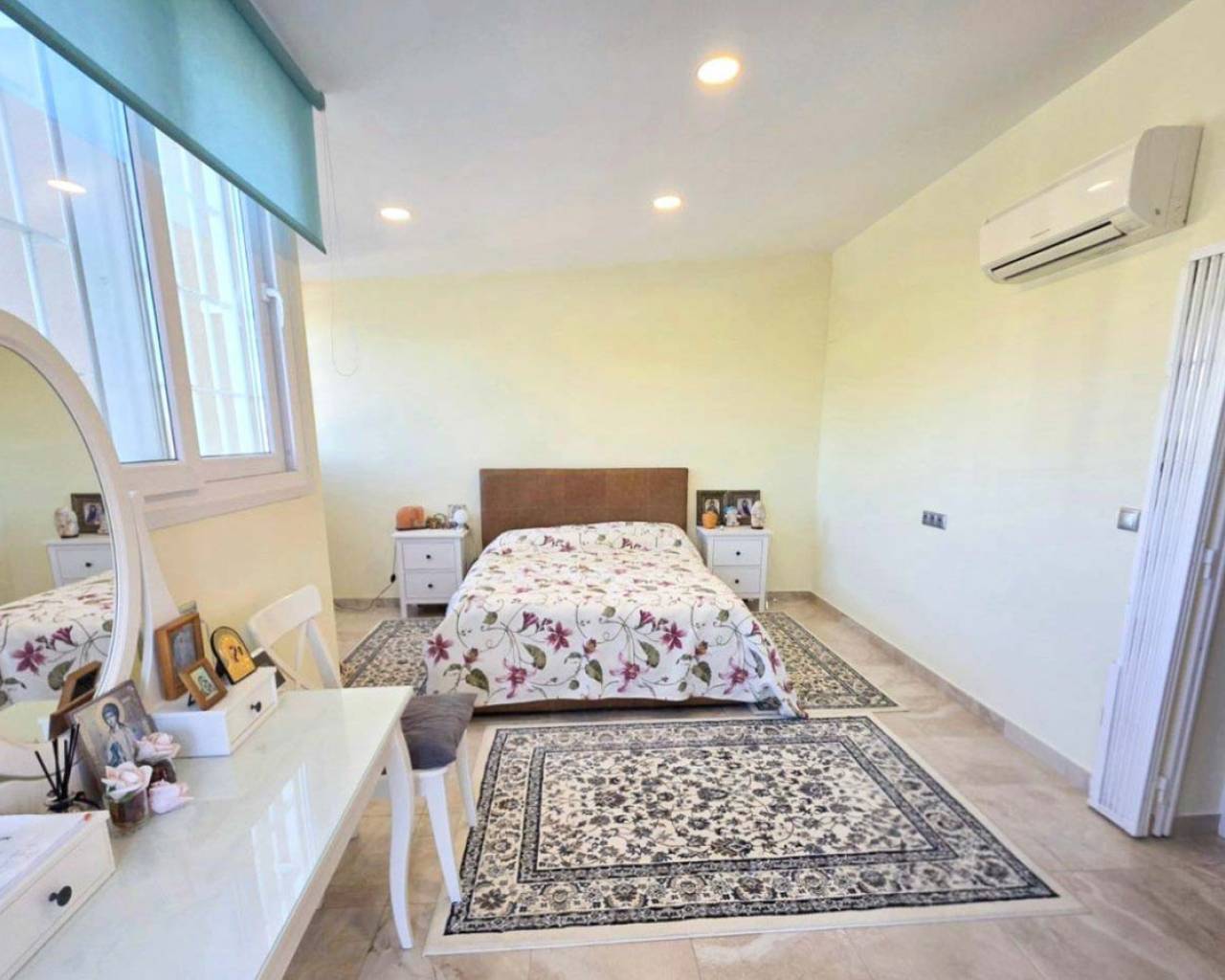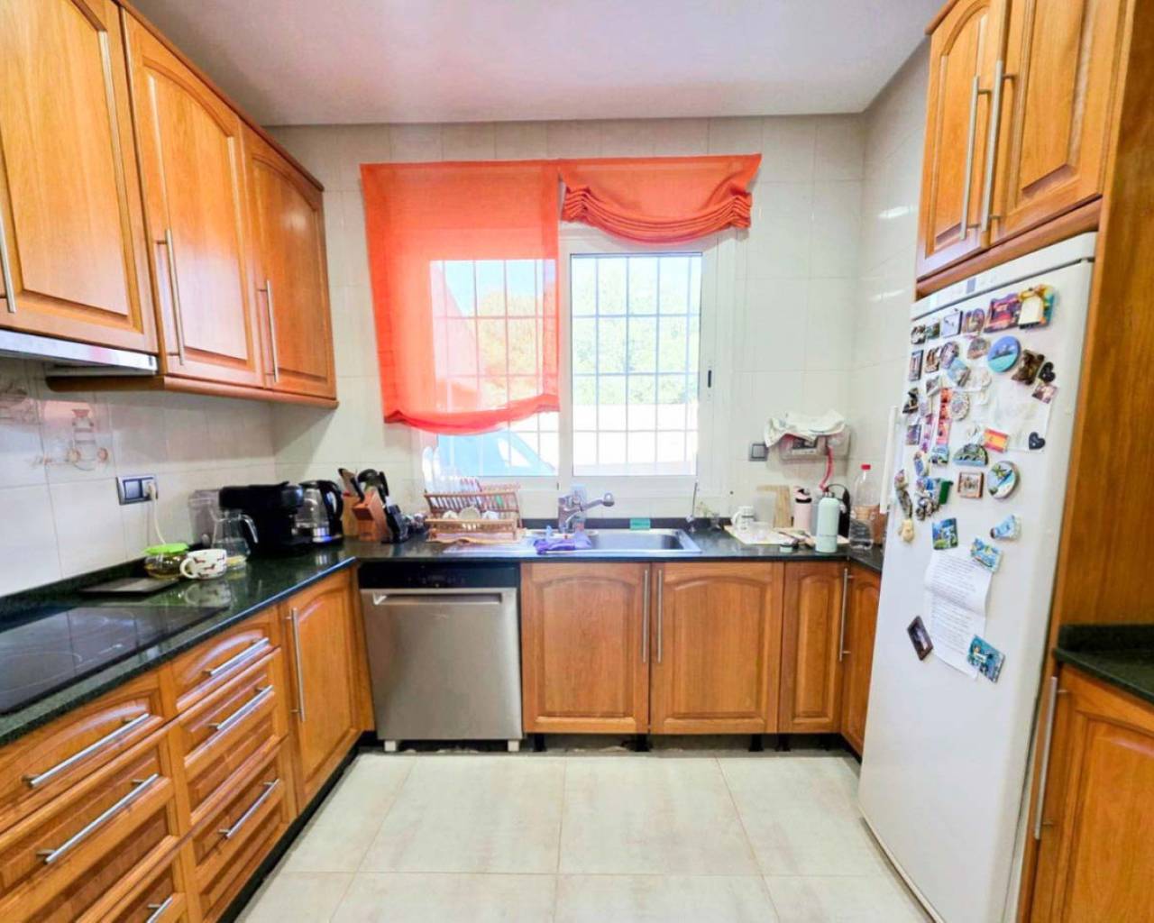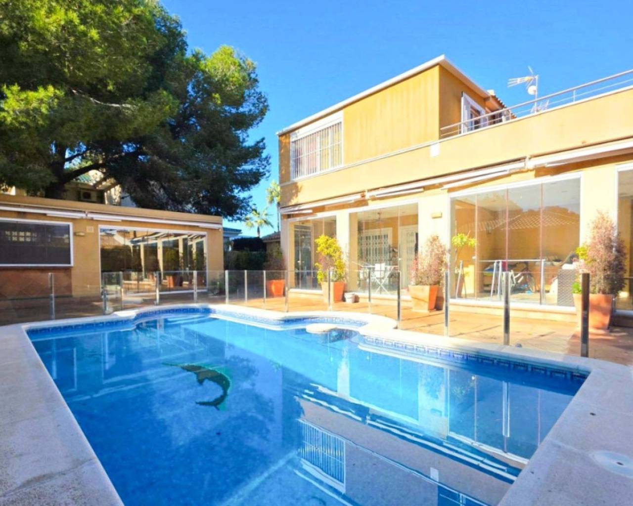 This chalet for sale in Campoamor offers 295 m² built area on a 700 m² plot, featuring a private pool, closed porch, and five air-conditioned bedrooms. Spread over two floors, the property includes a large living room with access to the closed porch that can be enjoyed year-round. It has a fully equipped kitchen, dining room, two bathrooms (one interior and one outdoor guest toilet), and a solarium to enjoy sun and views. The garden boasts a separate porch designed as a summer kitchen-dining area, ideal for outdoor gatherings. The garage accommodates three cars, providing comfort and security. Located in a peaceful area close to local amenities, this home is perfect for families or as a seasonal rental investment. Contact us to schedule an in-person visit or request a virtual tour and detailed floor plans.