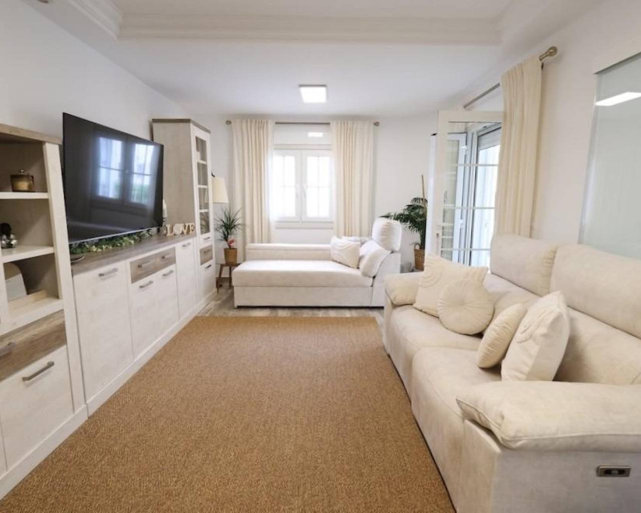 A gem in Villamartin! Beautiful, recently and beautifully renovated detached villa with a spacious apartment, sunny and with plenty of indoor and outdoor space.. . The property boasts a private pool, parking area and pleasant outdoor spaces. It is located in a quiet area, opposite a park, but at the same time very well connected and close to supermarkets, restaurants, bars, chemists, banks and all the necessary amenities.. . In the basement, with a separate entrance, there is an apartment of approximately 60 m2, currently distributed in a an entrance hall, spacious office area and living room, one double bedroom, full bathroom, laundry room and wardrobe area. There is the possibility of creating one or two additional bedrooms in the office area. There´s also a large storage room, separate from this area, in the basement.. . The main house is distributed over two floors. On the ground floor there is a glazed porch, a pleasant entrance hall, a double bedroom with fitted wardrobe, a full bathroom, a spacious living-dining room and a separate kitchen. From here you can access a bright conservatory with direct access to the back garden.. . The upper floor offers two double bedrooms (one of which is currently used as a dressing room), a full bathroom and a terrace overlooking the garden.. The rear of the garden features a beautiful swimming pool, a chill-out area with a pergola and a barbecue area. At the front, cupboards and an aluminium pergola have recently been installed, in addition to the parking space.. . Sold semi-furnished (as per inventory).. . A very well-maintained, versatile, spacious, bright, comfortable, quiet property that is 100% ready to move into. Ideal as a family home and also for those looking for additional independent space. You will love it!