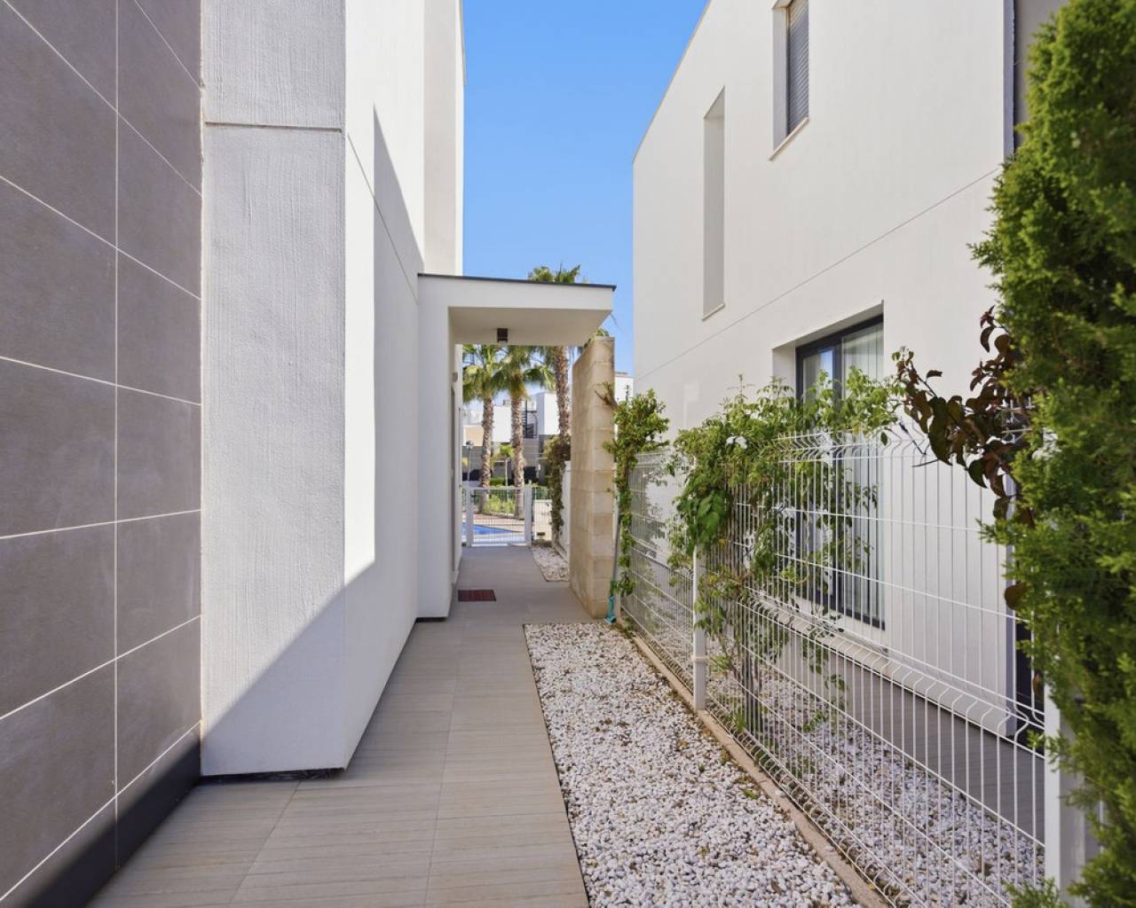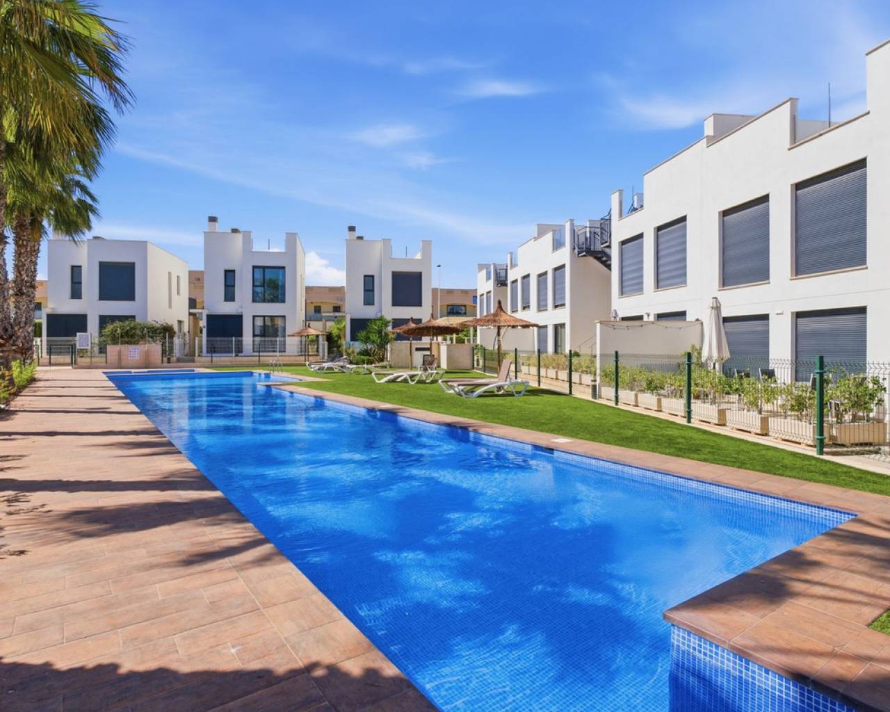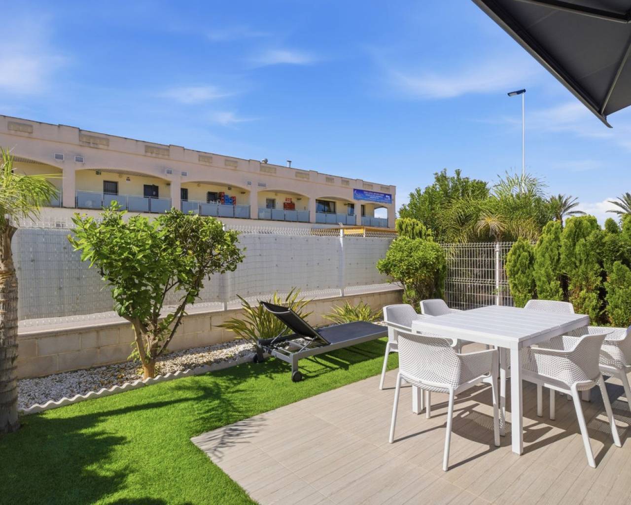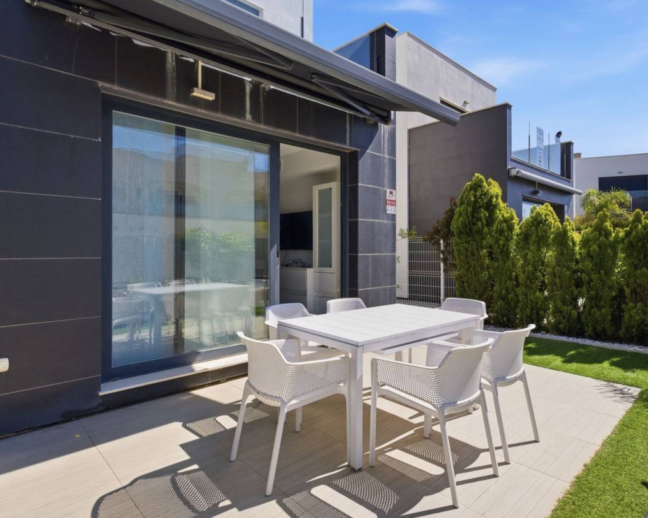 Exclusive Detached Villa in Popular Tindra – Punta Prima Welcome to this stylish and well-designed detached villa in the sought-after Tindra area in Punta Prima. The property enjoys a perfect south-facing position, offering sun all day and a bright, inviting atmosphere. The home features 3 spacious bedrooms and 2 modern bathrooms – ideal for both permanent living and holiday use. It is tastefully furnished with high-quality furniture included in the price, making it move-in ready. Enjoy multiple outdoor spaces including a private garden, balcony, and a generous rooftop terrace – perfect for relaxing or entertaining. The community also offers a beautiful pool area. The location is excellent, with a wide range of restaurants nearby and a Consum supermarket just next door. The sea is only about 600 meters away, and La Zenia Boulevard is less than 10 minutes by car. Torrevieja is also just 10 minutes away. A private underground garage space is included.