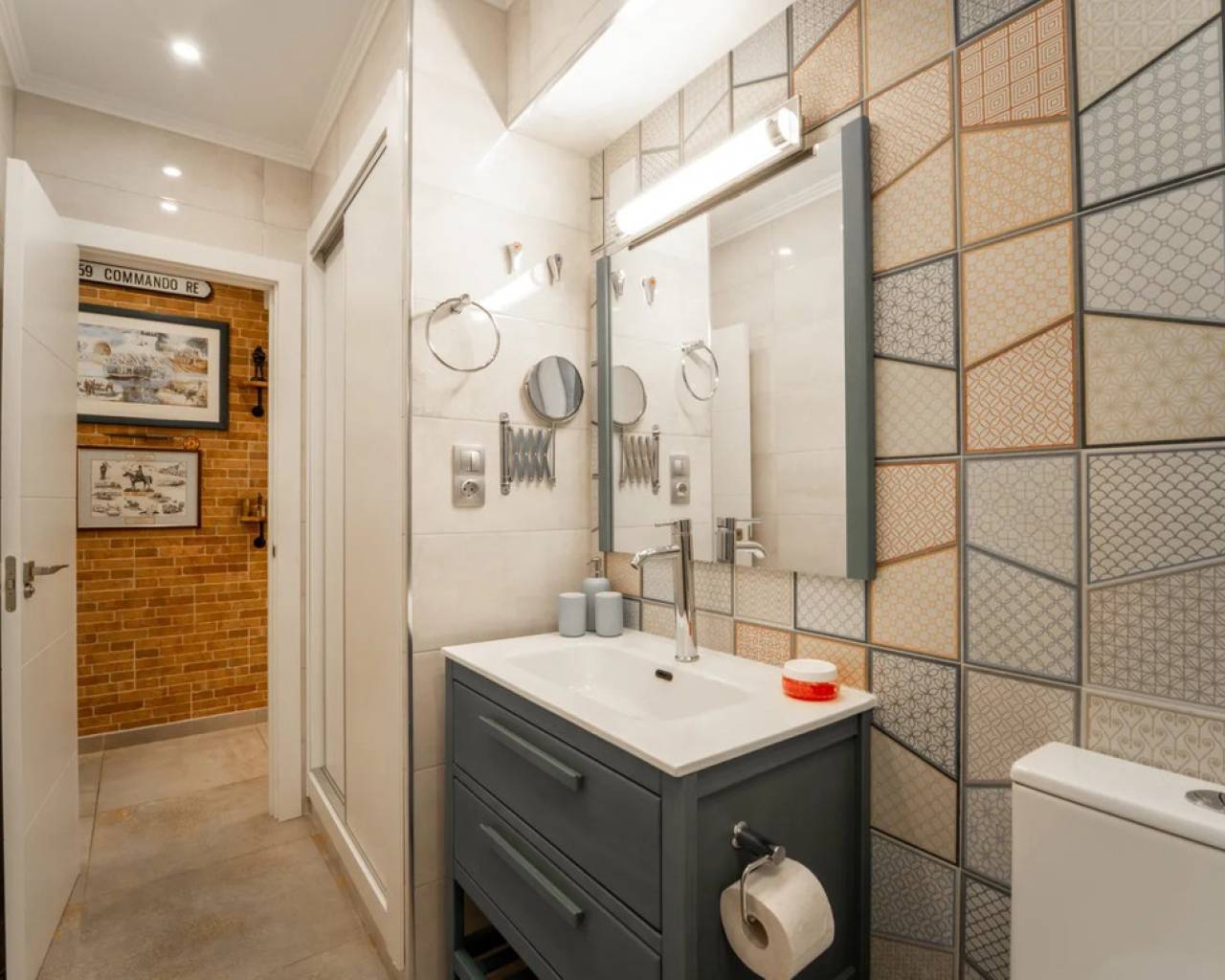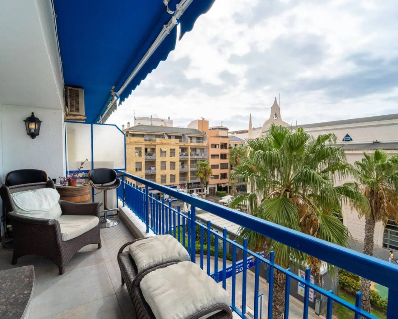 This South West Facing, Two Bedroom, Third Floor Apartment in Torrevieja, is located just a 5-minute walk from the beach, international marina, and promenade. Set in a thriving town, it offers easy driving access to Guardamar or La Mata, as well as Orihuela Costa, La Zenia Boulevard shopping centre, and a variety of golf courses. Overlooking a charming church square, this superbly maintained and beautifully presented 101m² apartment offers a bright and stylish living space featuring two striking feature walls. One wall incorporates two sets of bi-folding glazed doors that open out to a spacious covered terrace, where you can enjoy views across the park towards the church. There is a separate, well-appointed fitted breakfast kitchen, which flows into an additional versatile space currently used as an office area. The property comprises two double bedrooms, with the master boasting feature sliding wooden doors and an en suite shower room, plus a further modern family shower room. Additional benefits include access to a communal solarium with sea views and a private storage room. With air conditioning and electric blinds throughout, this is a truly stunning home in Costa Blanca South.