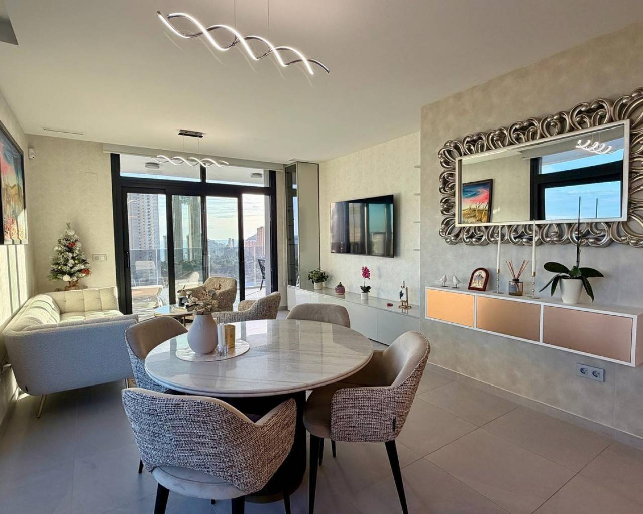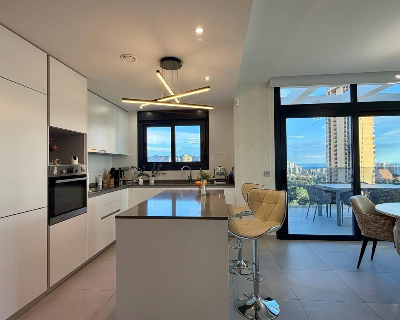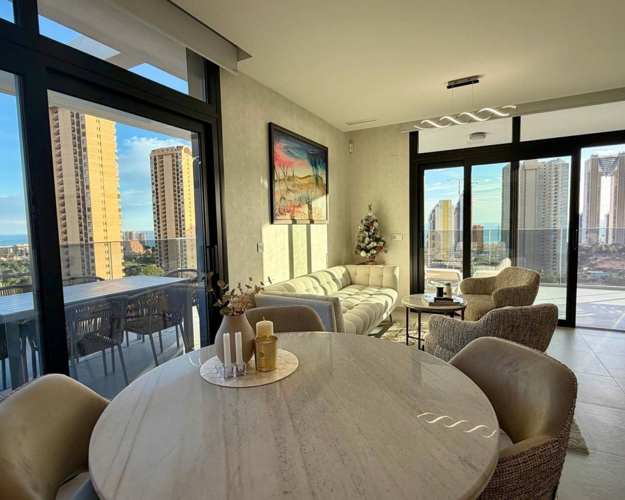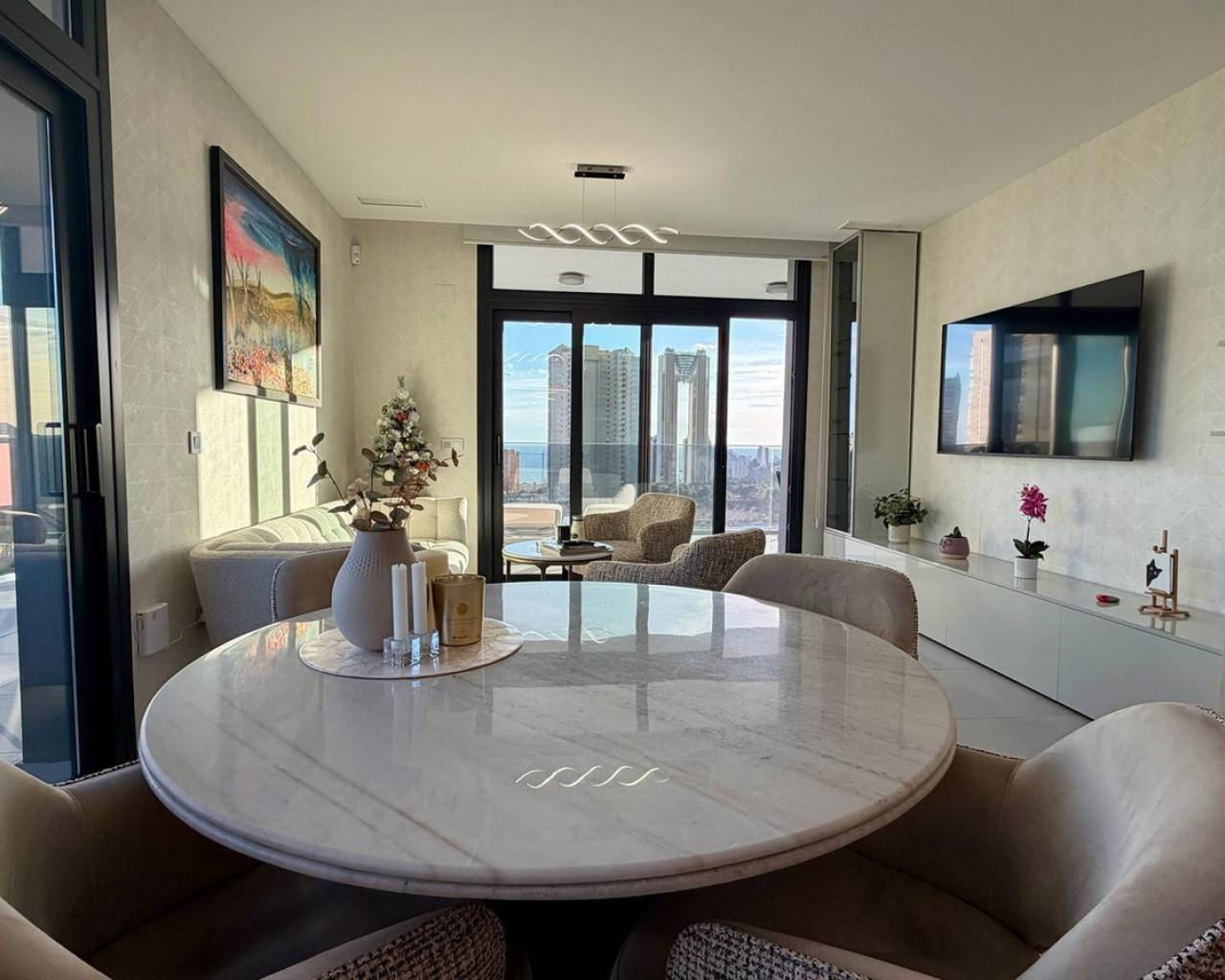 Exclusive apartment located just 900 meters from the famous Poniente Beach, in the most prestigious area of Benidorm, known for its iconic skyscrapers. Its location offers the perfect balance of privacy, tranquility and spectacular panoramic sea views in a modern urban environment with premium services. The property features 3 spacious bedrooms, one en-suite with direct access to the terrace. The living room is bright and spacious, with an open-plan kitchen and a stunning 52 m² terrace with sea views. It includes 2 modern bathrooms with LED mirrors and walk-in showers. With 156 m² built and 104 m² usable space, the home is complemented by a large terrace. Southeast orientation ensures natural light throughout the day. The apartment is fully exterior with open views of the Benidorm skyline, mountains and sea. It features smart zoned air conditioning and is sold fully furnished with luxury design details. Located near Intempo, Delfin Tower and Sunset Drive, it is close to restaurants, shops and a golf course in front of the building. Includes garage and storage room. The building offers gym, tennis court and swimming pools. Benidorm is one of the most vibrant destinations on the Costa Blanca, offering beaches, modern skyline, mild climate, leisure, restaurants, golf and excellent infrastructure, ideal for living or investment.