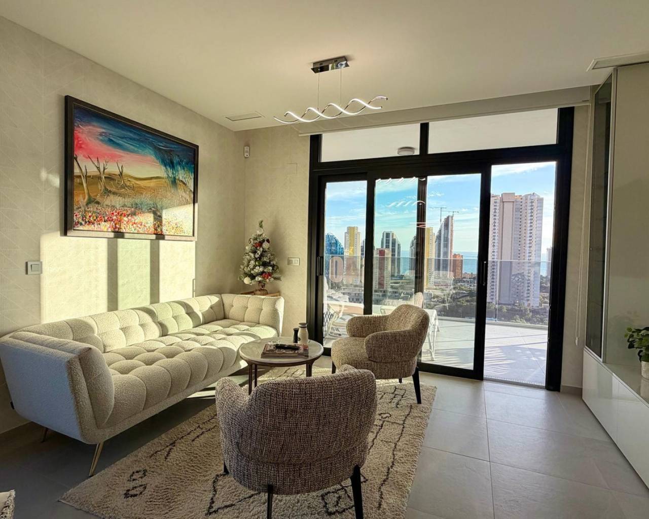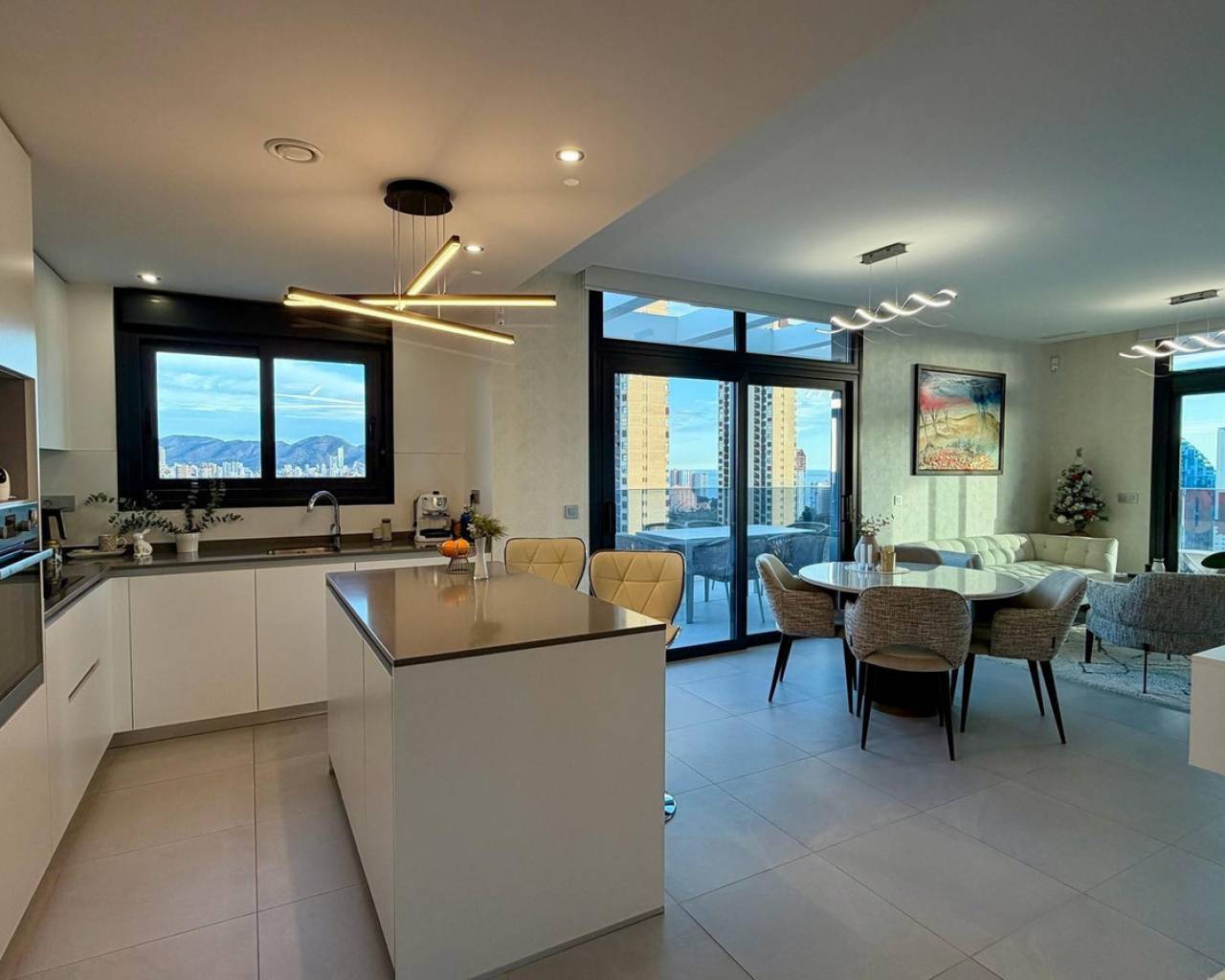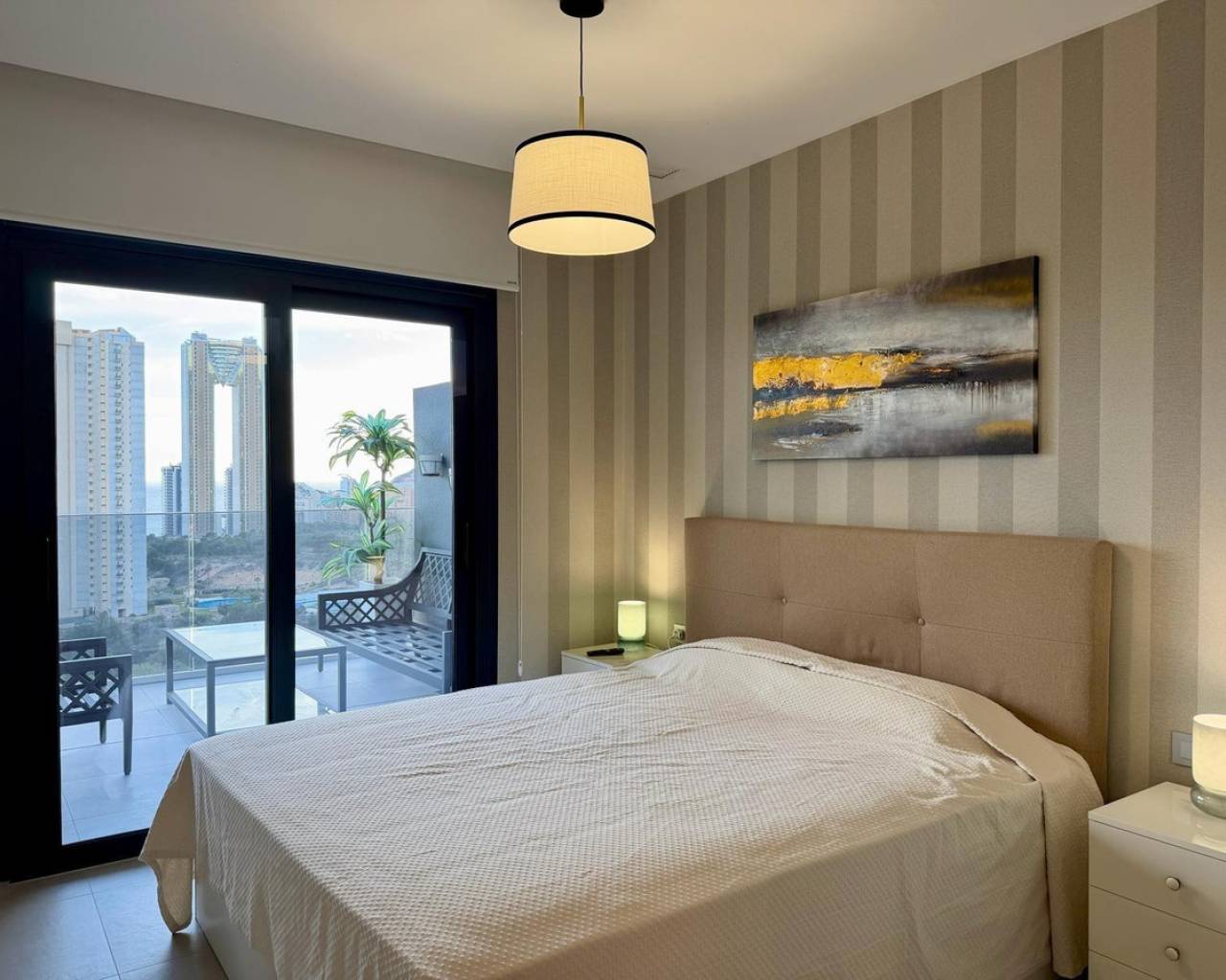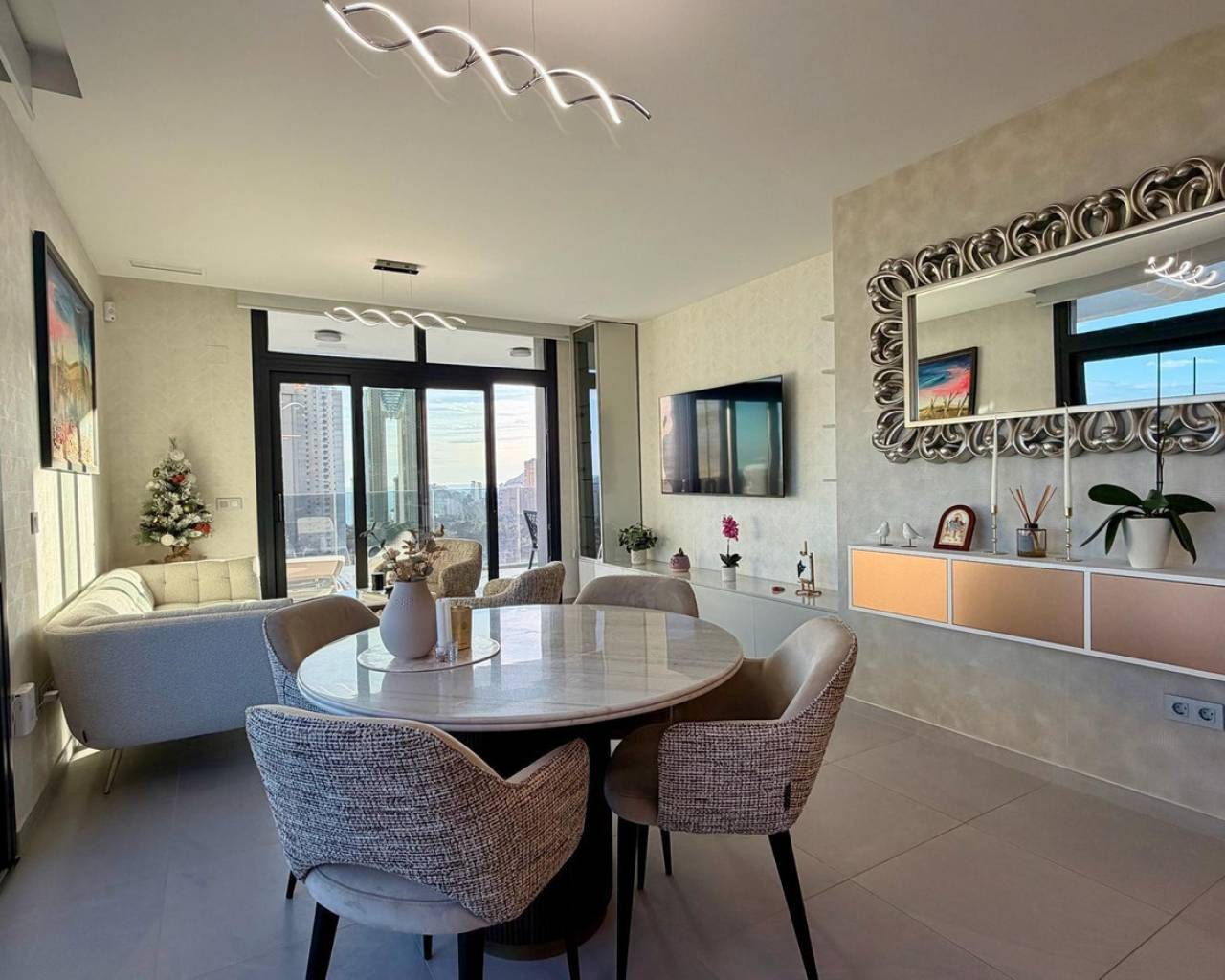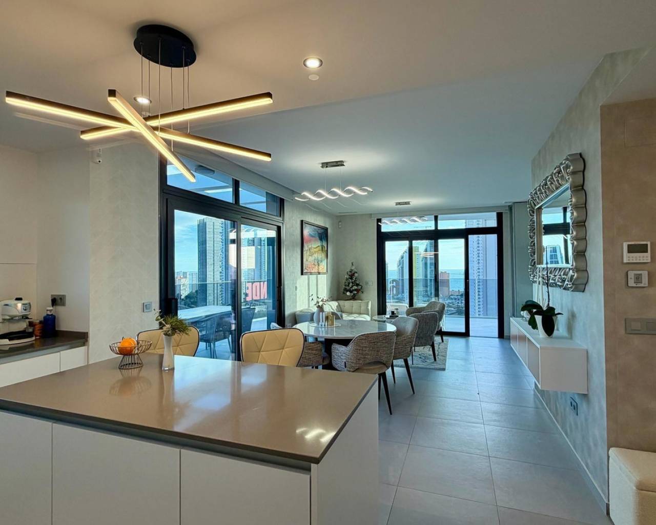 Exclusive apartment located just 900 meters from the famous Poniente Beach, in the most prestigious area of Benidorm, known for its iconic skyscrapers. Its location offers the perfect balance of privacy, tranquility and spectacular panoramic sea views in a modern urban environment with premium services. The property features 3 spacious bedrooms, one en-suite with direct access to the terrace. The living room is bright and spacious, with an open-plan kitchen and a stunning 52 m² terrace with sea views. It includes 2 modern bathrooms with LED mirrors and walk-in showers. With 156 m² built and 104 m² usable space, the home is complemented by a large terrace. Southeast orientation ensures natural light throughout the day. The apartment is fully exterior with open views of the Benidorm skyline, mountains and sea. It features smart zoned air conditioning and is sold fully furnished with luxury design details. Located near Intempo, Delfin Tower and Sunset Drive, it is close to restaurants, shops and a golf course in front of the building. Includes garage and storage room. The building offers gym, tennis court and swimming pools. Benidorm is one of the most vibrant destinations on the Costa Blanca, offering beaches, modern skyline, mild climate, leisure, restaurants, golf and excellent infrastructure, ideal for living or investment.