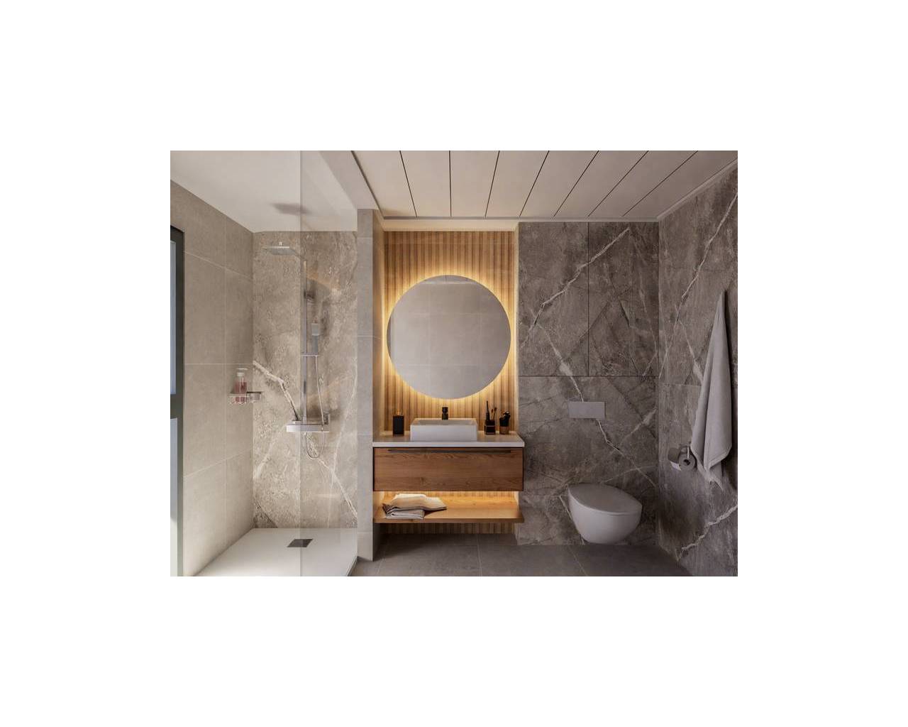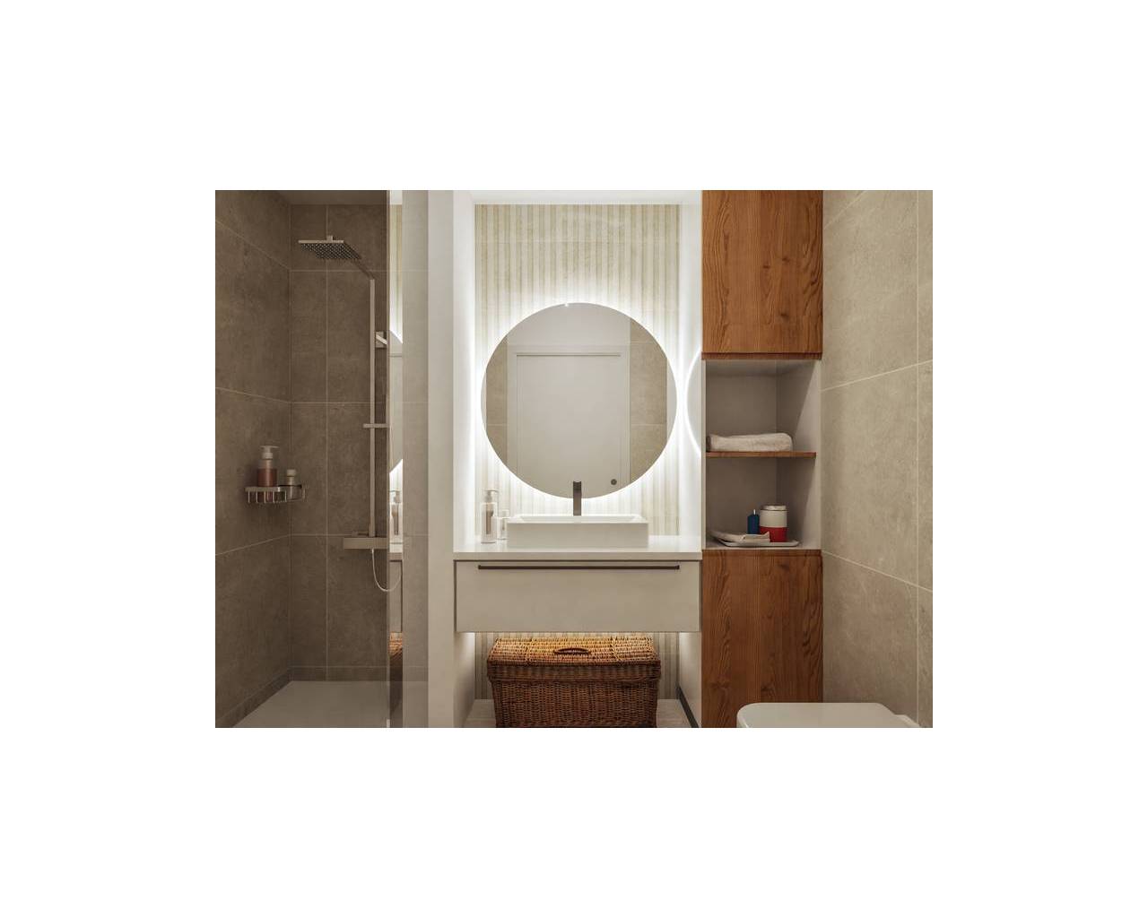 Fully equipped bathrooms with built-in wash basin, under-sink vanity unit, illuminated mirror, and shower with screen
