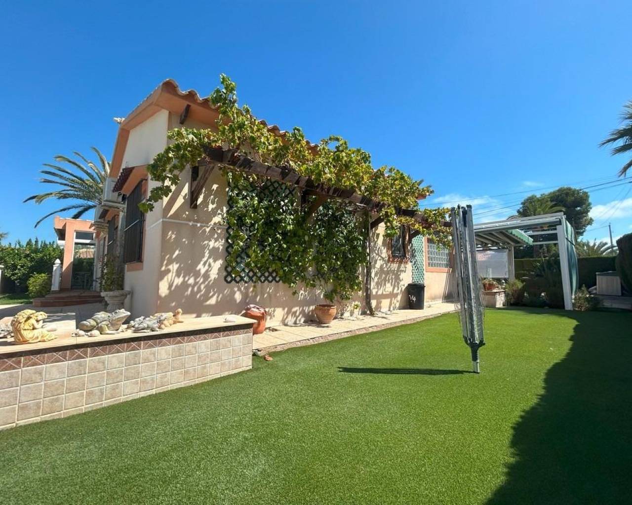 We present this beautiful single-story villa in Cabo Roig! Located just 10 minutes from the beach, in one of the most sought-after areas of the Orihuela Costa. Built on a plot of approximately 800 m², this property has 140 m² of built area, a large garden, a private pool, a wooden garden house, and a pergola. It's the ideal space to relax and enjoy unforgettable moments with family and friends.~The home features 3 bedrooms, 3 full bathrooms, a separate kitchen with access to the garden, and a spacious and bright living-dining room with a fireplace. All on one level. There's a glazed terrace with a summer kitchen and barbecue. There's also a closed garage. The garden is well-kept with various plants, trees, and artificial grass.~The home is in very good condition and is ready to move into.~Perfect for year-round living. All amenities are within walking distance, and Cabo Roig beach is a 10-minute walk away.~