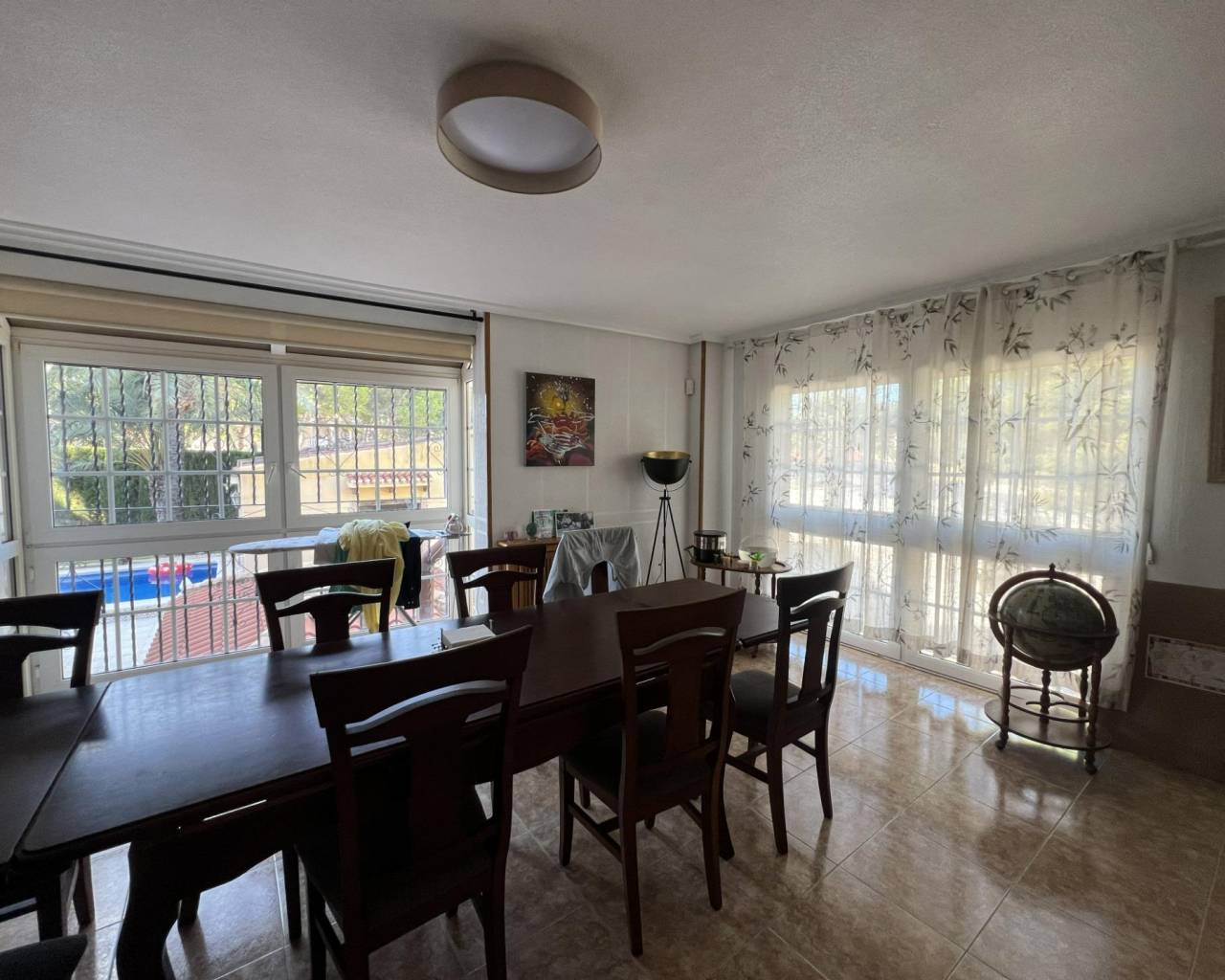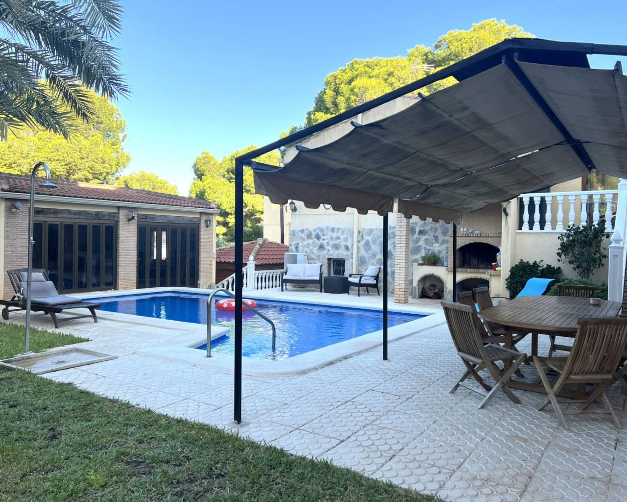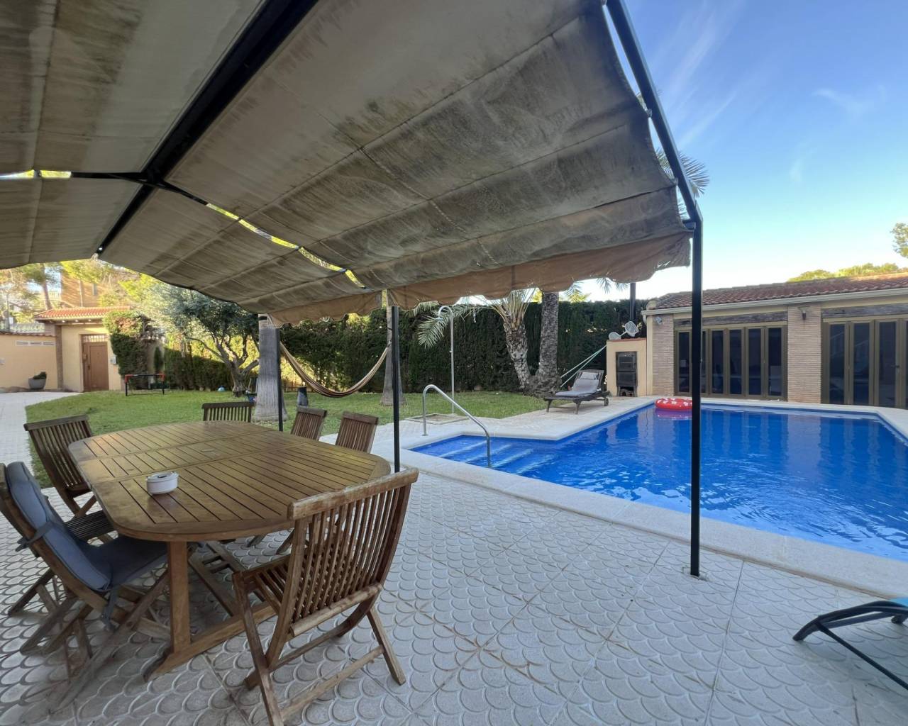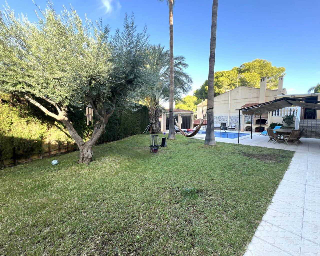 Detached villa with private pool and large plot in Los Balcones~~Detached villa with a spacious plot, private pool and wellness area, ideal for year-round living.~~The property has an approximate built area of 200 m² and stands on a plot of more than 800 m², located in the prestigious residential area of Los Balcones — a quiet and well-connected area of Torrevieja.~~It offers three bedrooms and three full bathrooms, along with a bright living room and an independent kitchen. All rooms are equipped with heating by radiators (diesel boiler) and air conditioning via split units.~~Outside, the villa features a large garden area with a private pool, a glazed winter room, and a sauna area — perfect for relaxation and comfort.~~There is also a closed garage with space for two vehicles.~~A well-maintained and complete property offering privacy, space, and excellent quality, ideal as a permanent home or as a holiday residence.