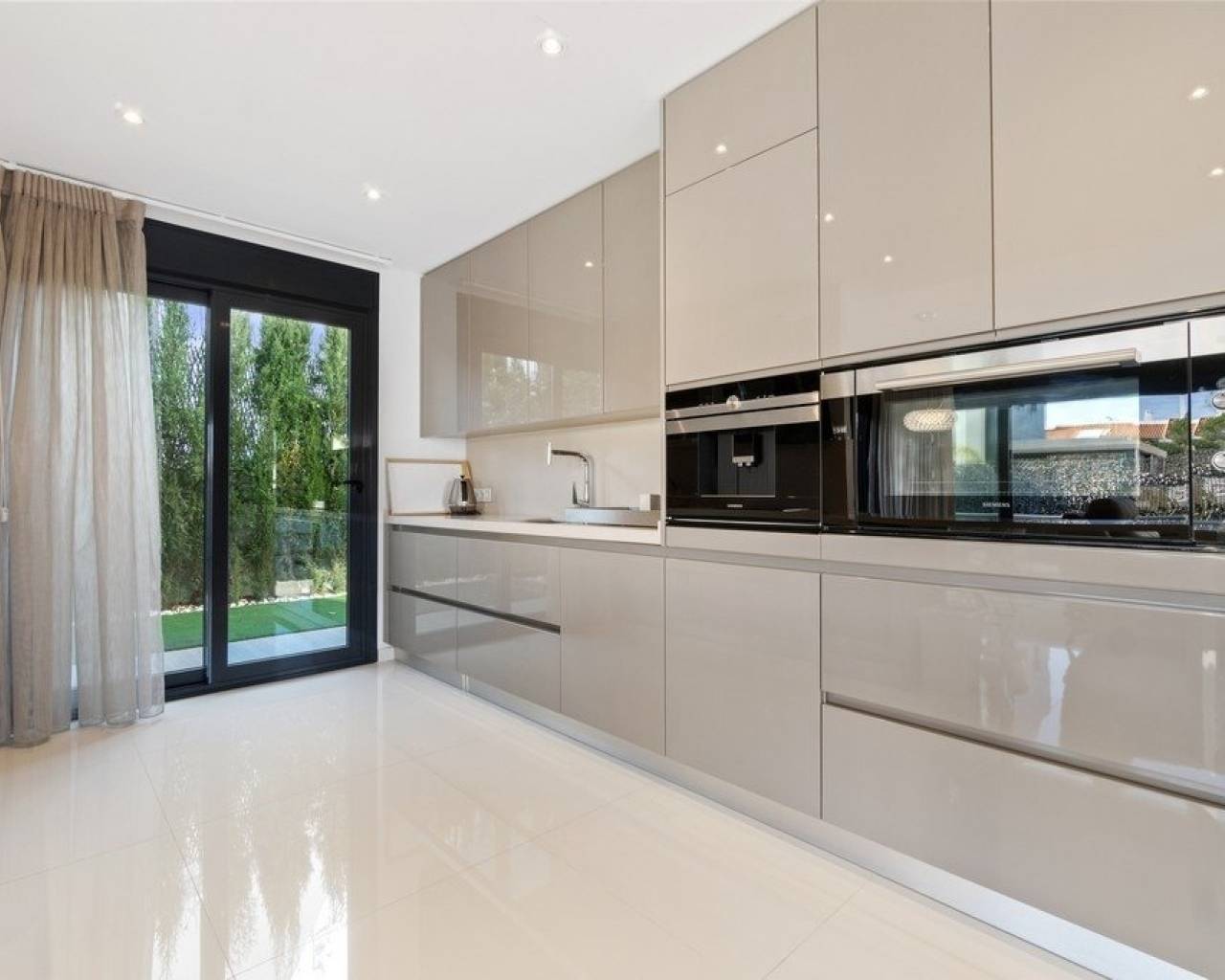 Modern style luxury villa located in Campoamor, only 300 m from the beach. Villa with an area of 200m2, built on a plot of 500m2, the house has 4 bedrooms, 3 bathrooms, living room, kitchen, terrace and solarium of 46m2 with sea views. The outside part has a private pool 8x4. Underfloor heating in the bathrooms, centralized air conditioning installed, parking on the plot. Top quality materials. Heated saltwater pool. It is close to all services, schools, just 10 minutes by car from the largest shopping center in Alicante, Zenia Boulevard, 40 minutes from Alicante airport and a few minutes from some of the best golf courses.