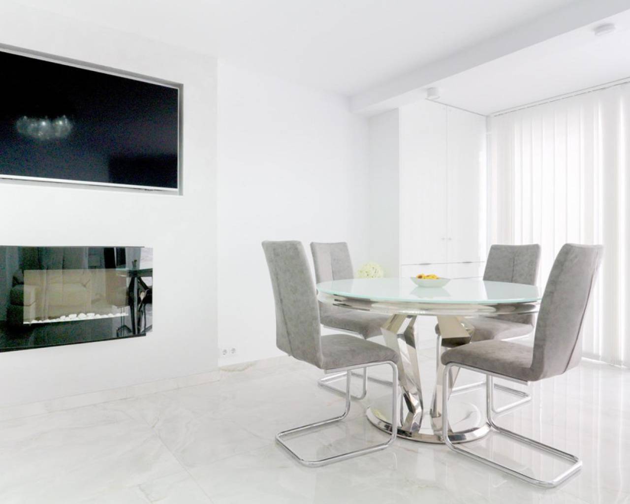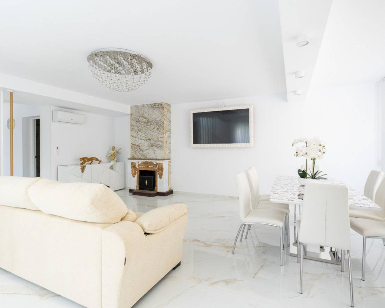I present this interesting, fully renovated townhouse. "Two in one," it consists of two connected but independent houses, ideal for a large family. It is located in Punta Prima, Orihuela Costa, just 400 meters from the sea. The property has a spacious 260 m2 built area, offering a spacious layout. It features two spacious renovated living rooms and two fully equipped kitchens with furniture and appliances. It has four bedrooms and three bathrooms, all with large windows and a south-east orientation, both in the bedrooms and throughout the house, allowing natural light to enter each room. It also has a bright terrace with incredible views of the garden and pool. Outside, you'll find a magnificent private heated pool with sun loungers perfect for sunny summers, a barbecue area, and a parking space. The entire garden and terrace are equipped with night lighting, providing a magical atmosphere on starry nights. What makes this home unique are its solar panels and fireplaces: both conventional and electric. It's perfect for a large family! Don't miss this opportunity! Contact us to arrange a viewing! I invite you to come and see it!