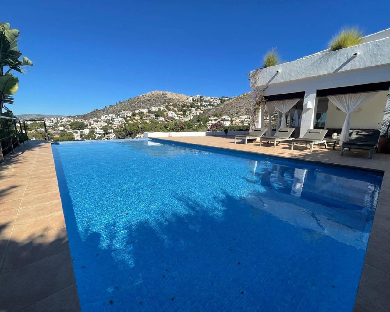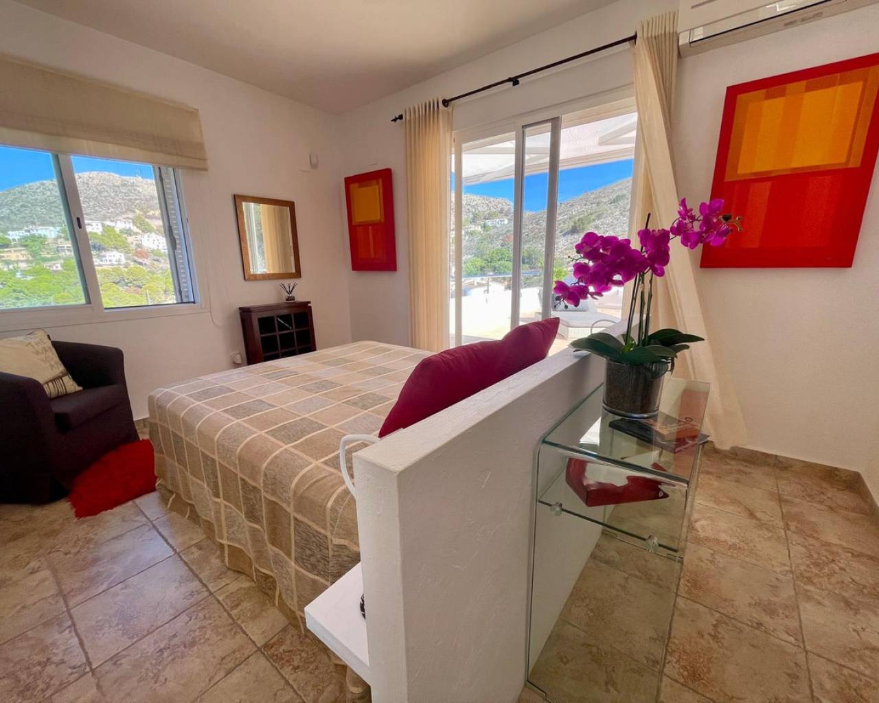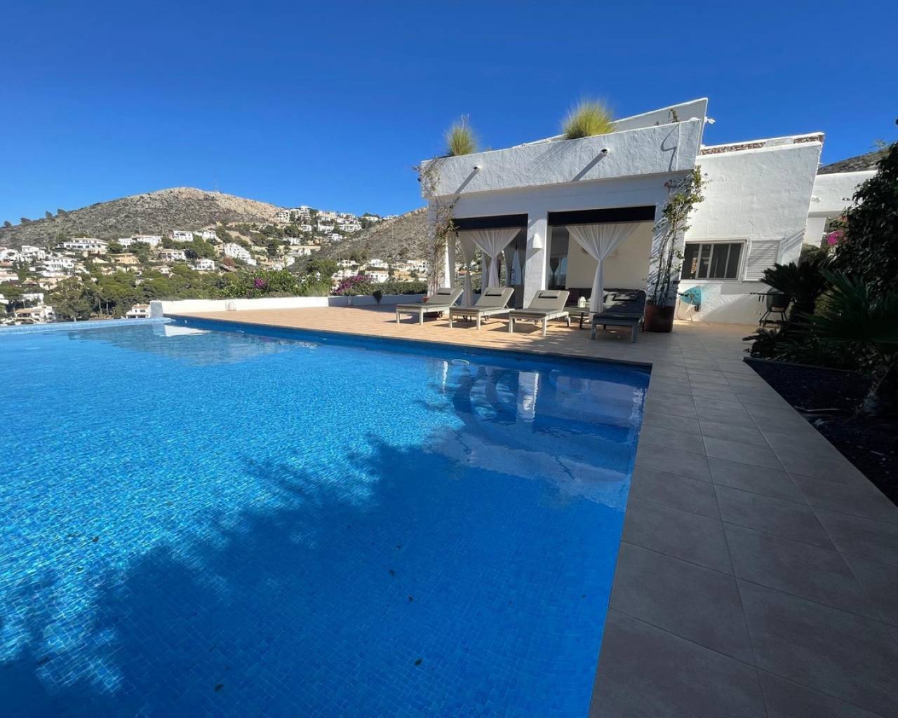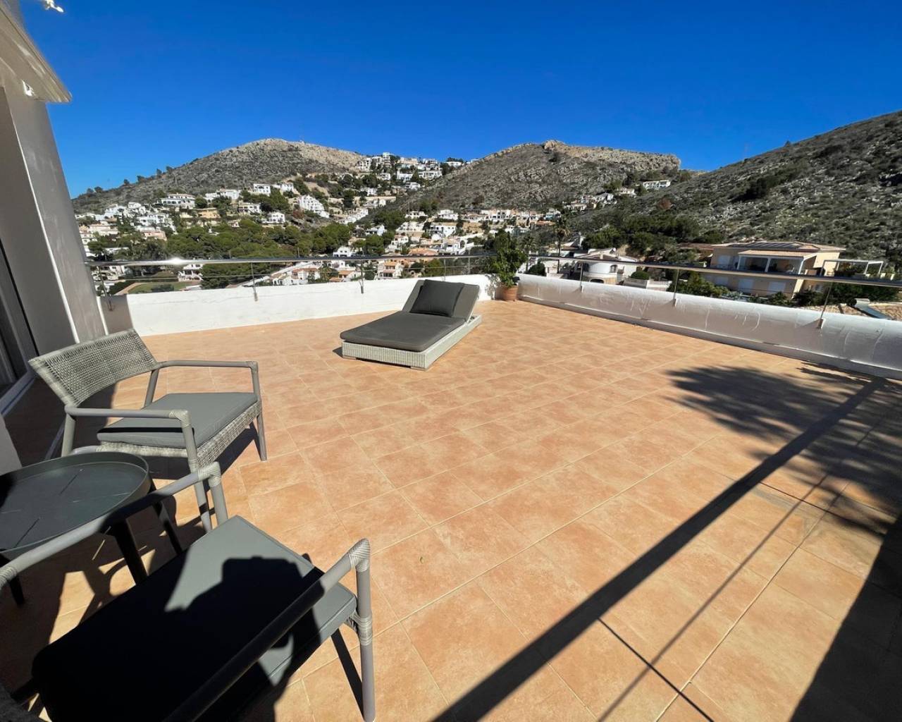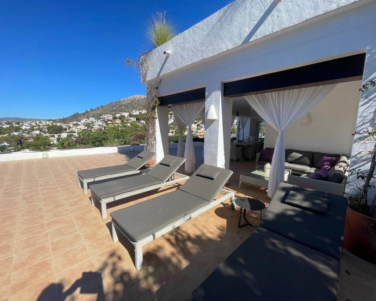 Villa solace, El Portet, Moraira. Villa Solace "The Bond Villa" This delightful Ibizan-styled villa is owned by two world-acclaimed film and theatre producers, which gives a clue as to where the name of this villa came from. Perches on the hillside above the neighbouring villas look over the Valley of El Portet; this villa could be a setting out of a James Bond film, with dramatic panoramic open views of the Benrnia Mountains and the turquoise blue sea. As you approach Villa Solace, the architectural metal automated driveway gates glide open, revealing a long, sweeping drive that leads you to a spacious carport and the principal entrance of this exquisite property. Upon entering, you're welcomed by a bright, airy entrance hallway that opens into a large lounge area featuring a central fireplace that creates a cosy atmosphere. The lounge seamlessly connects to the covered dining terrace by the pool, perfect for entertaining or relaxing by the water. Adjacent to the lounge, you'll find a fully equipped modern kitchen with a utility room at the back. This kitchen offers convenient access to the expansive covered terrace, an ideal spot for alfresco dining, lounging, or simply soaking in the breathtaking surroundings. The infinity swimming pool, framed by mature, manicured shrubs and trees, provides a serene backdrop for leisurely swimming and sunbathing. Venturing to the first floor, you'll discover two stylish bedrooms, each featuring en-suite shower rooms, built-in wardrobes, and air conditioning for comfort. One of these bedrooms boasts access to a spacious terrace, allowing for private outdoor relaxation. The villa's upper level is dedicated to the luxurious Master Bedroom, complete with an en-suite bathroom that showcases a generous walk-in shower. Here, you can unwind in the soaking tub while gazing through the purpose-designed picture window that offers stunning views. The Master Bedroom is exceptionally spacious and bright, also providing access to a large roof terrace where you can enjoy panoramic vistas that are truly breathtaking. The interior design beautifully combines natural sandstone white-washed walls with timber beams and garden sleepers, embodying the essence of an Ibizan-quality villa set in the desirable El Portet area of Moraira. This enchanting property promises a sophisticated, tranquil lifestyle perfectly suited for those seeking elegance, comfort, and spectacular surroundings. Additionally Benefits -Separate studio that is currently used as a cinema room, Gym along with a large En-suite. This area is also used as a guest bedroom when required. -14 Solar Panels with 10klw Batteries - Heat pump which is very economical to run. -Security cameras -Automatic irrigation system in the garden -Video entry system -Mature garden with Orange, lemon, and tangerine trees, along with a olive tree. - Alarm system -Private patio terrace -Furnished inside and out - Additional land to the rear of the property, approximately 6m of the mountainside, which could house additional solar panels for example. - High speed firber Internet. - Automatic gates -Central heating -Outside shower -Privacy -Open mountain and sea views