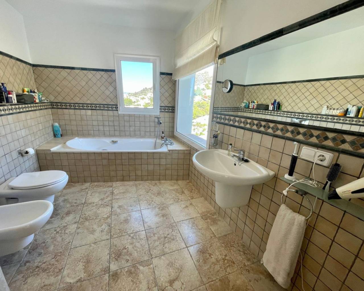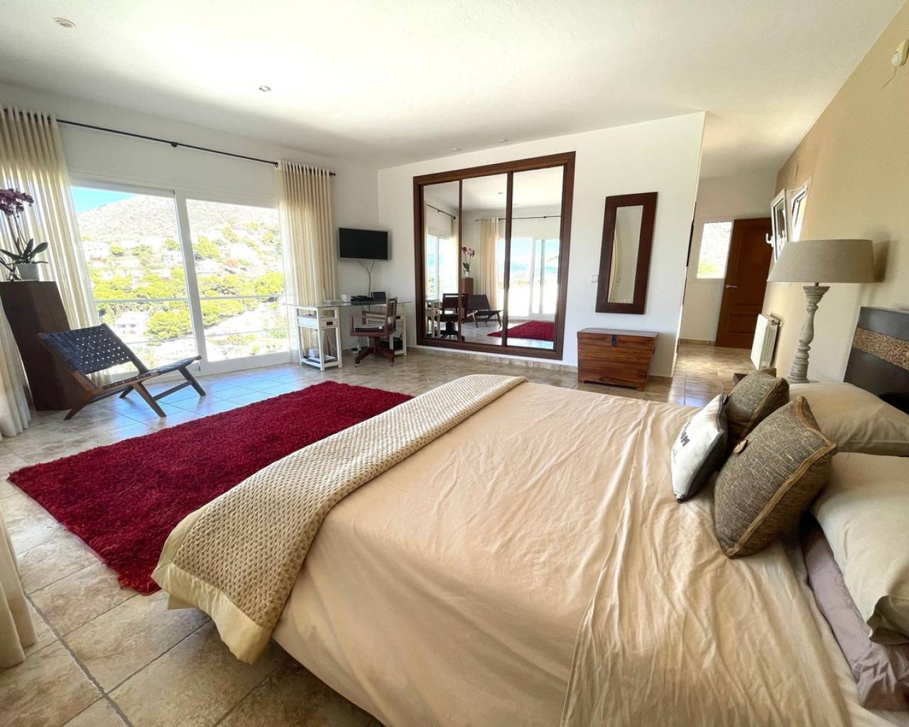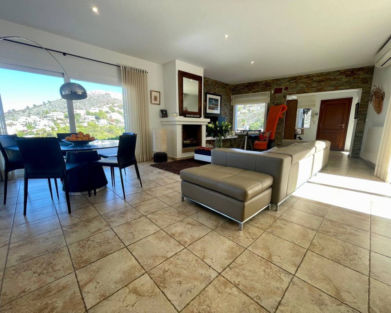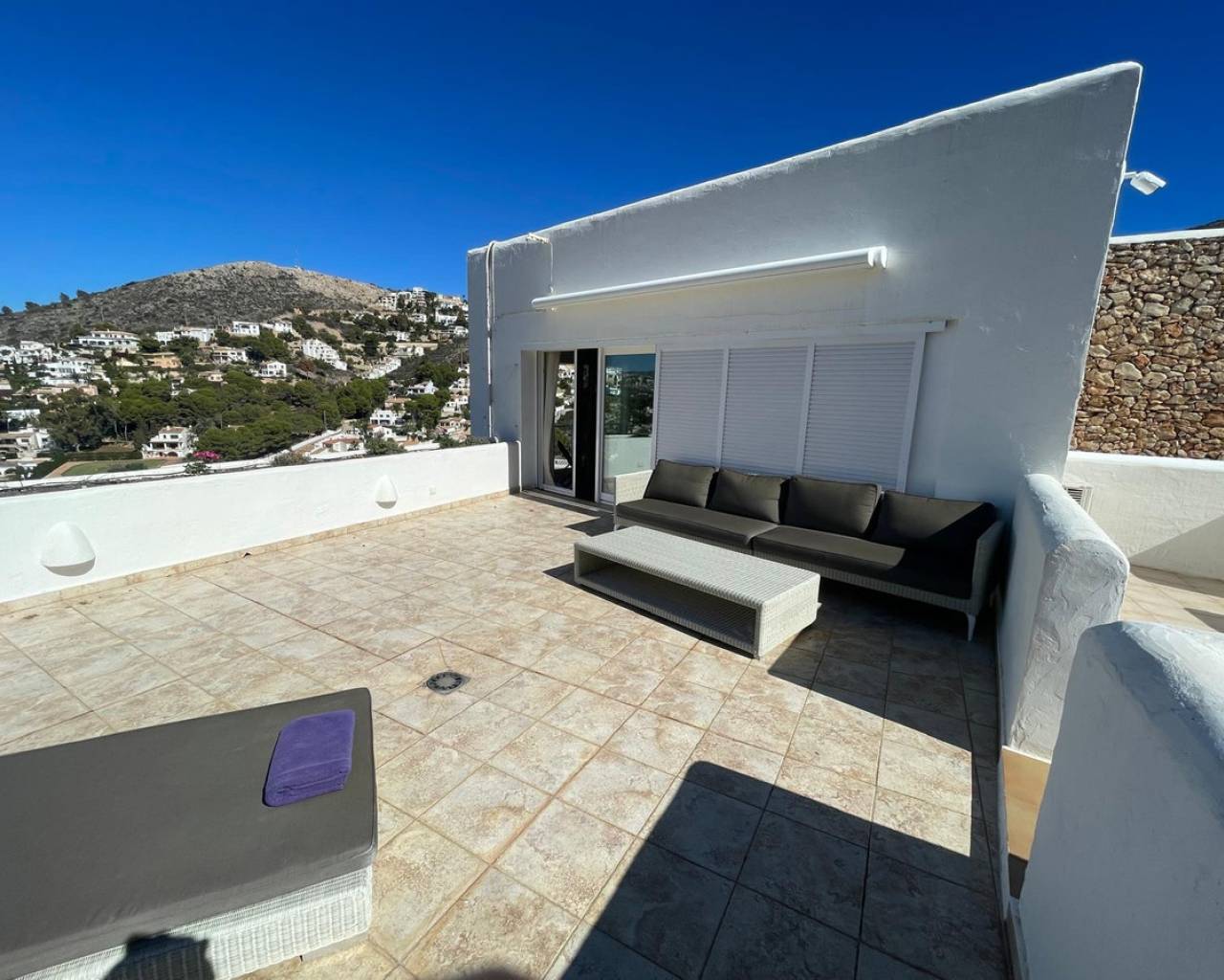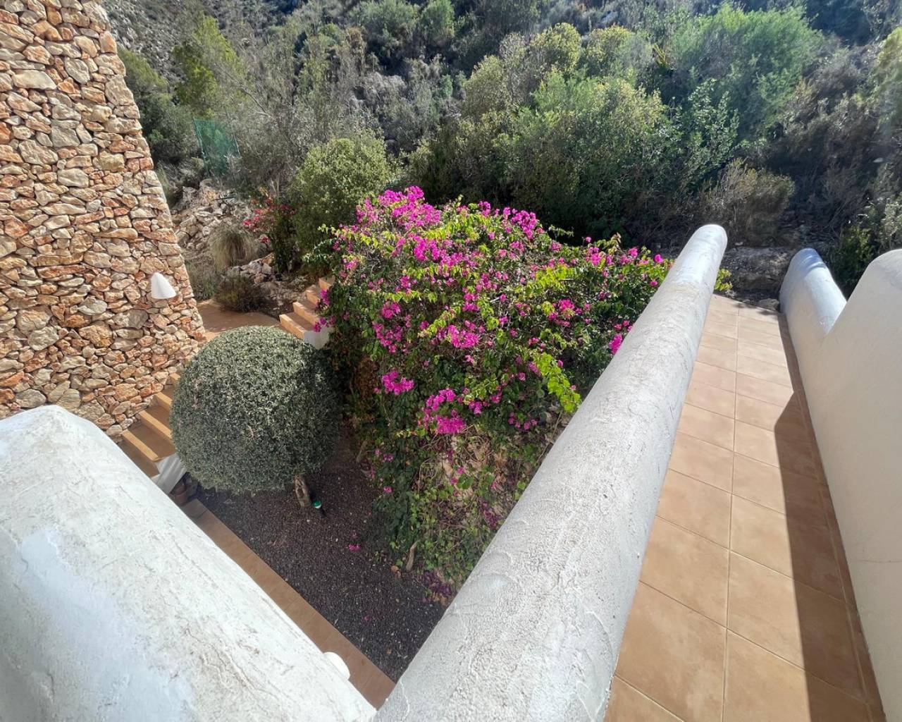 Villa solace, El Portet, Moraira. Villa Solace "The Bond Villa" This delightful Ibizan-styled villa is owned by two world-acclaimed film and theatre producers, which gives a clue as to where the name of this villa came from. Perches on the hillside above the neighbouring villas look over the Valley of El Portet; this villa could be a setting out of a James Bond film, with dramatic panoramic open views of the Benrnia Mountains and the turquoise blue sea. As you approach Villa Solace, the architectural metal automated driveway gates glide open, revealing a long, sweeping drive that leads you to a spacious carport and the principal entrance of this exquisite property. Upon entering, you're welcomed by a bright, airy entrance hallway that opens into a large lounge area featuring a central fireplace that creates a cosy atmosphere. The lounge seamlessly connects to the covered dining terrace by the pool, perfect for entertaining or relaxing by the water. Adjacent to the lounge, you'll find a fully equipped modern kitchen with a utility room at the back. This kitchen offers convenient access to the expansive covered terrace, an ideal spot for alfresco dining, lounging, or simply soaking in the breathtaking surroundings. The infinity swimming pool, framed by mature, manicured shrubs and trees, provides a serene backdrop for leisurely swimming and sunbathing. Venturing to the first floor, you'll discover two stylish bedrooms, each featuring en-suite shower rooms, built-in wardrobes, and air conditioning for comfort. One of these bedrooms boasts access to a spacious terrace, allowing for private outdoor relaxation. The villa's upper level is dedicated to the luxurious Master Bedroom, complete with an en-suite bathroom that showcases a generous walk-in shower. Here, you can unwind in the soaking tub while gazing through the purpose-designed picture window that offers stunning views. The Master Bedroom is exceptionally spacious and bright, also providing access to a large roof terrace where you can enjoy panoramic vistas that are truly breathtaking. The interior design beautifully combines natural sandstone white-washed walls with timber beams and garden sleepers, embodying the essence of an Ibizan-quality villa set in the desirable El Portet area of Moraira. This enchanting property promises a sophisticated, tranquil lifestyle perfectly suited for those seeking elegance, comfort, and spectacular surroundings. Additionally Benefits -Separate studio that is currently used as a cinema room, Gym along with a large En-suite. This area is also used as a guest bedroom when required. -14 Solar Panels with 10klw Batteries - Heat pump which is very economical to run. -Security cameras -Automatic irrigation system in the garden -Video entry system -Mature garden with Orange, lemon, and tangerine trees, along with a olive tree. - Alarm system -Private patio terrace -Furnished inside and out - Additional land to the rear of the property, approximately 6m of the mountainside, which could house additional solar panels for example. - High speed firber Internet. - Automatic gates -Central heating -Outside shower -Privacy -Open mountain and sea views
