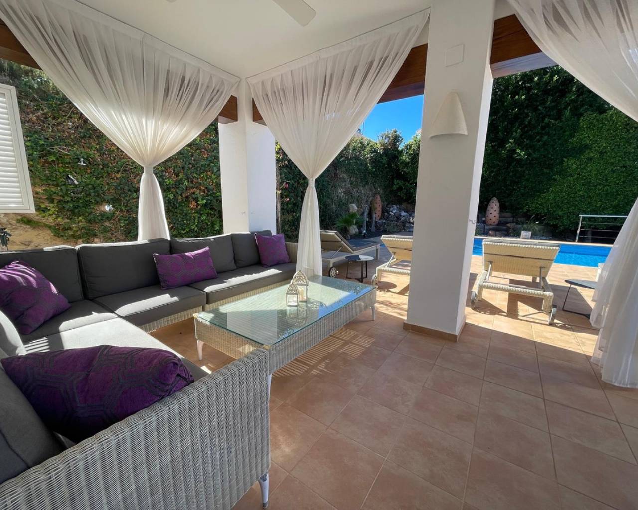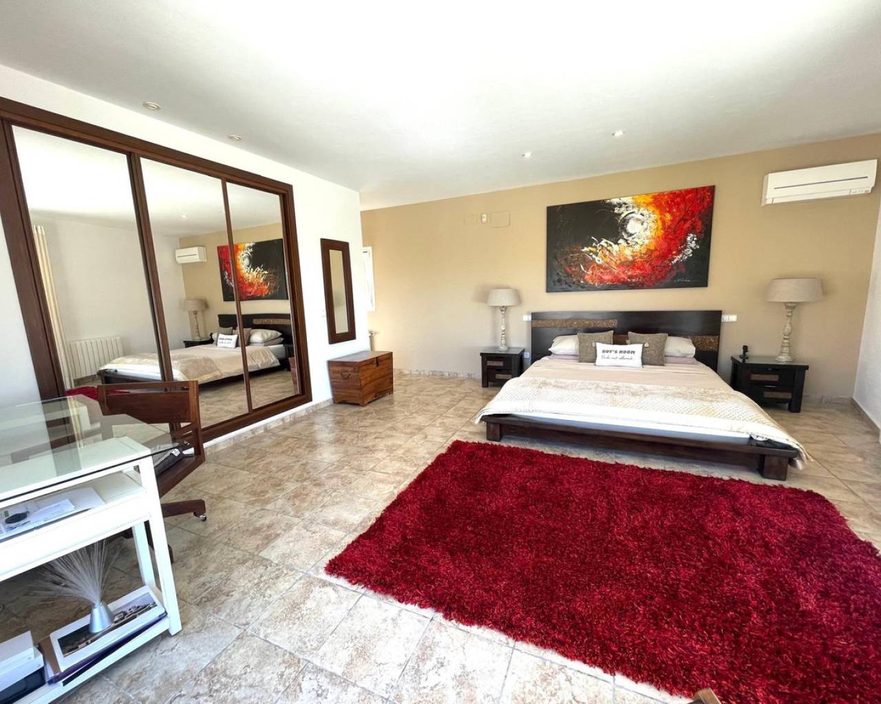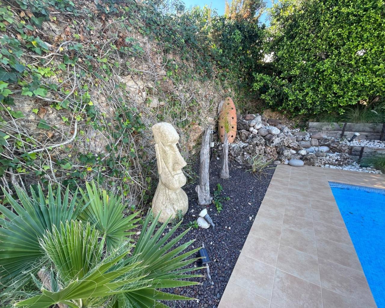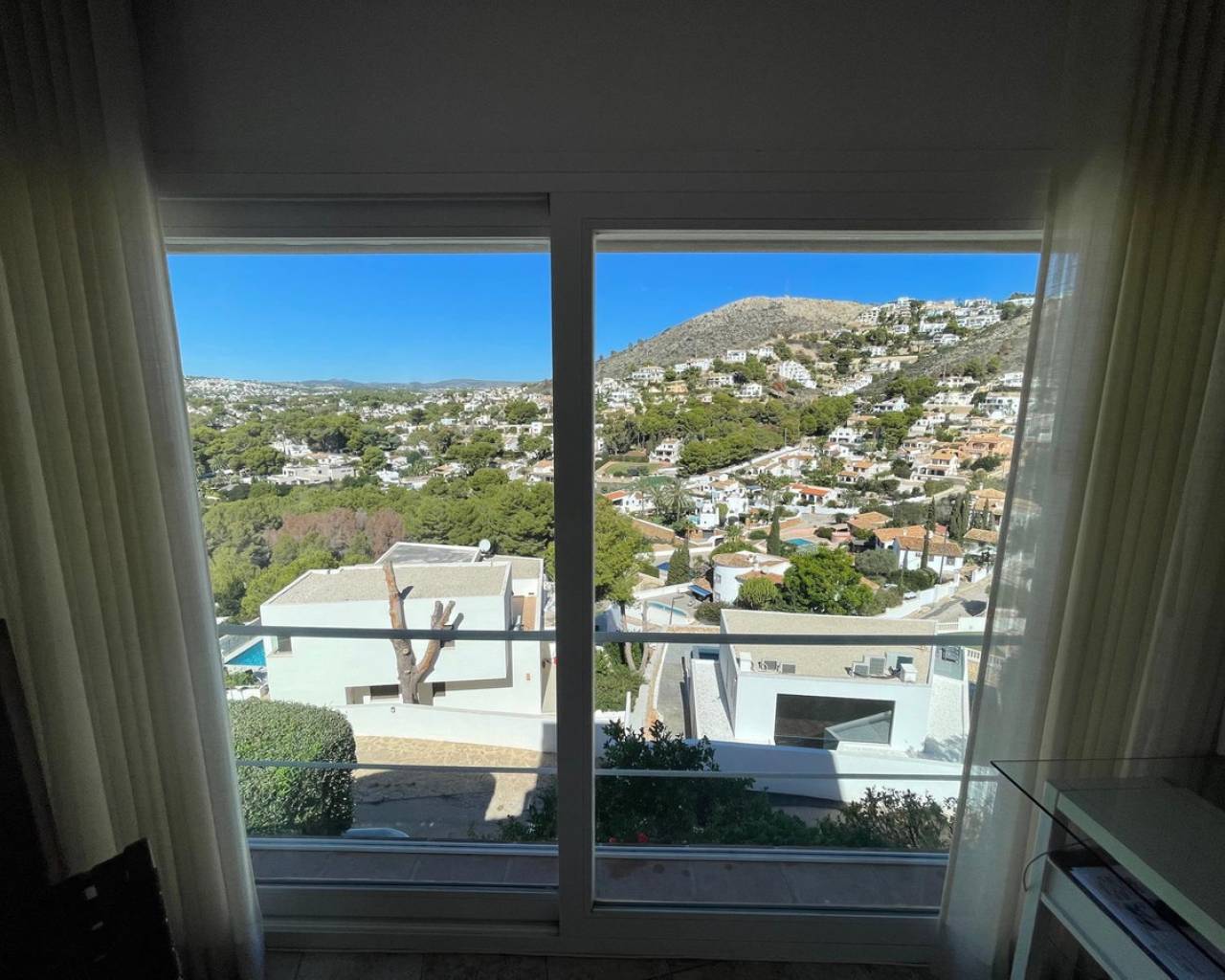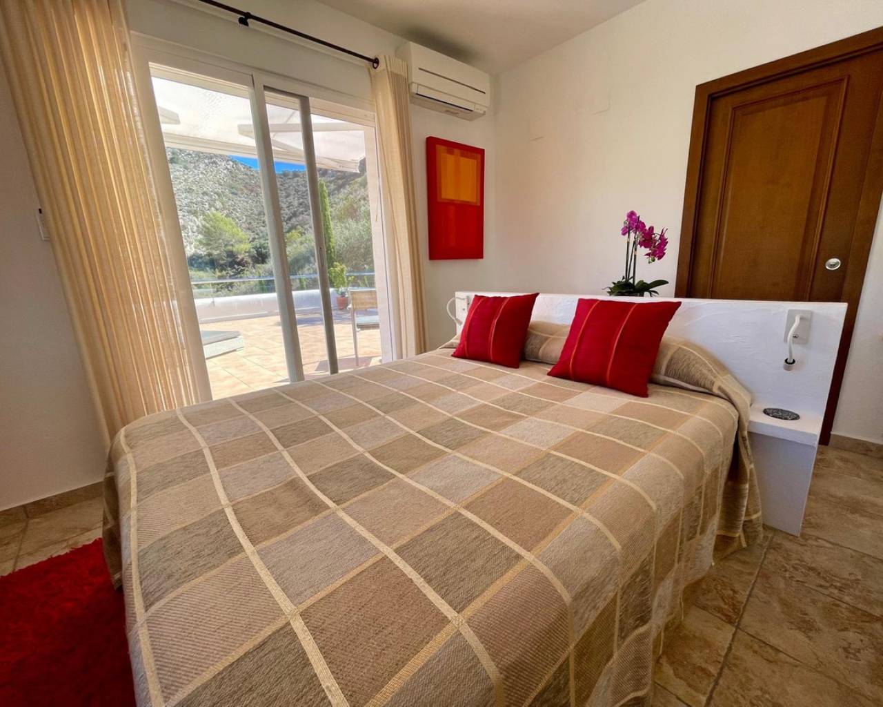 Villa solace, El Portet, Moraira. Villa Solace "The Bond Villa" This delightful Ibizan-styled villa is owned by two world-acclaimed film and theatre producers, which gives a clue as to where the name of this villa came from. Perches on the hillside above the neighbouring villas look over the Valley of El Portet; this villa could be a setting out of a James Bond film, with dramatic panoramic open views of the Benrnia Mountains and the turquoise blue sea. As you approach Villa Solace, the architectural metal automated driveway gates glide open, revealing a long, sweeping drive that leads you to a spacious carport and the principal entrance of this exquisite property. Upon entering, you're welcomed by a bright, airy entrance hallway that opens into a large lounge area featuring a central fireplace that creates a cosy atmosphere. The lounge seamlessly connects to the covered dining terrace by the pool, perfect for entertaining or relaxing by the water. Adjacent to the lounge, you'll find a fully equipped modern kitchen with a utility room at the back. This kitchen offers convenient access to the expansive covered terrace, an ideal spot for alfresco dining, lounging, or simply soaking in the breathtaking surroundings. The infinity swimming pool, framed by mature, manicured shrubs and trees, provides a serene backdrop for leisurely swimming and sunbathing. Venturing to the first floor, you'll discover two stylish bedrooms, each featuring en-suite shower rooms, built-in wardrobes, and air conditioning for comfort. One of these bedrooms boasts access to a spacious terrace, allowing for private outdoor relaxation. The villa's upper level is dedicated to the luxurious Master Bedroom, complete with an en-suite bathroom that showcases a generous walk-in shower. Here, you can unwind in the soaking tub while gazing through the purpose-designed picture window that offers stunning views. The Master Bedroom is exceptionally spacious and bright, also providing access to a large roof terrace where you can enjoy panoramic vistas that are truly breathtaking. The interior design beautifully combines natural sandstone white-washed walls with timber beams and garden sleepers, embodying the essence of an Ibizan-quality villa set in the desirable El Portet area of Moraira. This enchanting property promises a sophisticated, tranquil lifestyle perfectly suited for those seeking elegance, comfort, and spectacular surroundings. Additionally Benefits -Separate studio that is currently used as a cinema room, Gym along with a large En-suite. This area is also used as a guest bedroom when required. -14 Solar Panels with 10klw Batteries - Heat pump which is very economical to run. -Security cameras -Automatic irrigation system in the garden -Video entry system -Mature garden with Orange, lemon, and tangerine trees, along with a olive tree. - Alarm system -Private patio terrace -Furnished inside and out - Additional land to the rear of the property, approximately 6m of the mountainside, which could house additional solar panels for example. - High speed firber Internet. - Automatic gates -Central heating -Outside shower -Privacy -Open mountain and sea views