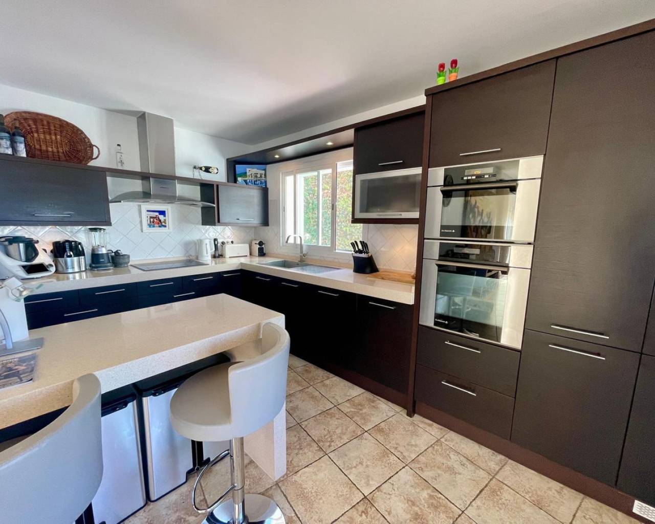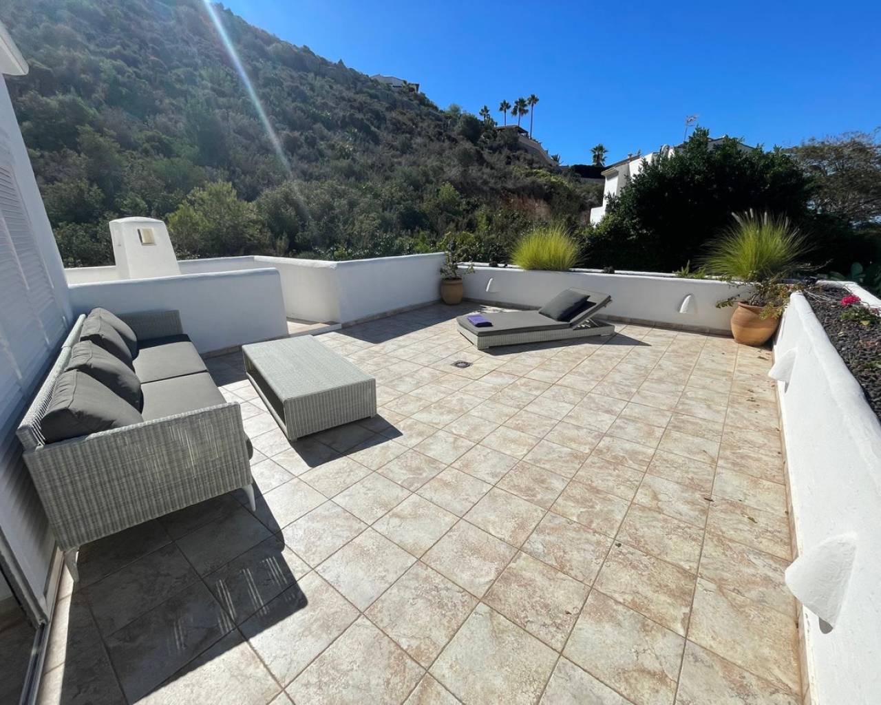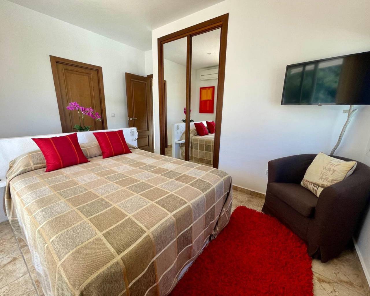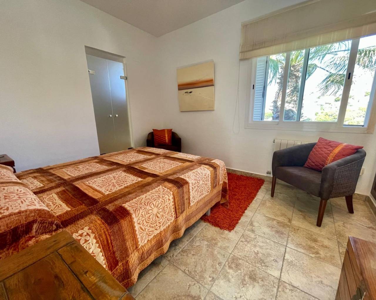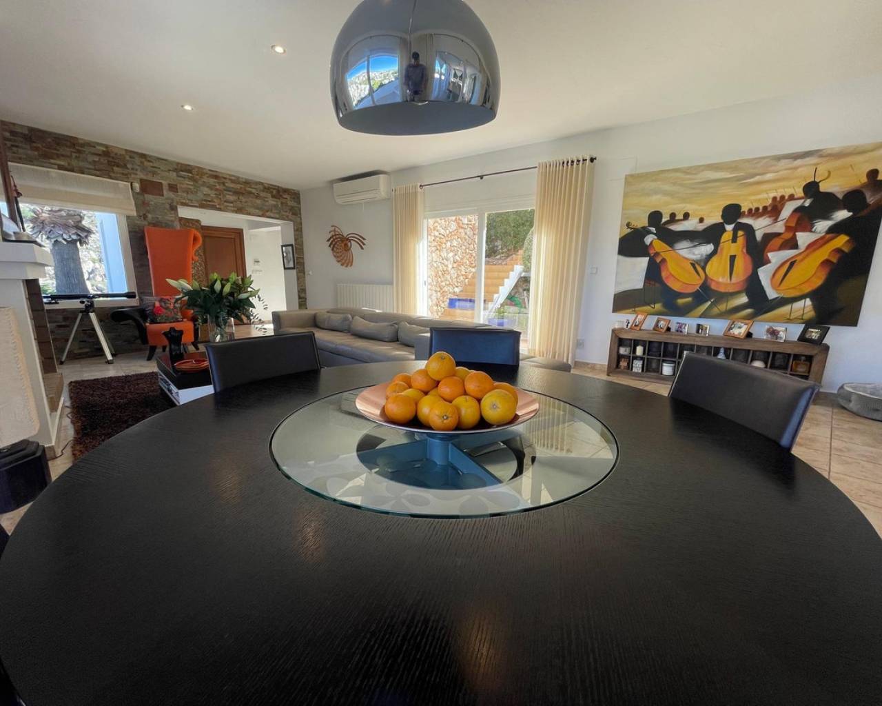 Villa solace, El Portet, Moraira. Villa Solace "The Bond Villa" This delightful Ibizan-styled villa is owned by two world-acclaimed film and theatre producers, which gives a clue as to where the name of this villa came from. Perches on the hillside above the neighbouring villas look over the Valley of El Portet; this villa could be a setting out of a James Bond film, with dramatic panoramic open views of the Benrnia Mountains and the turquoise blue sea. As you approach Villa Solace, the architectural metal automated driveway gates glide open, revealing a long, sweeping drive that leads you to a spacious carport and the principal entrance of this exquisite property. Upon entering, you're welcomed by a bright, airy entrance hallway that opens into a large lounge area featuring a central fireplace that creates a cosy atmosphere. The lounge seamlessly connects to the covered dining terrace by the pool, perfect for entertaining or relaxing by the water. Adjacent to the lounge, you'll find a fully equipped modern kitchen with a utility room at the back. This kitchen offers convenient access to the expansive covered terrace, an ideal spot for alfresco dining, lounging, or simply soaking in the breathtaking surroundings. The infinity swimming pool, framed by mature, manicured shrubs and trees, provides a serene backdrop for leisurely swimming and sunbathing. Venturing to the first floor, you'll discover two stylish bedrooms, each featuring en-suite shower rooms, built-in wardrobes, and air conditioning for comfort. One of these bedrooms boasts access to a spacious terrace, allowing for private outdoor relaxation. The villa's upper level is dedicated to the luxurious Master Bedroom, complete with an en-suite bathroom that showcases a generous walk-in shower. Here, you can unwind in the soaking tub while gazing through the purpose-designed picture window that offers stunning views. The Master Bedroom is exceptionally spacious and bright, also providing access to a large roof terrace where you can enjoy panoramic vistas that are truly breathtaking. The interior design beautifully combines natural sandstone white-washed walls with timber beams and garden sleepers, embodying the essence of an Ibizan-quality villa set in the desirable El Portet area of Moraira. This enchanting property promises a sophisticated, tranquil lifestyle perfectly suited for those seeking elegance, comfort, and spectacular surroundings. Additionally Benefits -Separate studio that is currently used as a cinema room, Gym along with a large En-suite. This area is also used as a guest bedroom when required. -14 Solar Panels with 10klw Batteries - Heat pump which is very economical to run. -Security cameras -Automatic irrigation system in the garden -Video entry system -Mature garden with Orange, lemon, and tangerine trees, along with a olive tree. - Alarm system -Private patio terrace -Furnished inside and out - Additional land to the rear of the property, approximately 6m of the mountainside, which could house additional solar panels for example. - High speed firber Internet. - Automatic gates -Central heating -Outside shower -Privacy -Open mountain and sea views