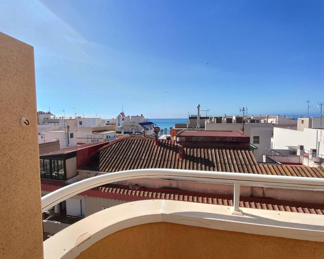 Discover this impressive penthouse located in the coveted area of the Paseo Marítimo de Torrevieja, just 200 meters from the beach. With a total area of 101 m2 and a private solarium of 22 m 2, this property offers the ideal space to enjoy the Mediterranean climate. It has a double and two single rooms, as well as two full bathrooms that guarantee comfort. The kitchen is fully equipped and has modern finishes such as porcelain floors and exterior carpentry Climalit that ensure energy efficiency. It should be noted its large fitted wardrobes, electric heating and abundant natural lighting thanks to its southeast orientation. Its extras include PMR access facilitating accessible commuting, central location near shopping malls, hospital parks and schools. On top of that, you will find frontal sea views from your terrace. Enjoy additional amenities such as storage rooms included(2) in the offer, garage (with space for up to two cars), and reasonable community fees. Free to enter and ready to enjoy!