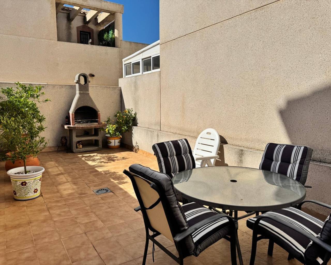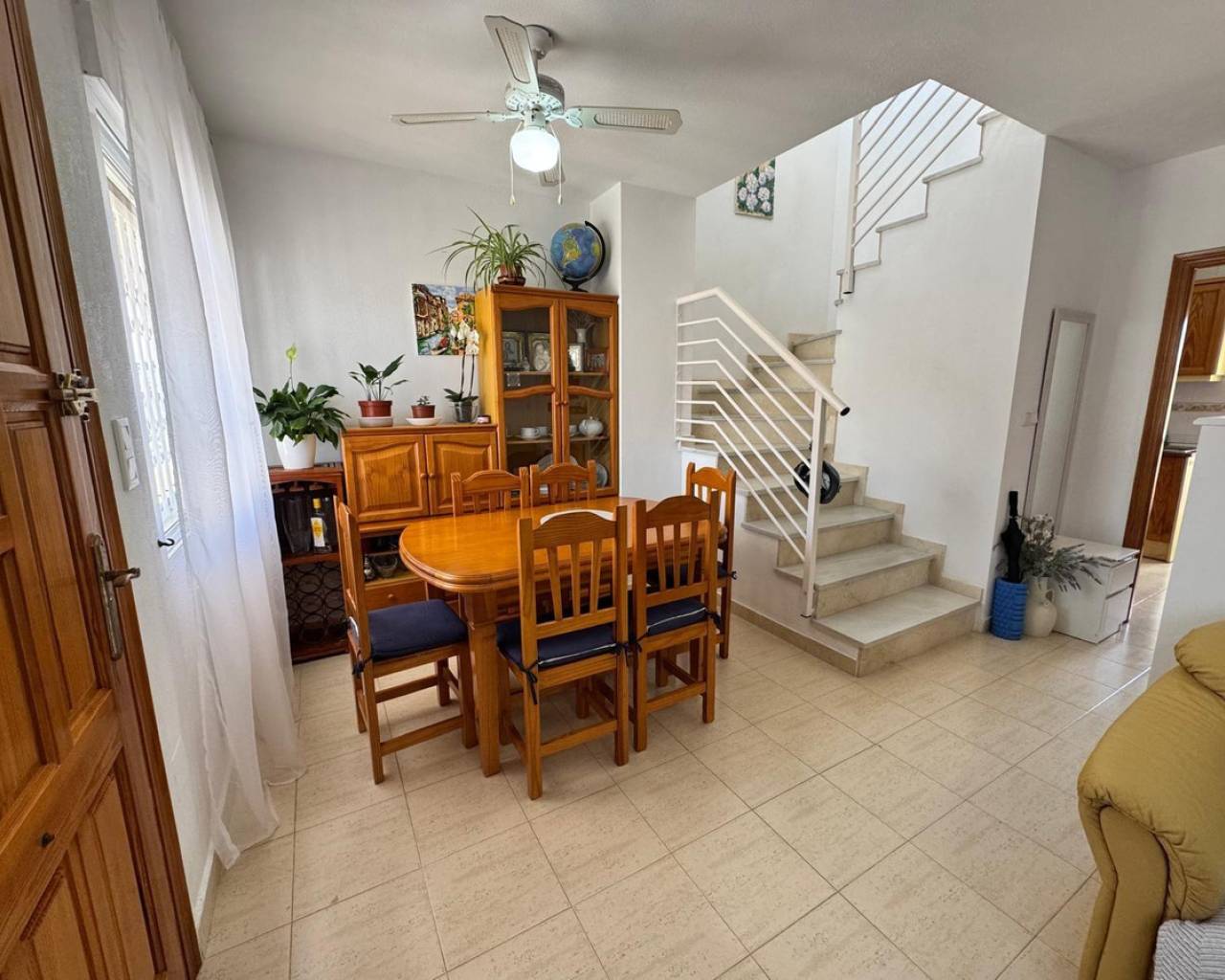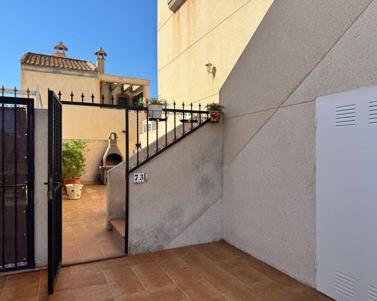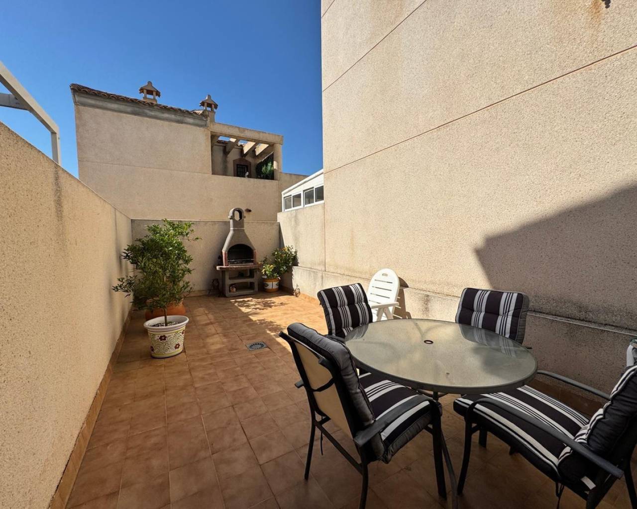 We present this charming townhouse located in the quiet area of Las Filipinas, in Orihuela Costa. With a surface area of 90 m² and a functional design that maximizes space, this property is perfect for both year-round living and vacation enjoyment. It features three spacious double bedrooms and two fully equipped bathrooms, ensuring comfort and privacy for its residents. The kitchen is ready to use and includes all necessary appliances. The southeast orientation allows for excellent natural light throughout most of the day, creating a cozy atmosphere. Additional amenities include hot and cold air conditioning, spacious built-in wardrobes, and a bright balcony where you can relax at the end of the day while enjoying unobstructed views of nearby green areas or even the sea. The exterior does not disappoint: it features a well-maintained garden ideal for spending pleasant moments outdoors; it also has a built-in barbecue perfect for gatherings with family or friends. It also has access to a communal pool located within the residential complex. Its location is unbeatable; Located just 5,000 meters (5 km) from the nearest beach, it offers a variety of recreational options, including renowned golf courses and numerous playgrounds ideal for young families. You'll also be surrounded by all the necessary urban amenities, such as supermarkets, regular buses, shopping centers, schools, etc.; with very reasonable community fees of just €280 per year! Don't miss out on this unique opportunity... Contact us today!