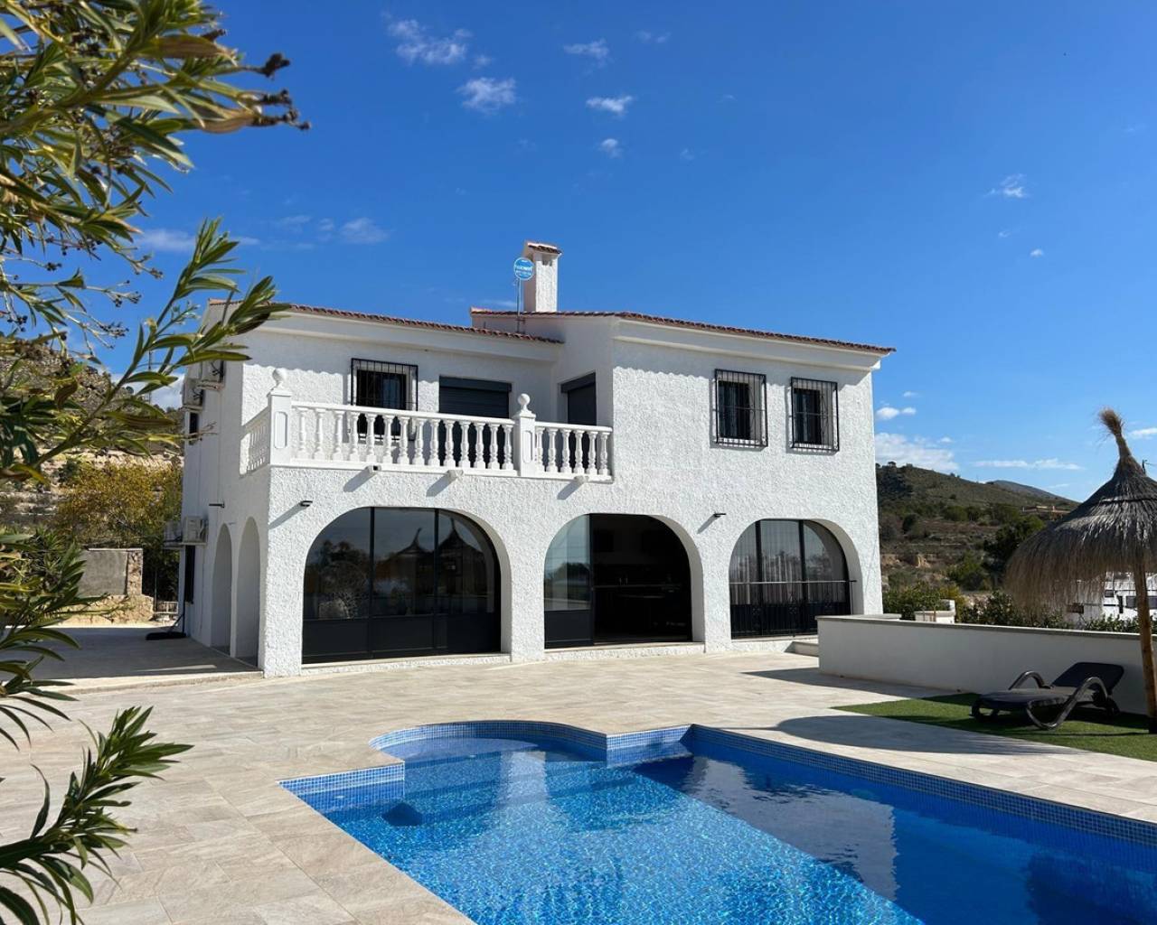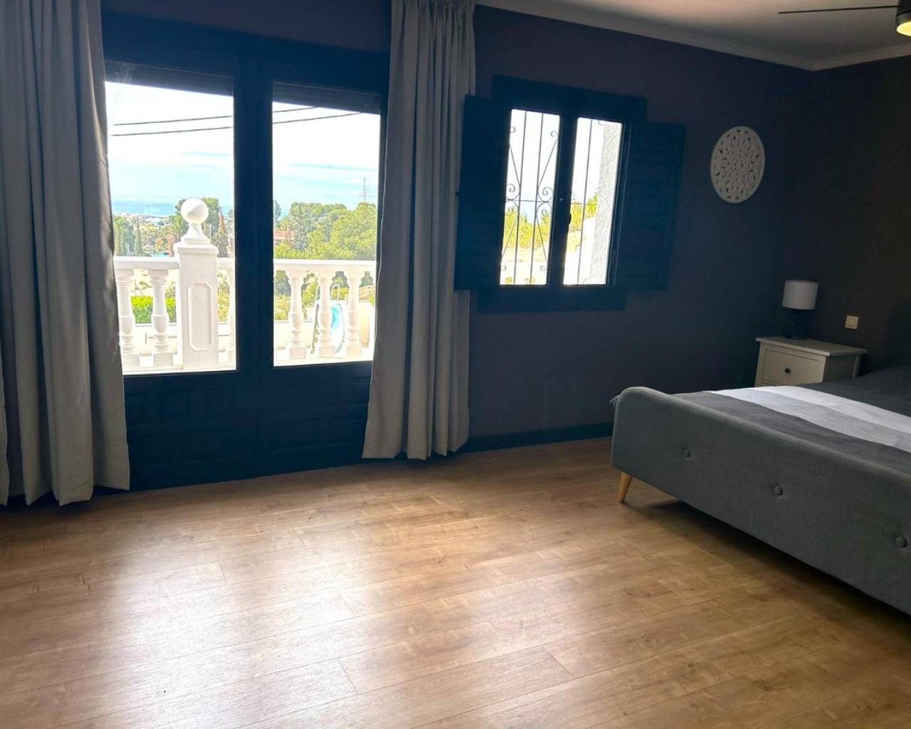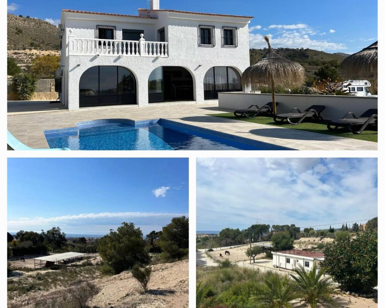Located in a quiet area of Villajoyosa, famous for its colorful houses and dreamlike beaches, this property combines luxury, comfort, and nature.???? The Main Villa (241 m² fully renovated):-- 2 floors with an ideal layout.-- Ground floor: spacious open area of 70 m² with a modern fully equipped kitchen ????, sliding glass doors that merge indoor and outdoor living ????, 2 bedrooms and 1 bathroom with shower ????.-- Upper floor: bright living room with open kitchen, 2 additional bedrooms, including the master with private terrace and stunning sea ???? and Villajoyosa views ????.-- Sunny terraces, air conditioning ❄️, water filtration system ????, and full privacy on a quiet cul-de-sac.???? Guest House / Chalet (60 m²):-- 3 bedrooms ????️, 1 bathroom ????, living room with open kitchen + bar ????.-- Direct access to the garden ???? through sliding doors.-- Views of the equestrian area ????.???? Equestrian Zone:-- 5 covered stables with feed storage.-- REGA license in place ✔️.-- Direct access to the mountains for outdoor rides and horse trails ????.???? Exteriors & Extras:-- Spectacular private pool, fully renovated, with slide ????♂️.-- Non-slip terrace for maximum safety.-- Large garage with decorative arches ???? and closed storage room.-- 10 solar panels ☀️ for energy efficiency.-- Plot of 7,701 m² facing south ????.???? Privileged Location:-- Only 8 minutes from the beach ????️.-- 10 min from Benidorm ????, 40 km from Alicante Airport ✈️, and 1h30 from Valencia.-- Close to golf courses ⛳, amusement parks ????, zoo ????, and La Marina shopping center ????️.-- Surrounded by charming villages such as Altea, Albir, and El Campello.✅ Basic Features:-- Independent 2-story chalet.-- 4 bedrooms + 2 bathrooms in the main villa.-- Guest house with 3 bedrooms + 1 bathroom.-- Pool, garden, terraces, and balcony.-- Garage + storage room.-- Solid construction (1990) in excellent condition.???? Unbeatable Price & Quality! ????This property is not just a house, it's a unique lifestyle between the sea, nature, and comfort!???? Contact us today and come discover your new home in Villajoyosa!