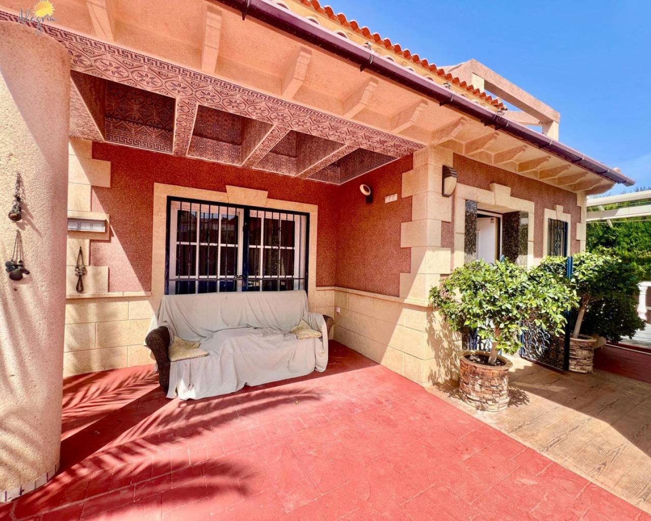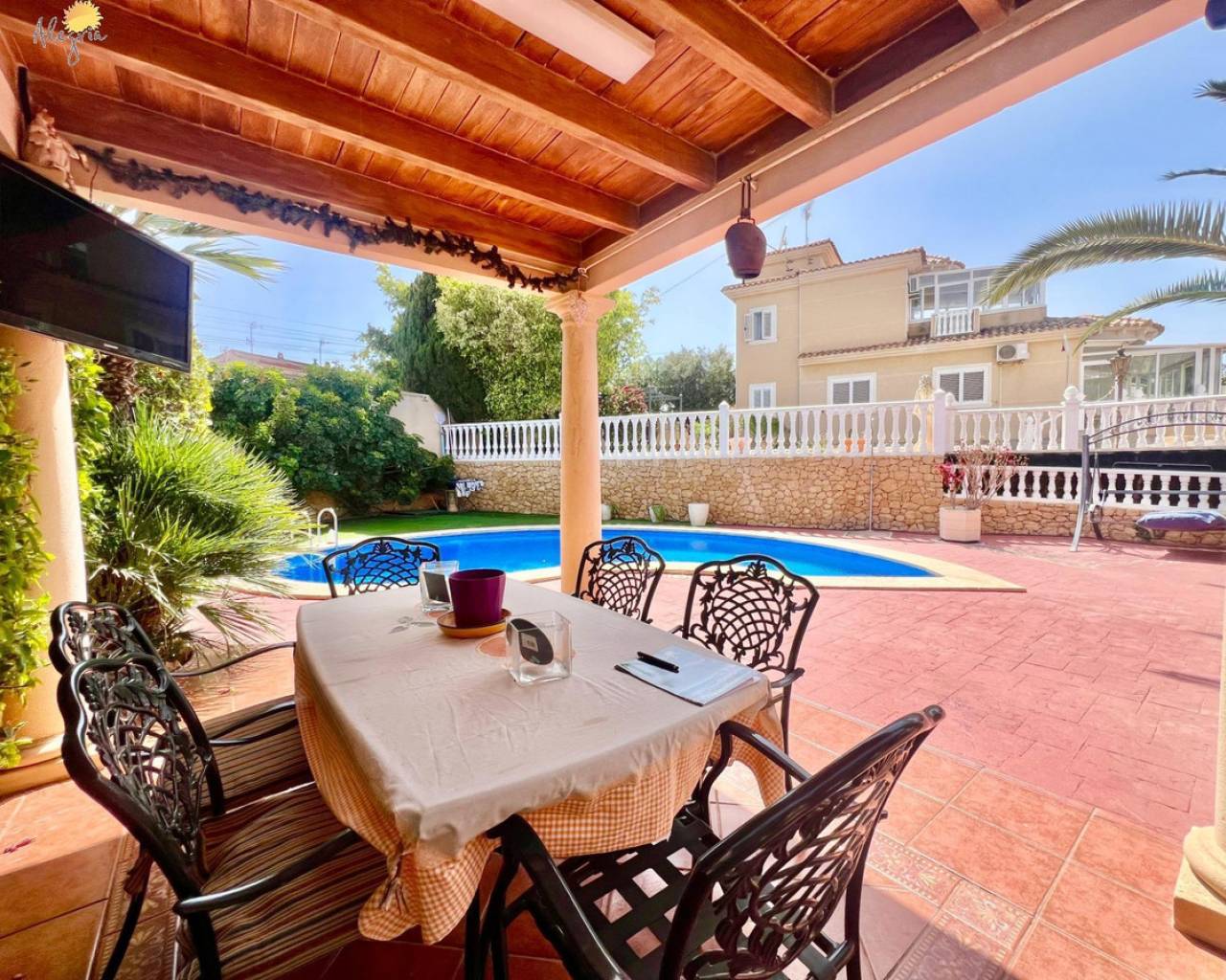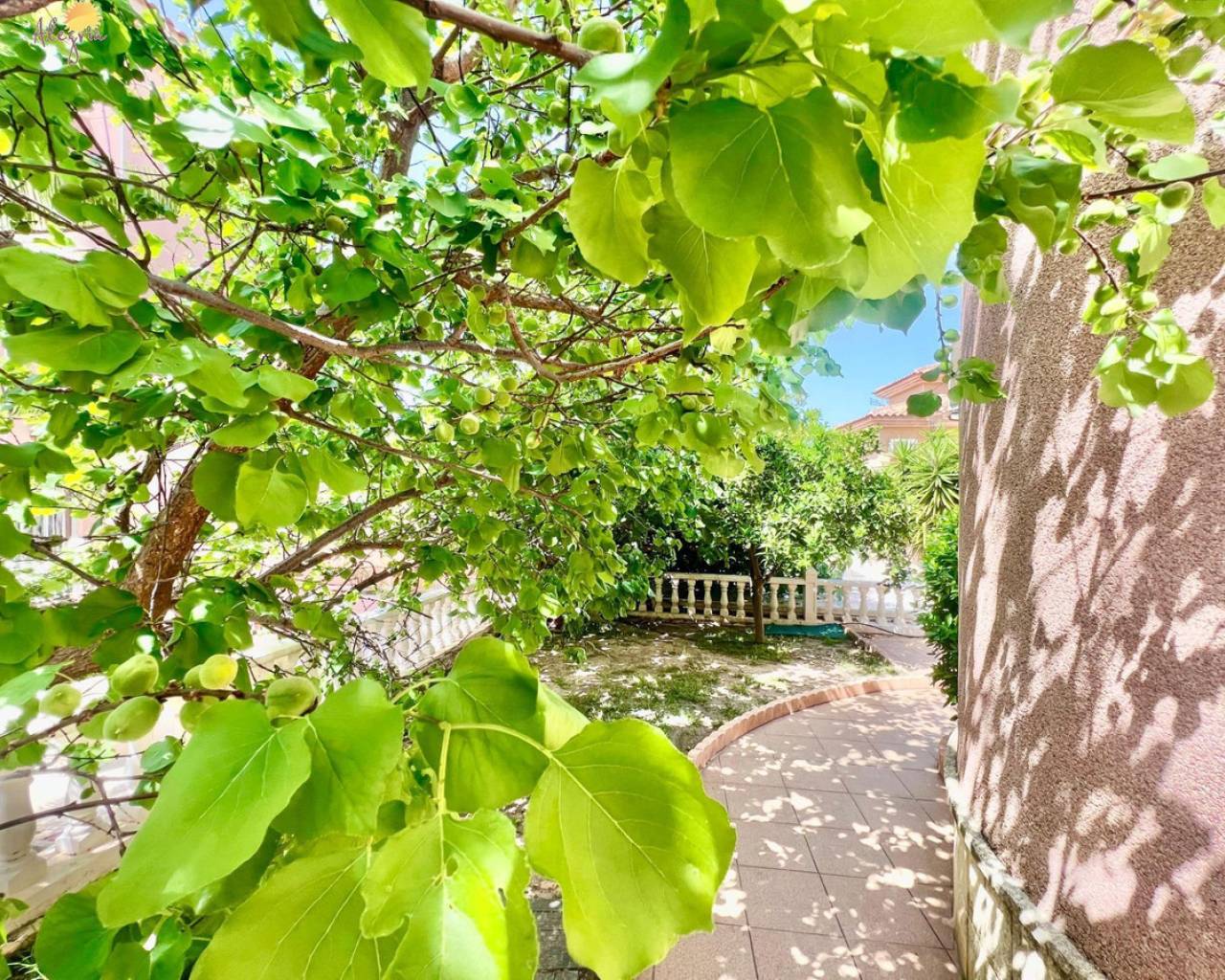 Discover this stunning villa located in the coveted area of Los Balcones, just 1.6 km from the splendid beaches of Torrevieja. This property boasts a generous built area of 151 m2 on an extensive private plot of 367 m2, providing an ideal space for outdoor enjoyment. The villa features three spacious double bedrooms and two full bathrooms equipped with windows for better ventilation, as well as a practical additional toilet.The upper floors house two cozy bedrooms complemented by private terraces ideal for enjoying clear views.Designed with modern comfort in mind, it includes a fully equipped kitchen and a bright living room that opens to outdoor spaces perfect for relaxing or entertaining. Its south orientation ensures abundant natural light throughout the day while the high ceilings add even more spaciousness.Outside, you will find attractive garden areas adorned with fruit trees next to the private pool where you can refresh yourself under the Mediterranean sun; there is also a barbecue perfect for family gatherings and a closed garage included that offers extra convenience.In this well-connected villa, you will have quick access to essential services including schools, banks, and hospitals, where every corner is designed for both investing and establishing your home. You will also have extras such as heating, pre-installed central air conditioning ducts, and an alarm system. Live in a select environment!