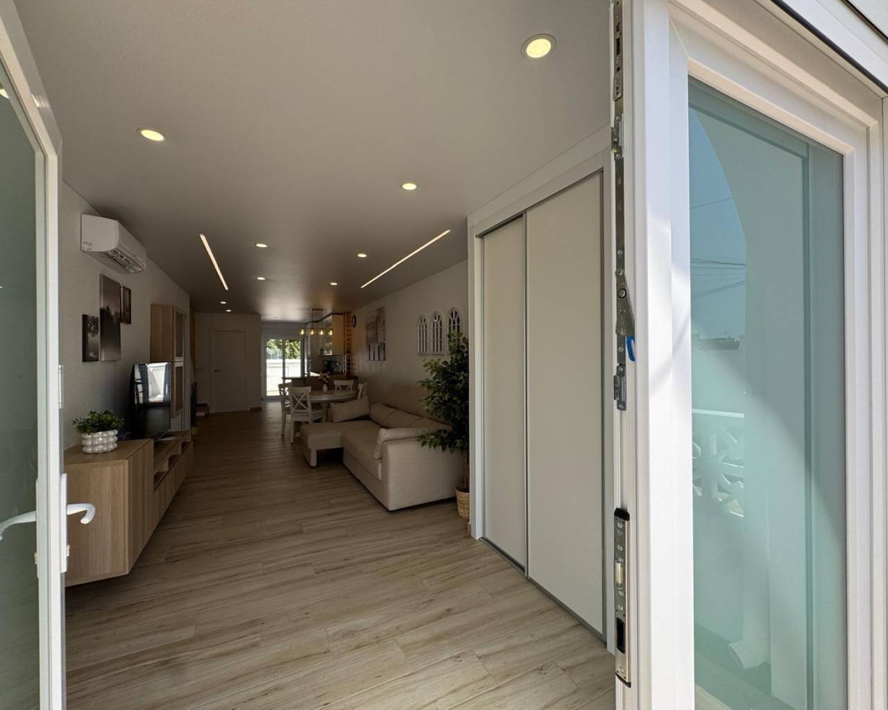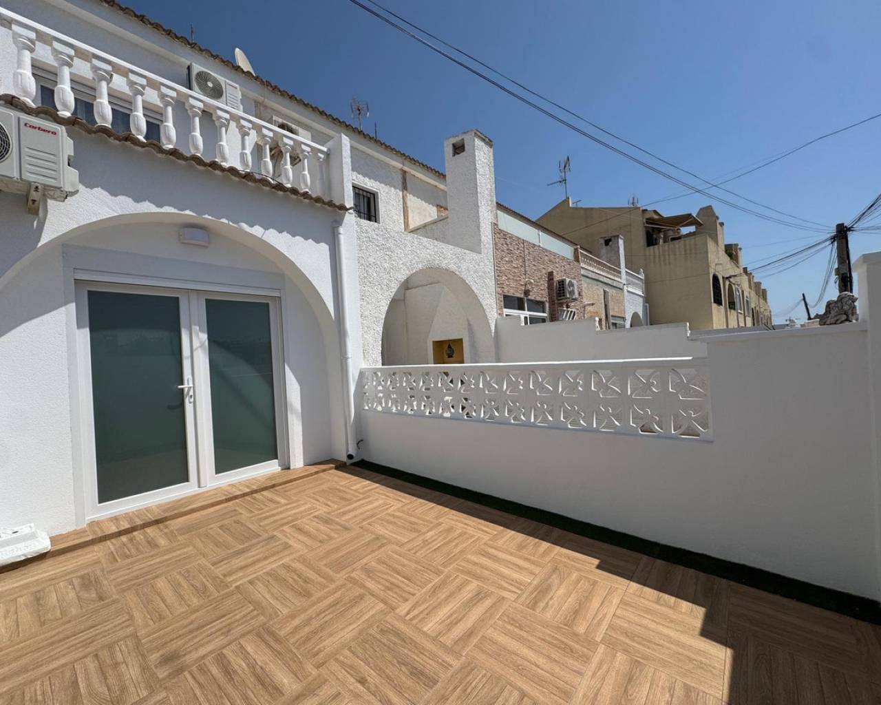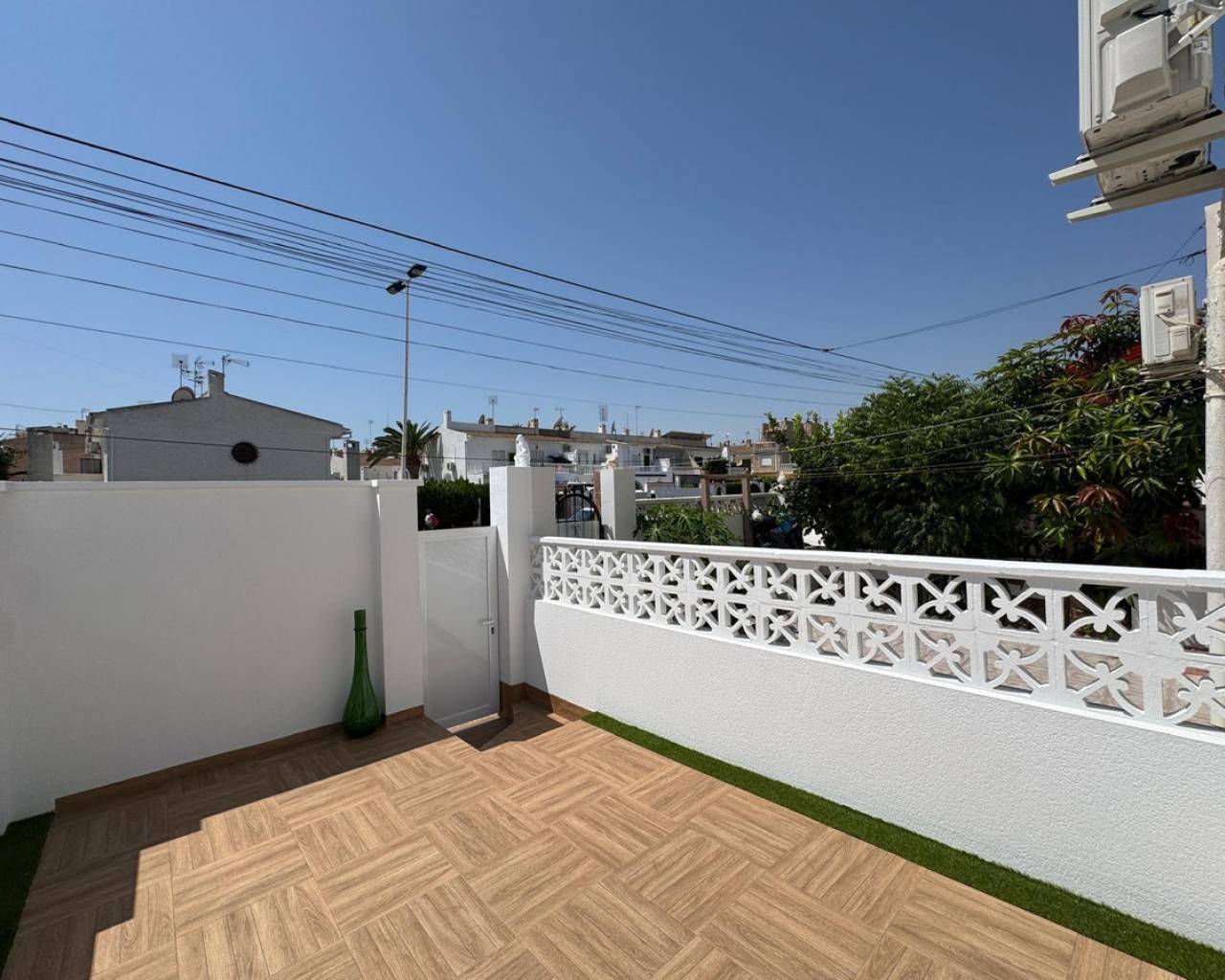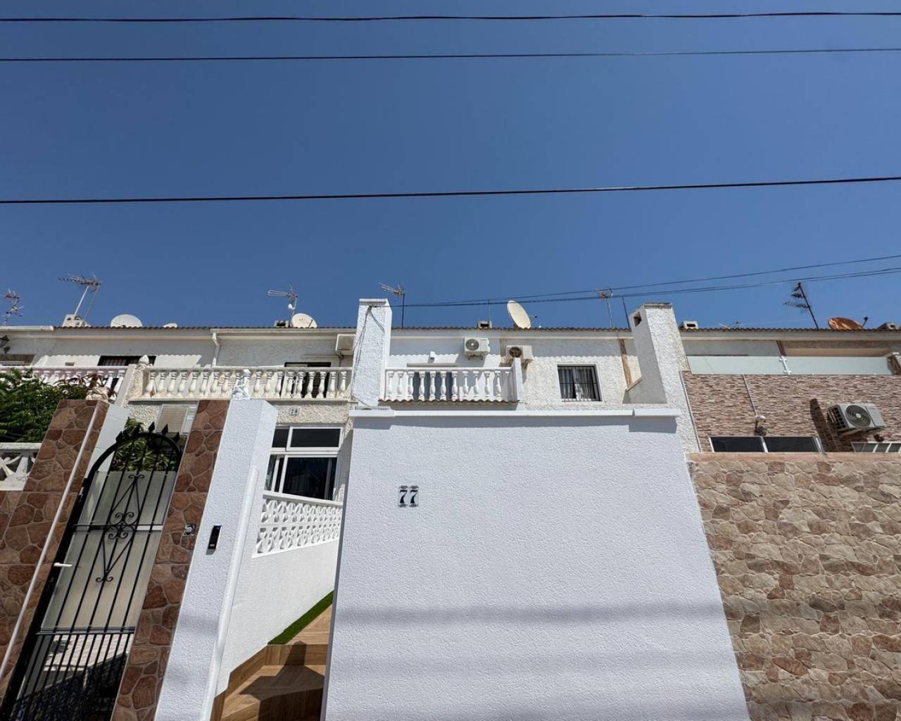 Modern and cozy townhouse for sale, ready to move in!This spacious townhouse with three bedrooms and two bathrooms is an excellent option for both permanent residence and family vacations. Each bedroom has air conditioning, ensuring a pleasant climate all year round. The living room also has its own air conditioning.DistributionOn the ground floor, we find a very spacious living-dining room, integrated with the kitchen in open space style, providing spaciousness and brightness. The property has undergone a complete renovation, with a full renewal of the electrical and plumbing installations, ensuring maximum safety and durability.Condition and equipmentIt is sold fully furnished and equipped with all necessary appliances — everything seen in the photos is included in the price.Outdoor spaces• Main terrace of 20 m² — ideal for enjoying morning coffee or relaxing at sunset.• Back terrace (30 m²) with access to the patio — perfect for barbecues, outdoor meals, or as a play area for children.On the upper floor:• Terrace of 10 m² — perfect for sunbathing or relaxing privately.• Terrace of 15 m² — with views of the park and community pool.Finishes and extras• Laminated flooring on the upper floor and wood-effect ceramic tiles on the ground floor.• Tensioned ceilings with modern lighting.• Electric blinds.• Decorative elements, high-quality fittings on interior doors.• Magnetic locking system on doors.InfrastructureLocated in an urbanization with a community pool and green areas, ideal for families. Within walking distance of shops, cafes, schools, public transport, and all necessary services.???? Usable area: 75 m²???? Pool: community???? Excellent location: quiet area but close to the center and the beaches