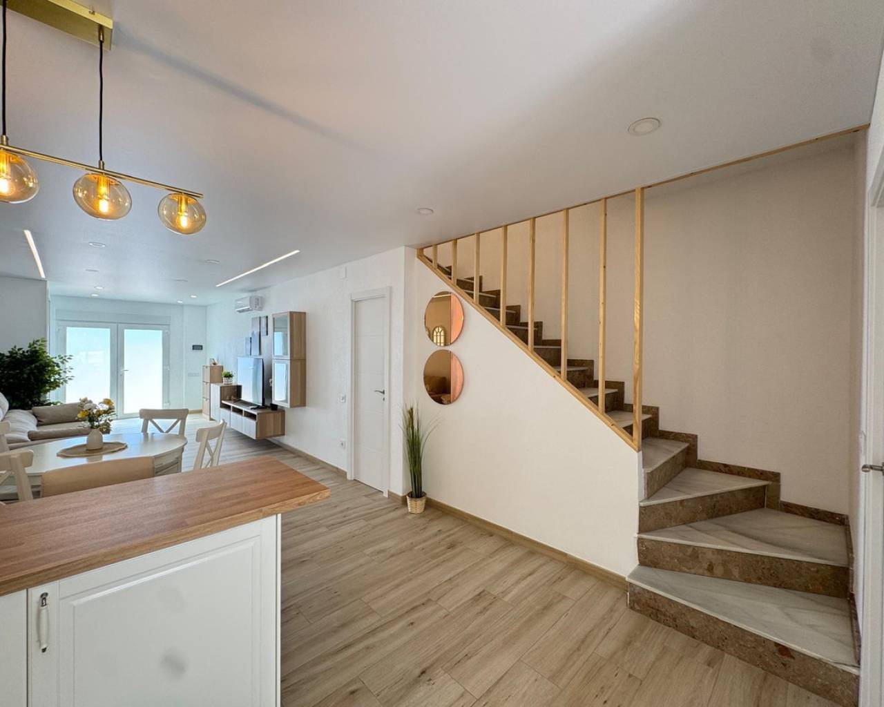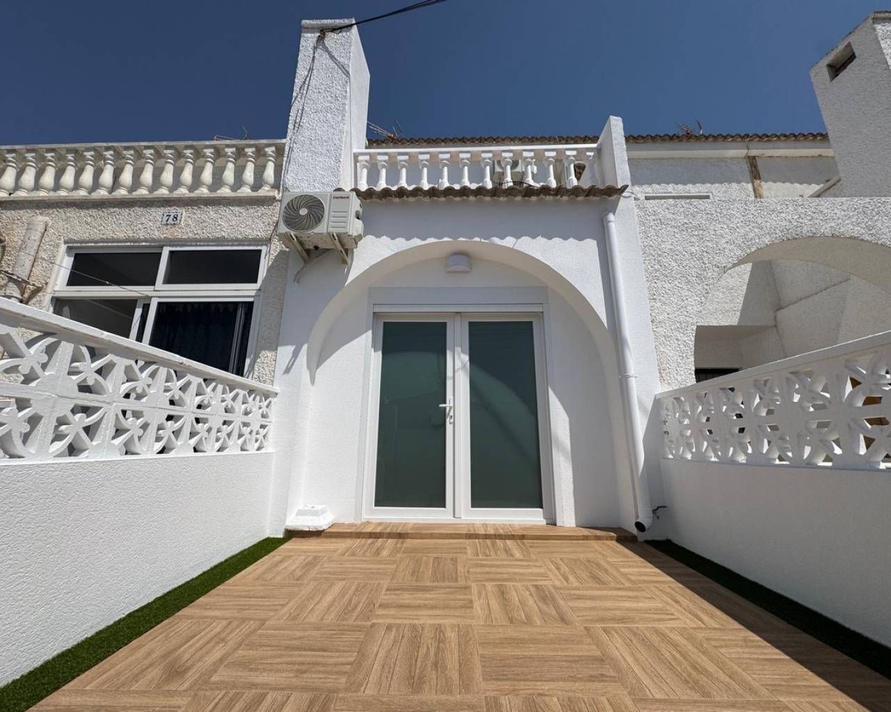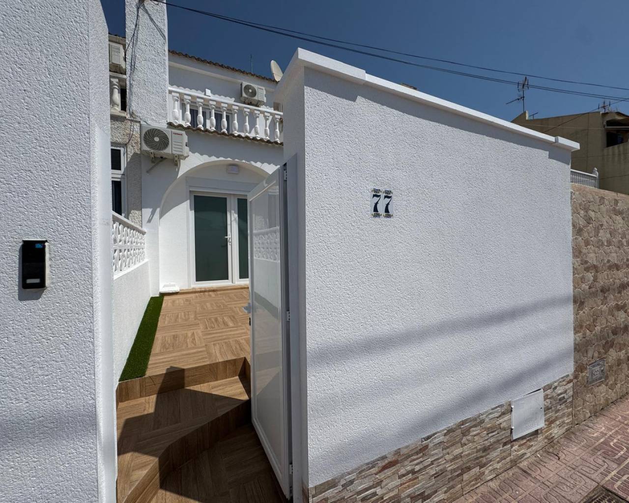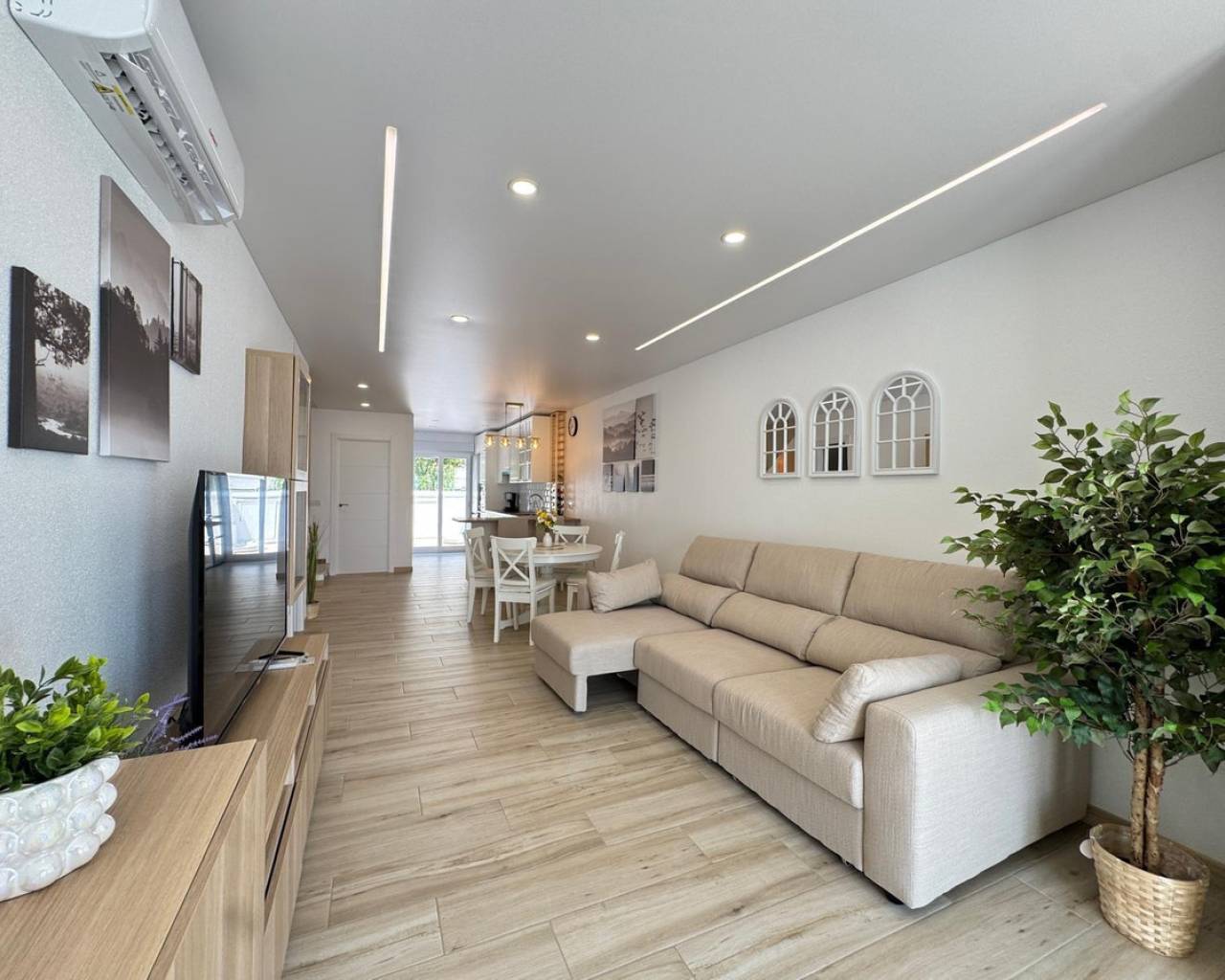 Modern and cozy townhouse for sale, ready to move in!This spacious townhouse with three bedrooms and two bathrooms is an excellent option for both permanent residence and family vacations. Each bedroom has air conditioning, ensuring a pleasant climate all year round. The living room also has its own air conditioning.DistributionOn the ground floor, we find a very spacious living-dining room, integrated with the kitchen in open space style, providing spaciousness and brightness. The property has undergone a complete renovation, with a full renewal of the electrical and plumbing installations, ensuring maximum safety and durability.Condition and equipmentIt is sold fully furnished and equipped with all necessary appliances — everything seen in the photos is included in the price.Outdoor spaces• Main terrace of 20 m² — ideal for enjoying morning coffee or relaxing at sunset.• Back terrace (30 m²) with access to the patio — perfect for barbecues, outdoor meals, or as a play area for children.On the upper floor:• Terrace of 10 m² — perfect for sunbathing or relaxing privately.• Terrace of 15 m² — with views of the park and community pool.Finishes and extras• Laminated flooring on the upper floor and wood-effect ceramic tiles on the ground floor.• Tensioned ceilings with modern lighting.• Electric blinds.• Decorative elements, high-quality fittings on interior doors.• Magnetic locking system on doors.InfrastructureLocated in an urbanization with a community pool and green areas, ideal for families. Within walking distance of shops, cafes, schools, public transport, and all necessary services.???? Usable area: 75 m²???? Pool: community???? Excellent location: quiet area but close to the center and the beaches