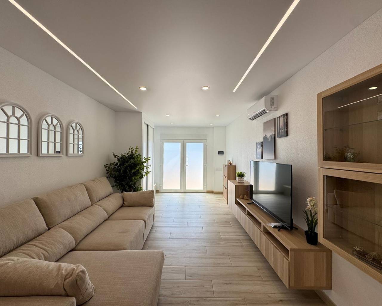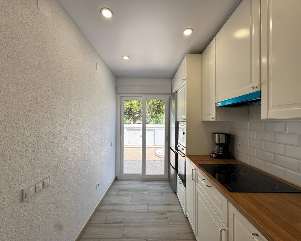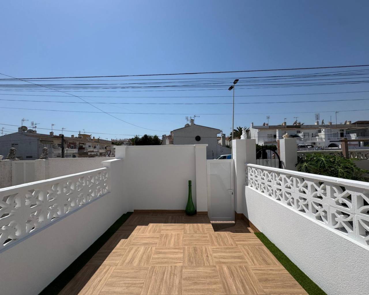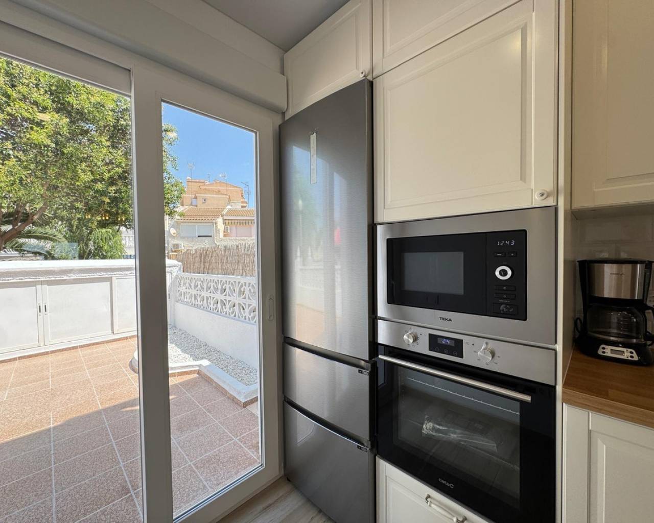 Modern and cozy townhouse for sale, ready to move in!This spacious townhouse with three bedrooms and two bathrooms is an excellent option for both permanent residence and family vacations. Each bedroom has air conditioning, ensuring a pleasant climate all year round. The living room also has its own air conditioning.DistributionOn the ground floor, we find a very spacious living-dining room, integrated with the kitchen in open space style, providing spaciousness and brightness. The property has undergone a complete renovation, with a full renewal of the electrical and plumbing installations, ensuring maximum safety and durability.Condition and equipmentIt is sold fully furnished and equipped with all necessary appliances — everything seen in the photos is included in the price.Outdoor spaces• Main terrace of 20 m² — ideal for enjoying morning coffee or relaxing at sunset.• Back terrace (30 m²) with access to the patio — perfect for barbecues, outdoor meals, or as a play area for children.On the upper floor:• Terrace of 10 m² — perfect for sunbathing or relaxing privately.• Terrace of 15 m² — with views of the park and community pool.Finishes and extras• Laminated flooring on the upper floor and wood-effect ceramic tiles on the ground floor.• Tensioned ceilings with modern lighting.• Electric blinds.• Decorative elements, high-quality fittings on interior doors.• Magnetic locking system on doors.InfrastructureLocated in an urbanization with a community pool and green areas, ideal for families. Within walking distance of shops, cafes, schools, public transport, and all necessary services.???? Usable area: 75 m²???? Pool: community???? Excellent location: quiet area but close to the center and the beaches