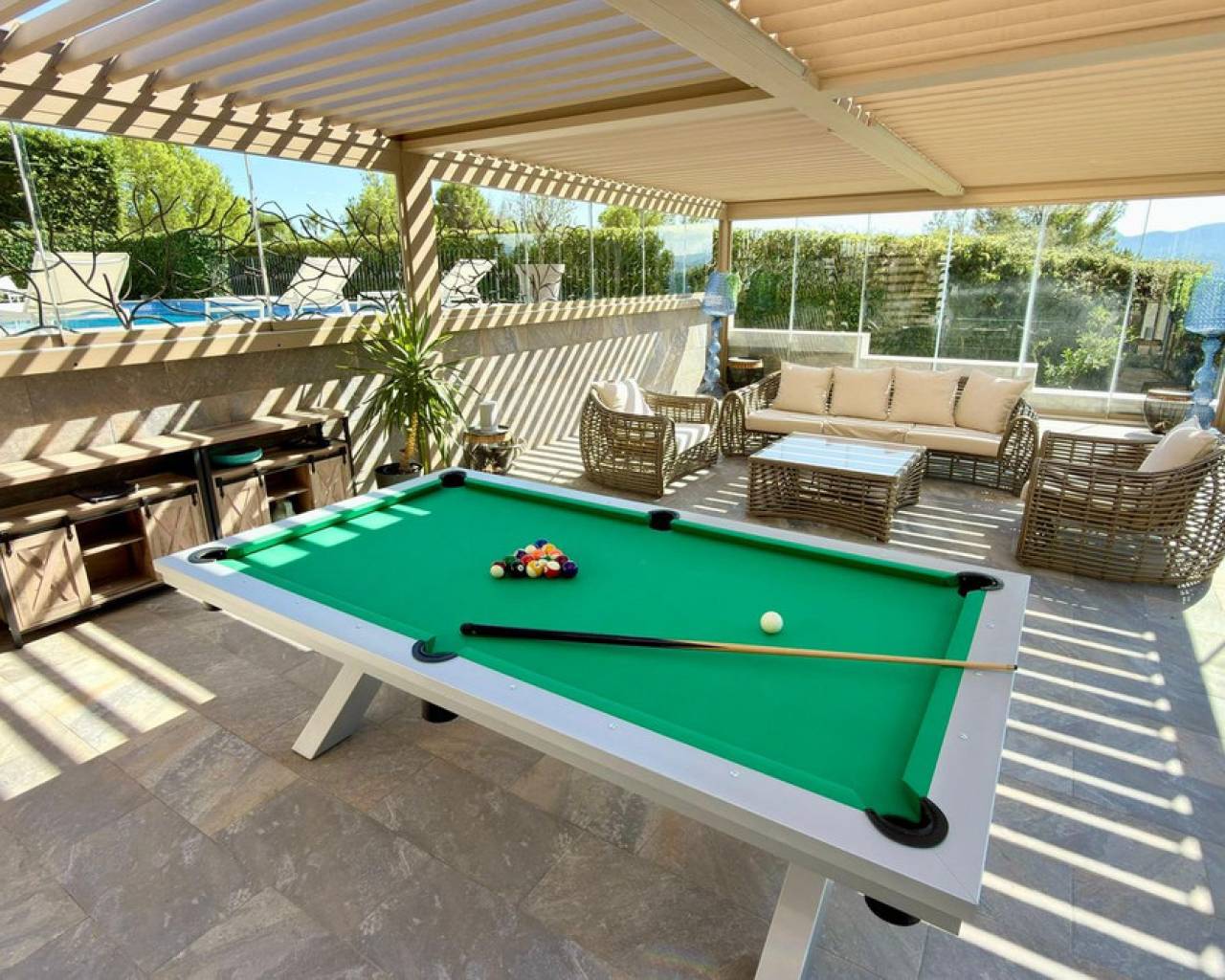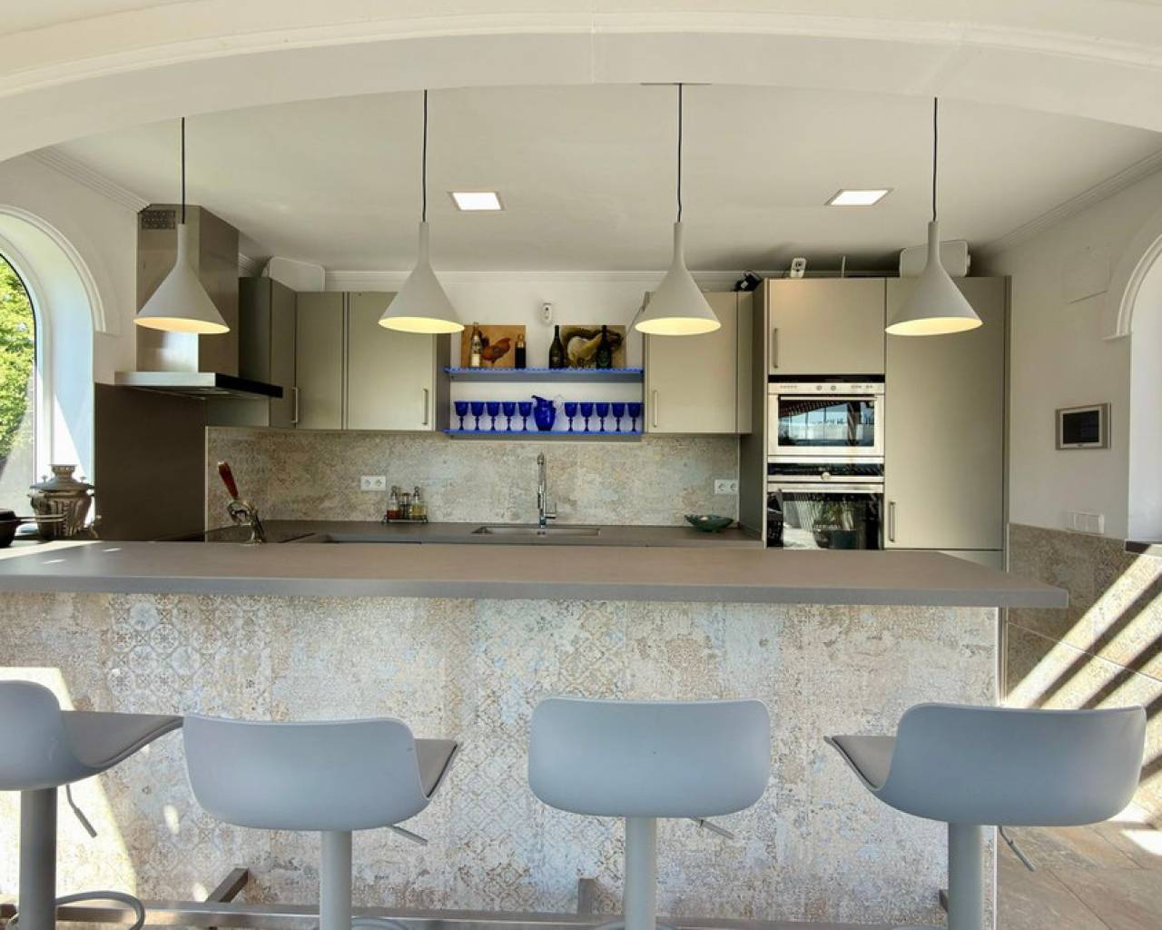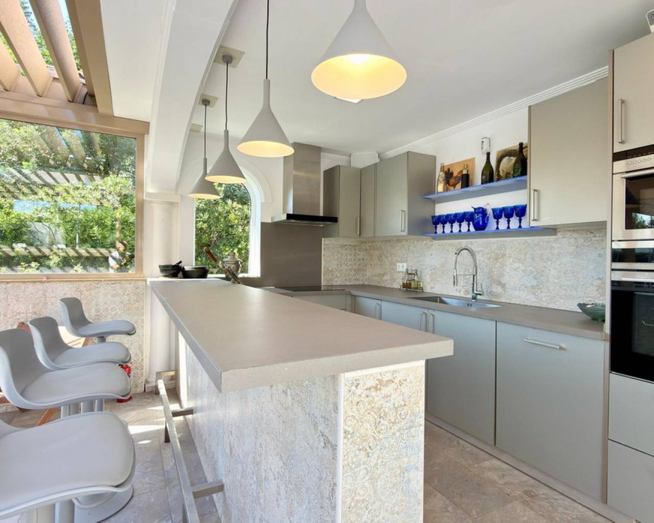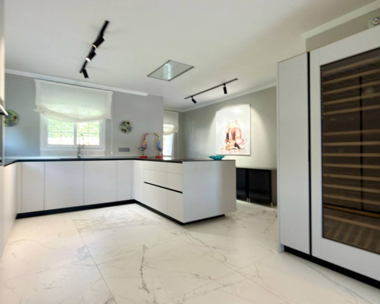 FOR SALE: EXCLUSIVE VILLA ON MONTGÓ, JÁVEA Enjoy stunning mountain and valley views from every corner of this fully furnished and equipped villa — ready to move in. • Total plot size: 3,150 m² • Main house: 439m² | Guest house: 144 m² DESCRIPTION The villa is located on a corner property, with no direct neighbors, in a very private area. The property consists of a two-storey main house with basement, guest house, heated saltwater swimming pool, summer kitchen with barbecue, enclosed pool area, basement with gym and karaoke room, dog house with workshop and garage. It has ample access for vehicles and a parking area. DISTRIBUTION AND DESIGN Main House The villa is distributed over two floors plus a basement, offering spacious and elegant living. It features three bedrooms, five bathrooms, a large dressing room, a private office, and a beauty room, making it ideal for both comfort and lifestyle. On the ground floor, a spectacular entrance hall with double-height ceilings and stained-glass windows welcomes you with natural light. The main living room includes a working fireplace with hand-painted golden details, while a second lounge area is designed for entertainment, equipped with a large TV and automatic blinds. The modern kitchen is fully equipped with high-quality appliances by Gaggenau, including an American-style fridge and a large wine fridge, and connects directly to the terraces, pool, and summer house. A guest toilet and office complete this level. The private study is set apart from the main living areas, offering an ideal environment for focused and quiet work. If needed, the space can easily be converted into an additional bedroom. Basement The lower level of the villa is dedicated to leisure and wellness. It features a fully equipped gym for everyday training, as well as a karaoke studio with professional sound system, microphones, and a large screen—a perfect space for entertainment with family and friends. Extras & Technology The villa is equipped with the latest comforts and technology to ensure a luxurious living experience. It offers air conditioning (heating and cooling) and underfloor heating throughout, as well as double-glazed windows with electric blinds for both efficiency and comfort. For entertainment, the house includes an 85-inch television, while video surveillance and a full smart-home system provide security and convenience. Connectivity is guaranteed thanks to fiber-optic internet with dual providers, always ensuring uninterrupted service. Pool & Chill-Out Areas At the heart of the estate lies the saltwater swimming pool with a heating system, perfect for year-round enjoyment. Surrounding the pool, a spacious terrace offers cozy chill-out areas, designed for relaxation and quality time with family and friends. Terraces & Leisure Areas The villa offers multiple outdoor spaces designed for both relaxation and entertainment. A fully equipped summer kitchen with automatic roof and BBQ makes it ideal for dining al fresco. The beautifully landscaped garden features over 60 palm trees and lush Mediterranean plants, all maintained with a domotics-controlled automatic irrigation system. Entrance & Additional Spaces The villa is accessed via double automatic gates a grand main entrance. The entire perimeter is secured with reinforced fencing, ensuring privacy and safety, while also adapted for pets. A guest house with open-plan kitchen and bathroom offers independence and comfort, with beautiful views of Montgó and the main residence. The garage with storage room is equipped with an electric car charger, providing modern convenience. For pet lovers, the property includes a dedicated dog kennel with cleaning area, covered open-air space, and a 36 m² workspace. The property has ample parking for 3–5 cars, completing the estate's functionality. Location The villa is located within 5 minutes' reach of La Sella golf course, several restaurants, as well as La Ermita Local Market supermarket. Jávea – a Mediterranean sanctuary between the sea and the mountains. This prestigious Costa Blanca destination blends the charm of a traditional coastal town with the comfort of an exclusive modern resort. Turquoise coves, over 300 days of sunshine a year, and the natural beauty of the Montgó Natural Park create an ideal setting for both relaxation and refined living. The town is divided into three key areas — the historic Old Town, the lively marina, and the vibrant Arenal beachfront. Here you'll find top-class dining, international school Xábia International College and a welcoming international community. Jávea offers a premium lifestyle in one of the most desirable Mediterranean locations.