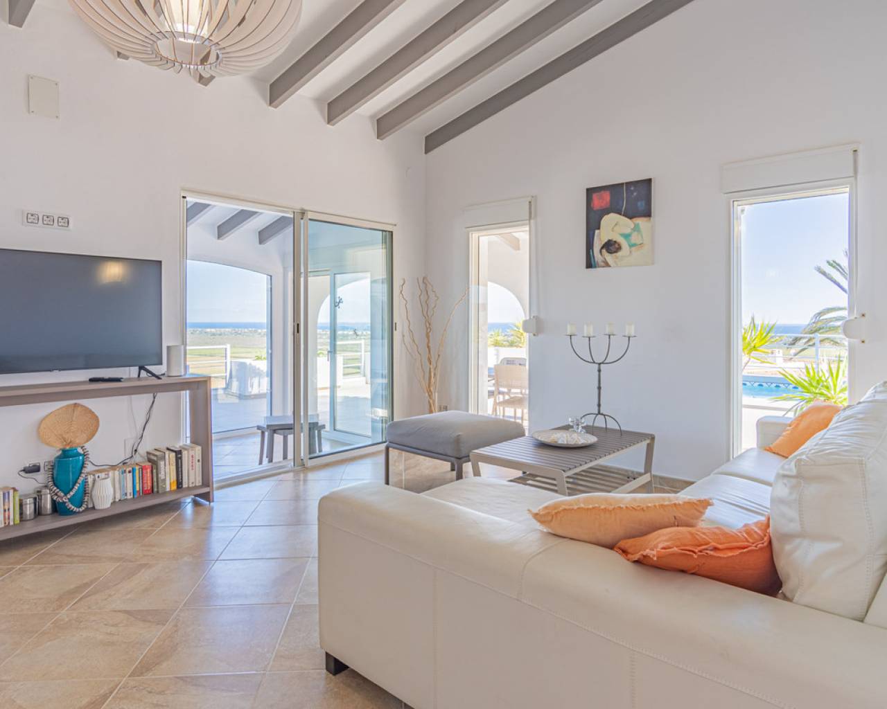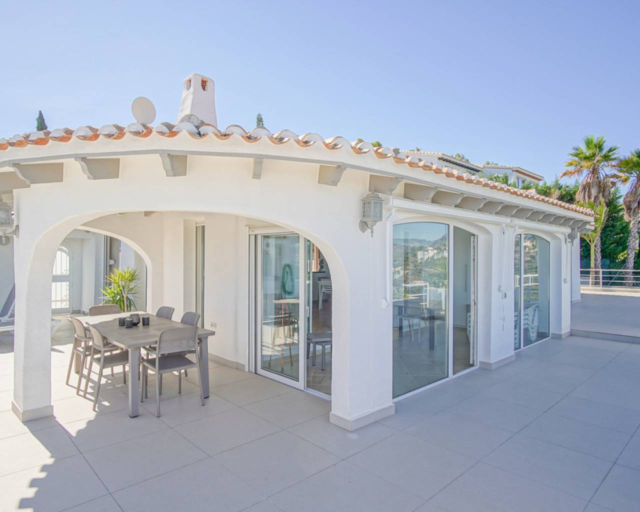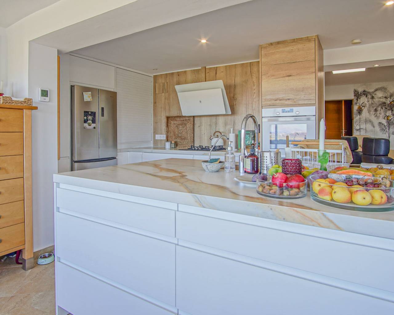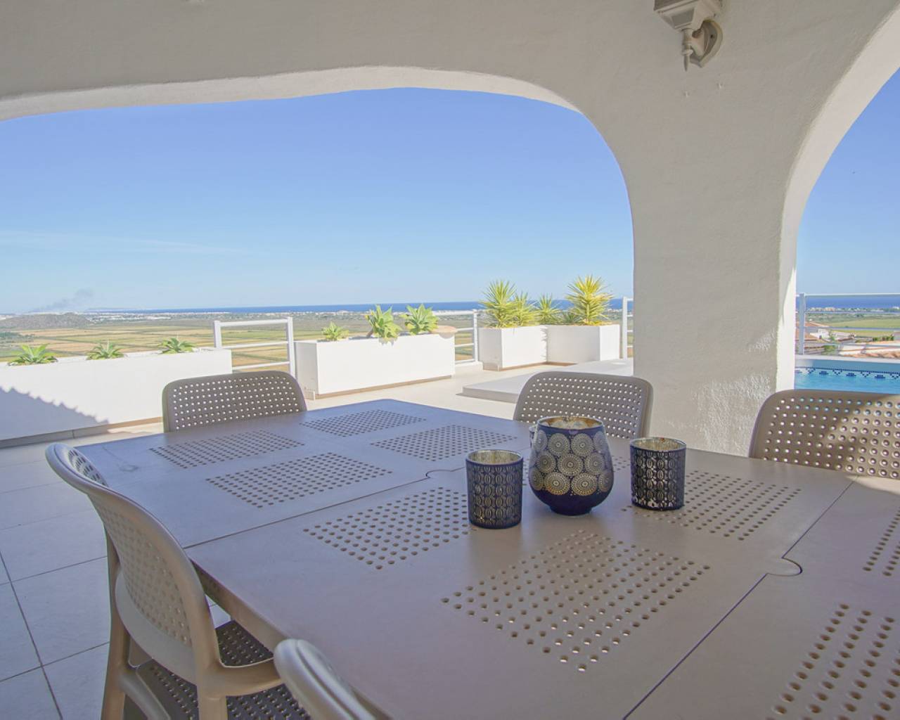 Located in the privileged area of Montepego, this stunning Mediterranean style villa, modernised in 2022, offers unrivalled panoramic views of the sea, the mountains and the Marjal Natural Park. Designed to combine traditional elegance with modern comfort, this property is the perfect place to enjoy coastal living in a unique setting. Entering through the carport, equipped with an electric car charging point, you will be greeted by an entrance level that is laid out in a comfortable and functional way, without the need for stairs. Here you will find a spacious living room and a modern kitchen, both with large windows that allow you to enjoy the spectacular views. On this floor, you will find two bedrooms and a master bedroom with en-suite bathroom; all rooms have direct access to the terrace, providing a continuous connection to the outside and a bright and welcoming atmosphere. The naya, a covered outdoor space ideal for relaxing, invites you to enjoy the Mediterranean climate while contemplating the sea and the private swimming pool, with the perfect barbecue area for family gatherings or with friends. A second independent living area is accessed via external stairs. This area has a living room with an open kitchen and panoramic windows, accompanied by an automatic pergola that allows you to enjoy the outdoors at any time of the day. In addition, there are two bedrooms with en-suite bathrooms, a laundry room and a storage room, offering additional space for independent living. The exterior of the villa is completed with a well-kept Mediterranean garden and several terraces from where you can enjoy the landscape that surrounds the property. Its excellent location allows access in just a few minutes to the beaches of Las Marinas or Deveses in Denia, as well as to shopping centres in Ondara and El Vergel, and the prestigious Oliva Nova Golf Resort. The cities of Alicante and Valencia are only an hour's drive away, making it easy to commute to the main urban centres. With ample space to comfortably accommodate two families, this villa is ideal for those who enjoy entertaining guests. A property that combines luxury, comfort and an unbeatable location on the Costa Blanca.